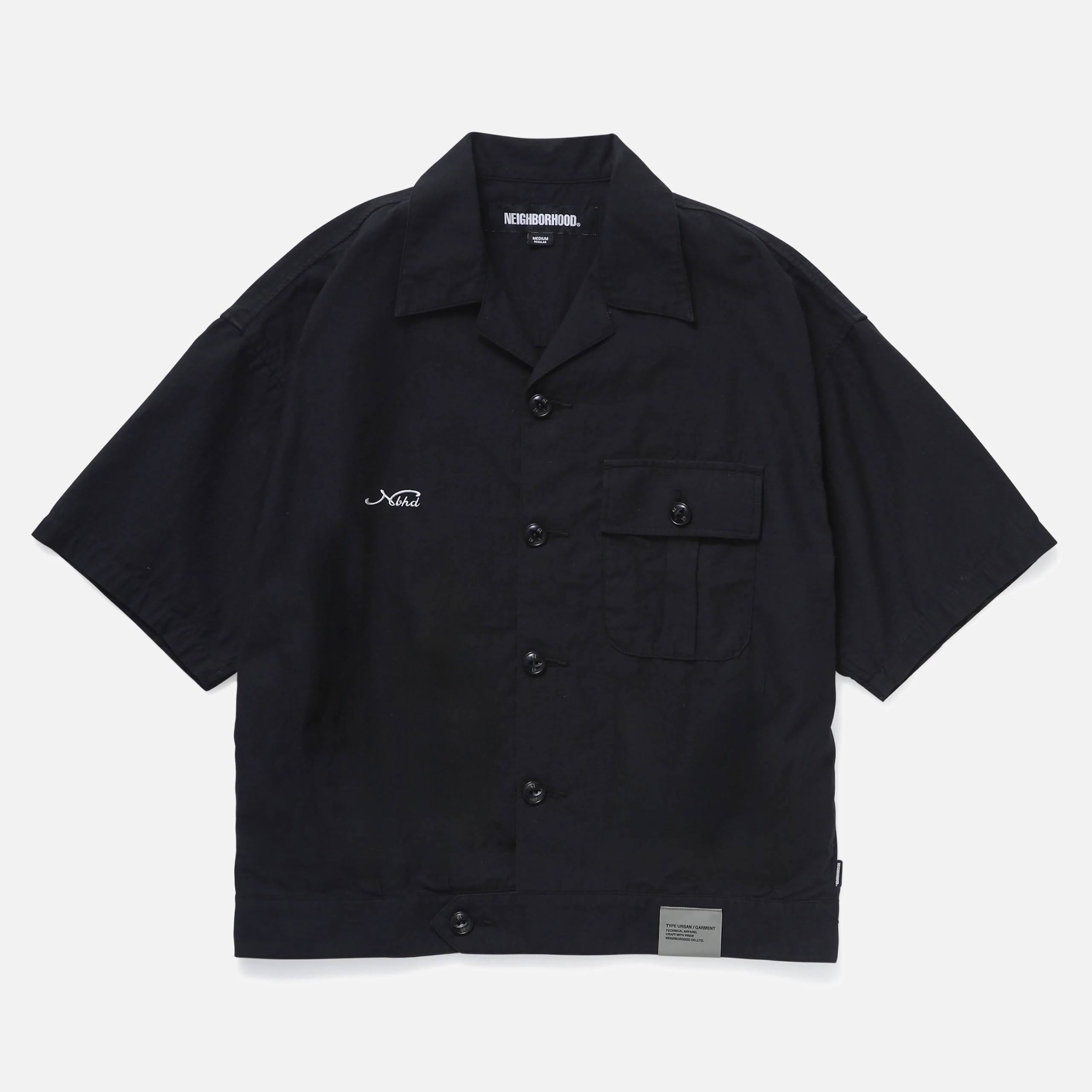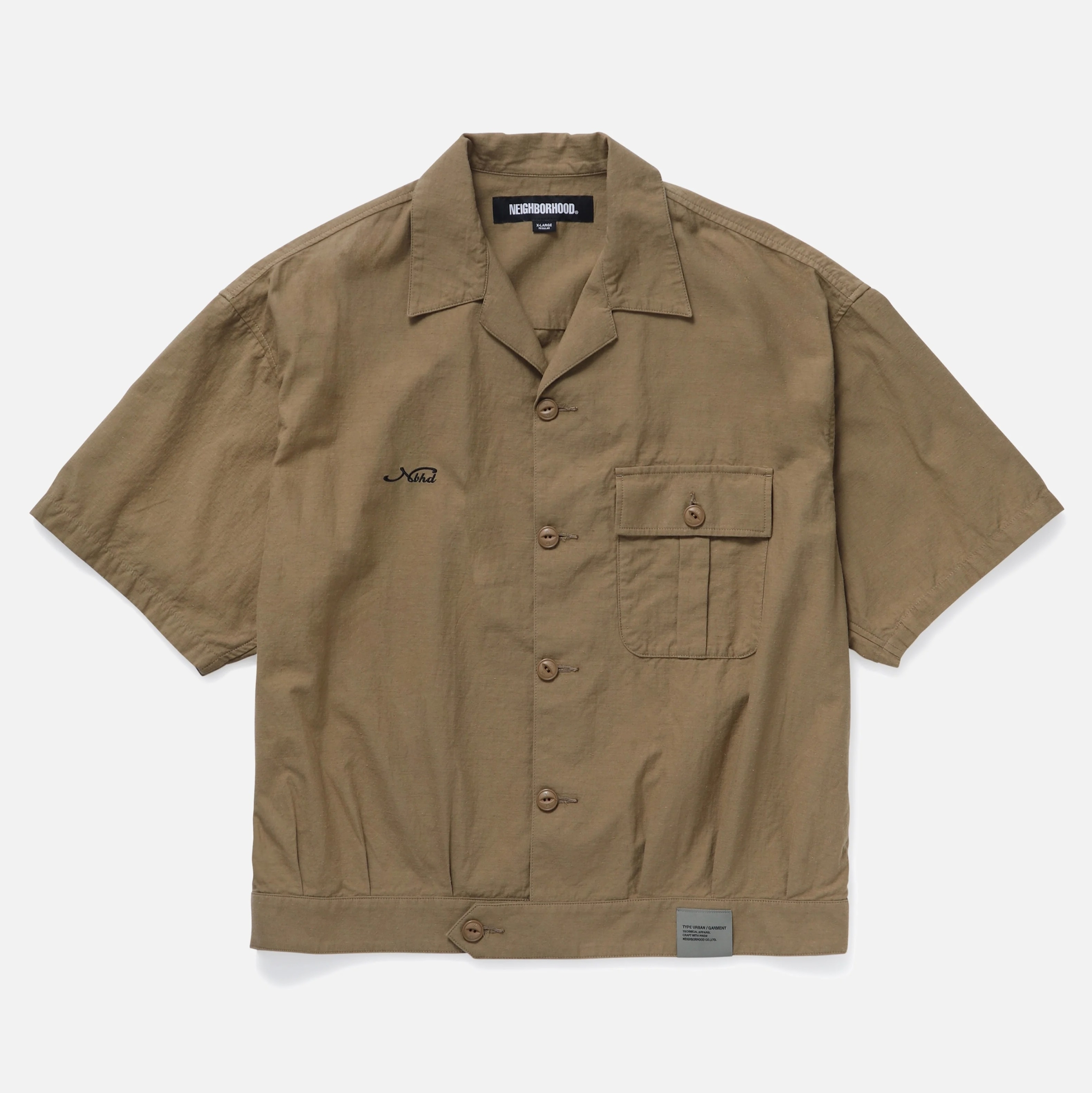 裾部分にタックとベルトディティールを施したオープンカラーのミリタリーシャツ。綿と麻の交織素材のため、厚手でありながら柔らかさのある綿麻バックサテン生地を使用。右胸にロゴを刺繍。左裾にネームタグ、サイドシームにピスネームを付属。COTTON80, LINEN20 ワンウォッシュ。MODEL:184cm / SIZE:XL