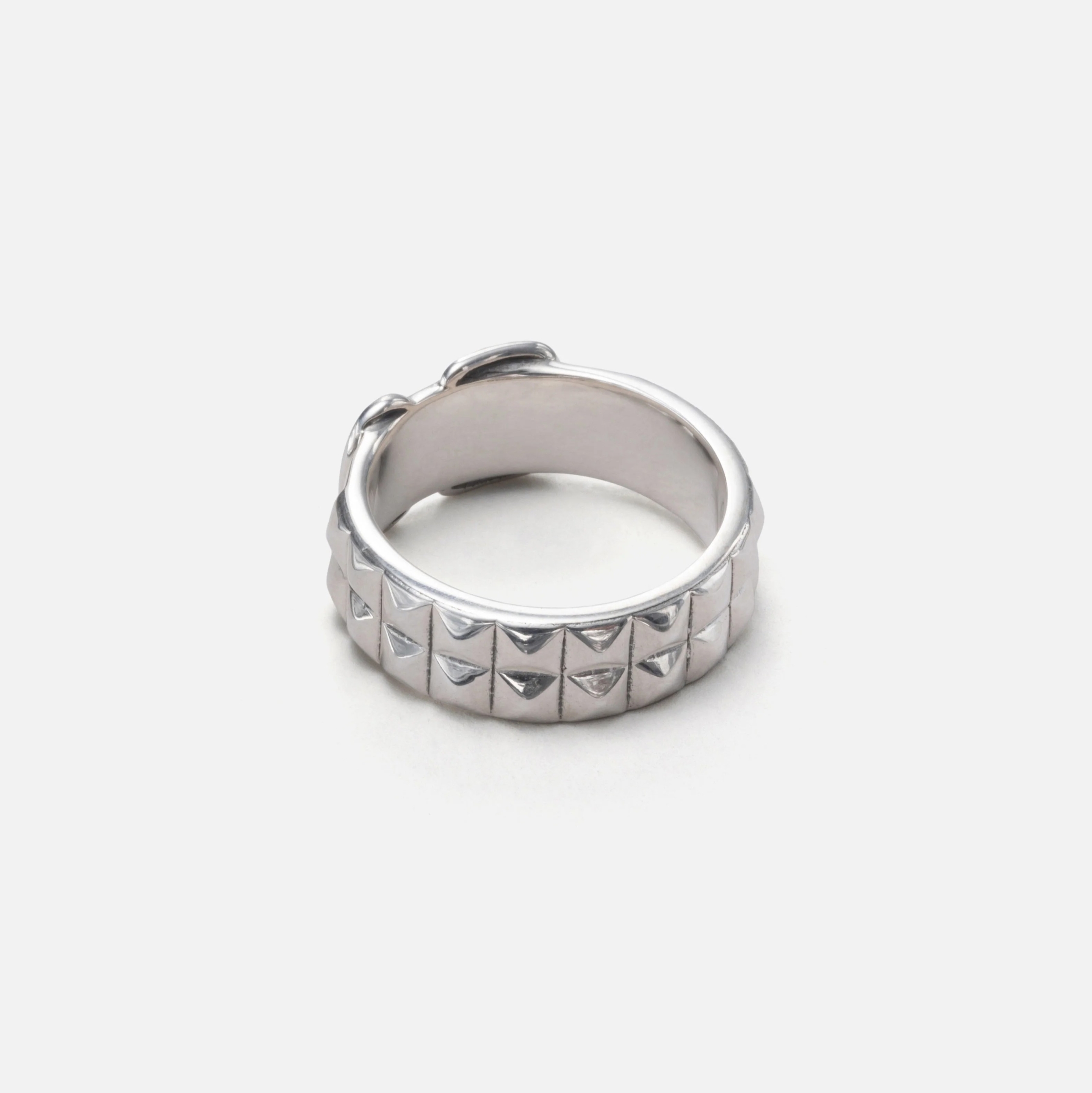 SV925素材を使用したピラミッド型スタッズベルトモチーフのシルバーリング。燻し銀加工仕上げ。内側にはロゴを刻印。MATERIAL: SILVER 925