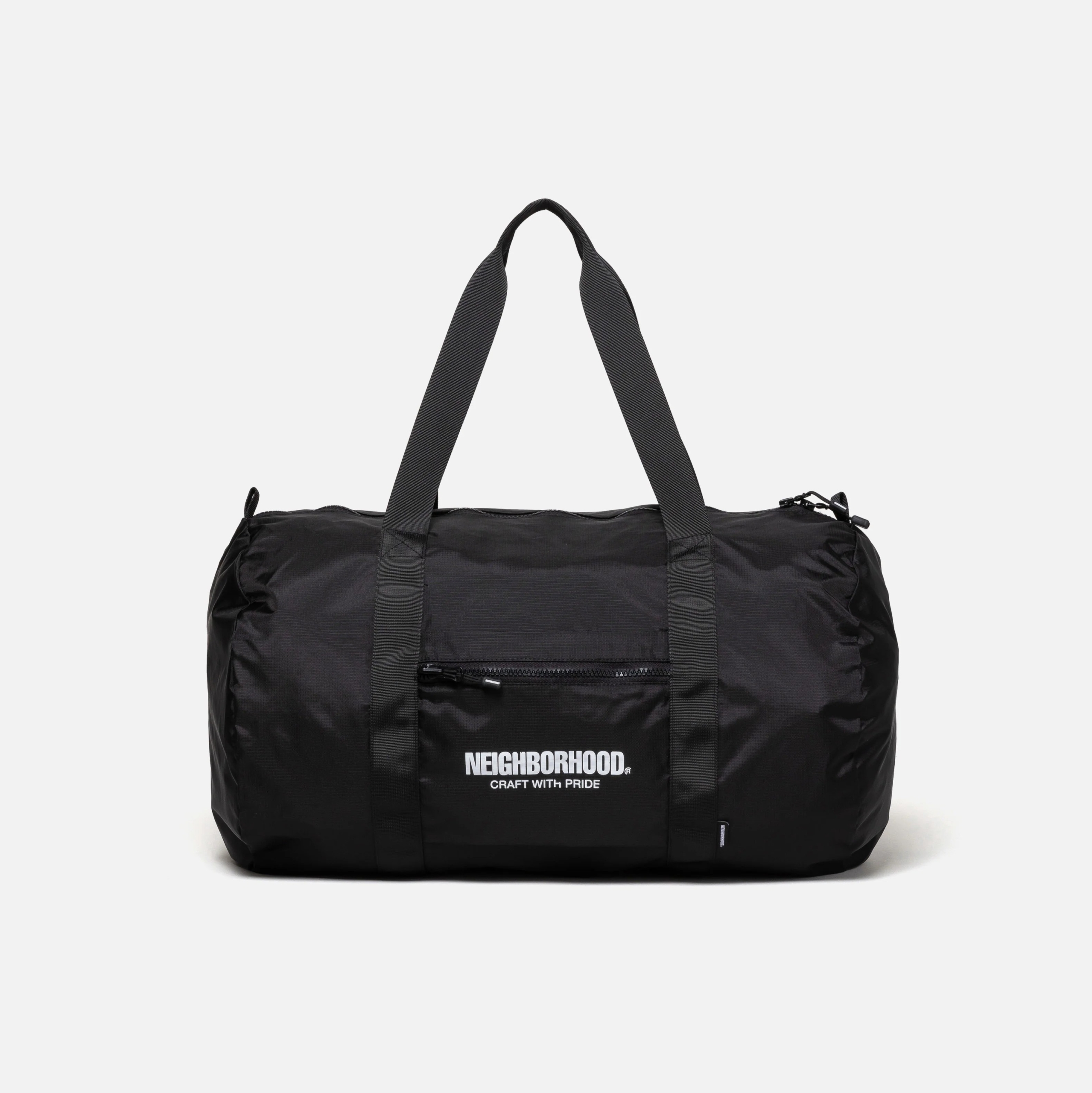 ナイロンリップストップ素材を使用したボストンバッグ。外側のポケットに収納可能なポケッタブル仕様。外側のポケットと本体の間にスーツケースの持ち手を通せるスリーブ付き。フロントにロゴをプリント。オリジナルのラバー製ファスナープルを採用し、ピスネームを付属。