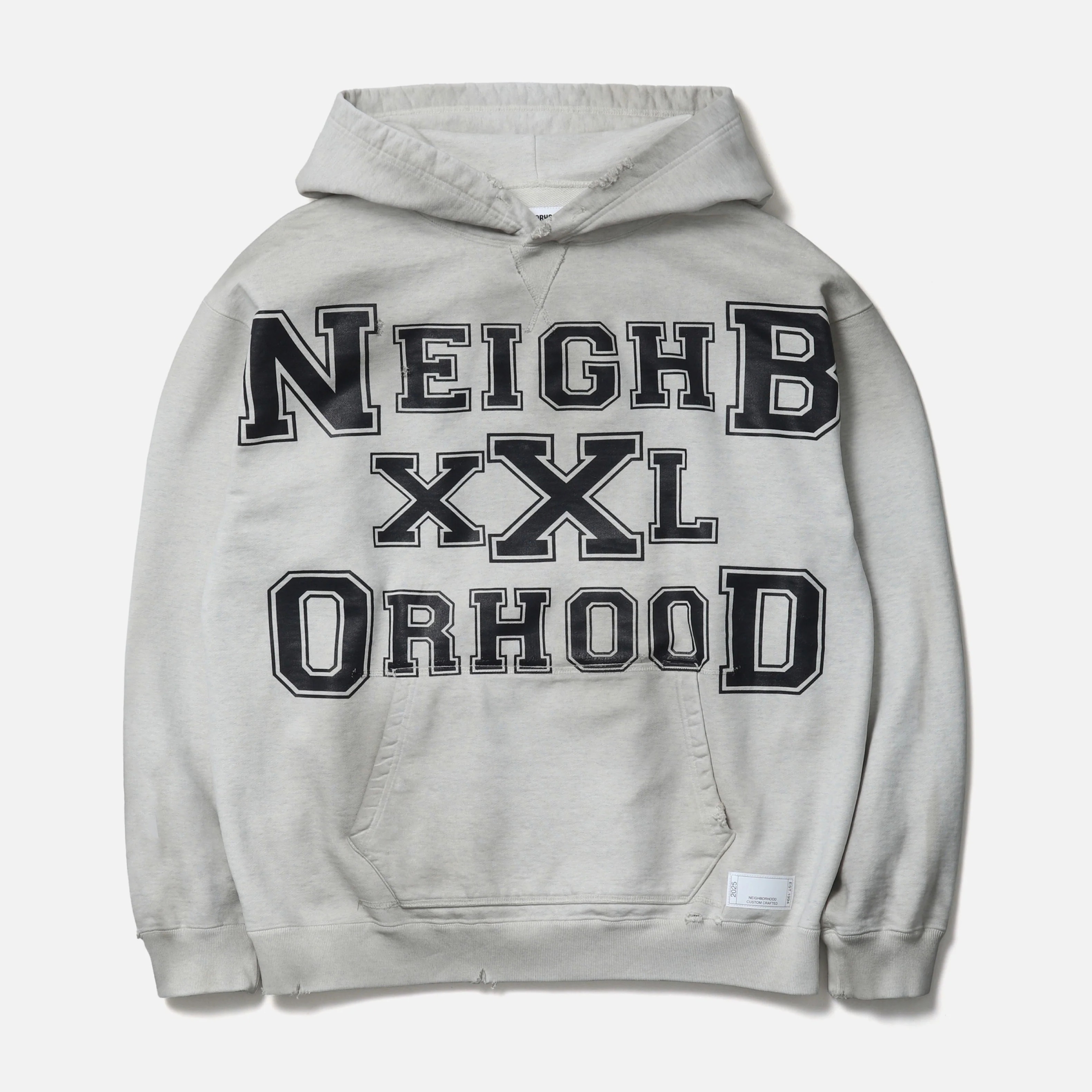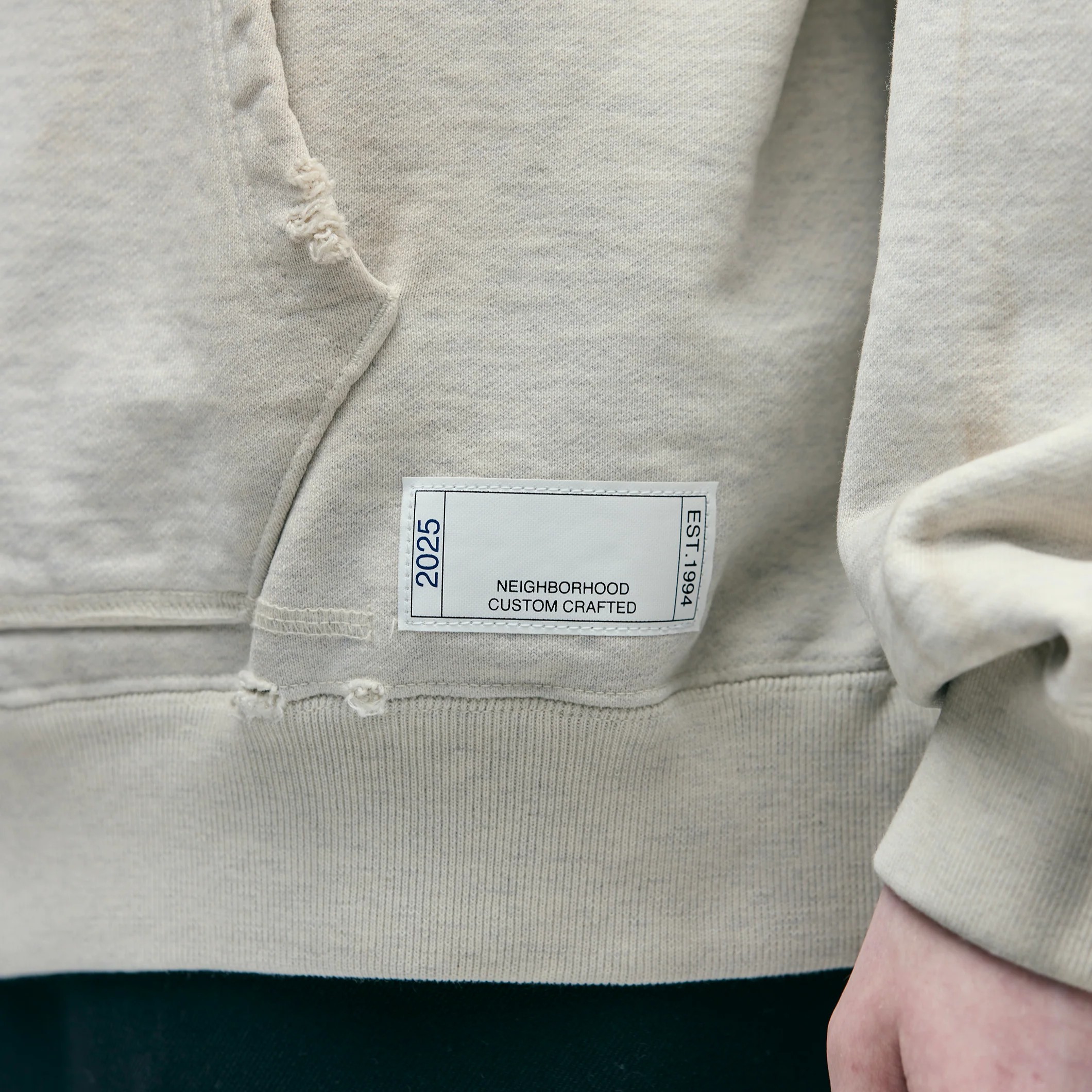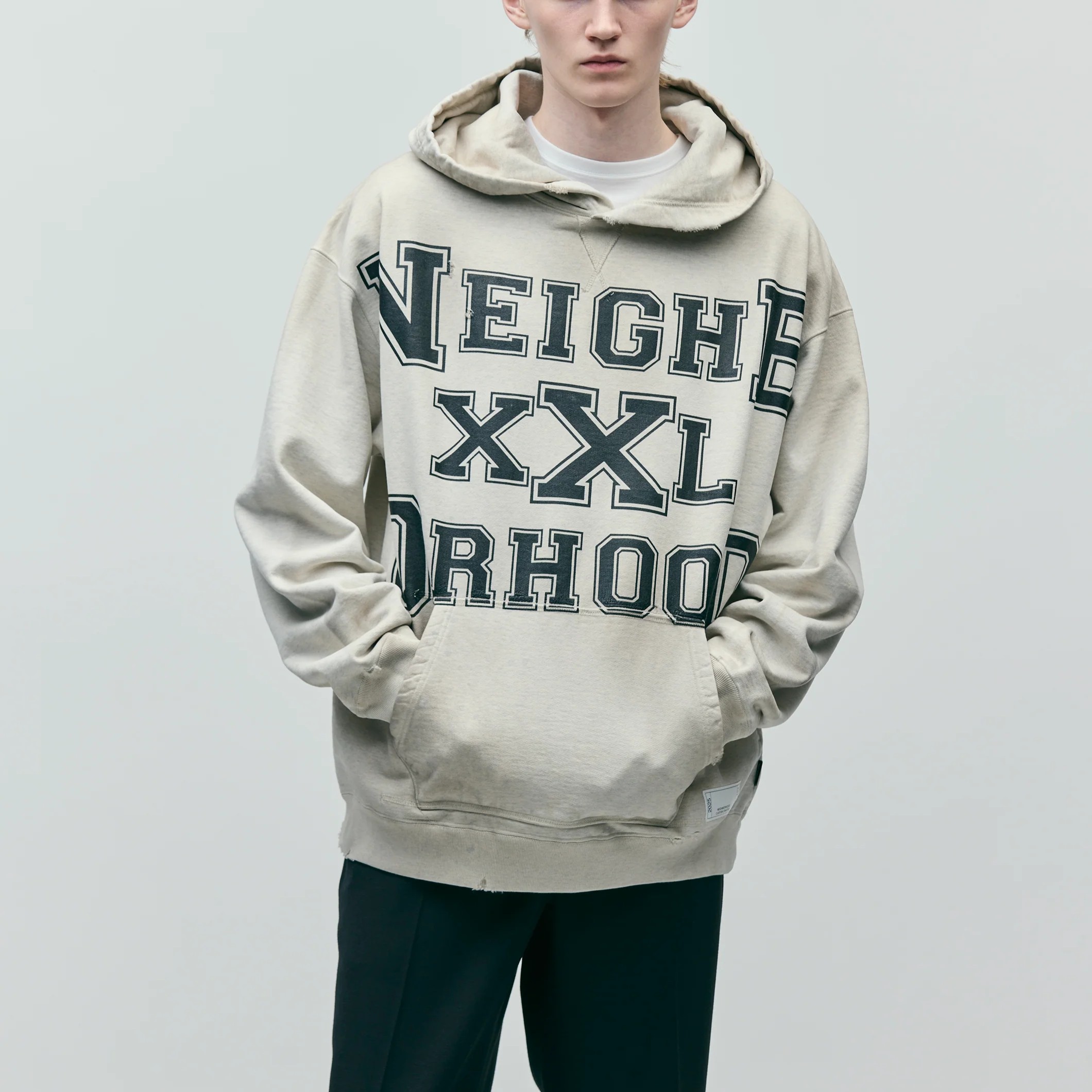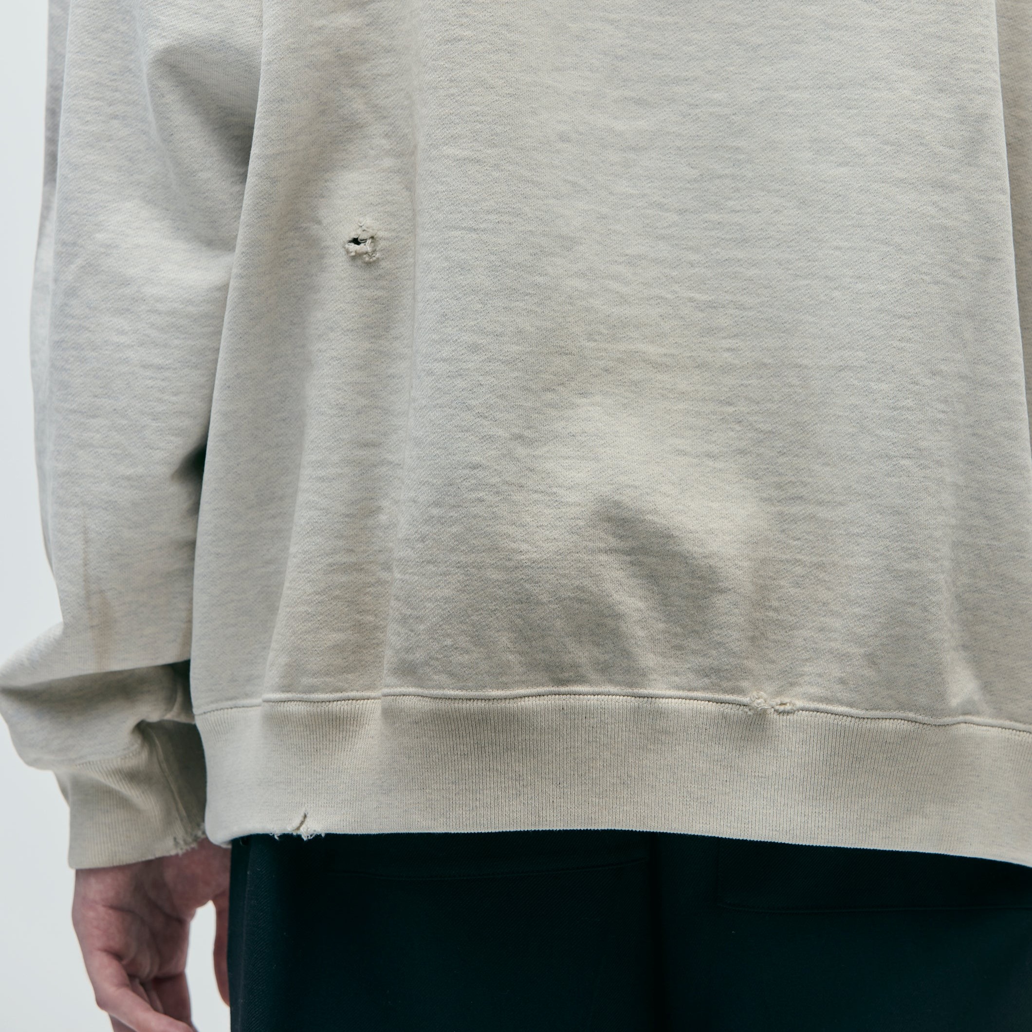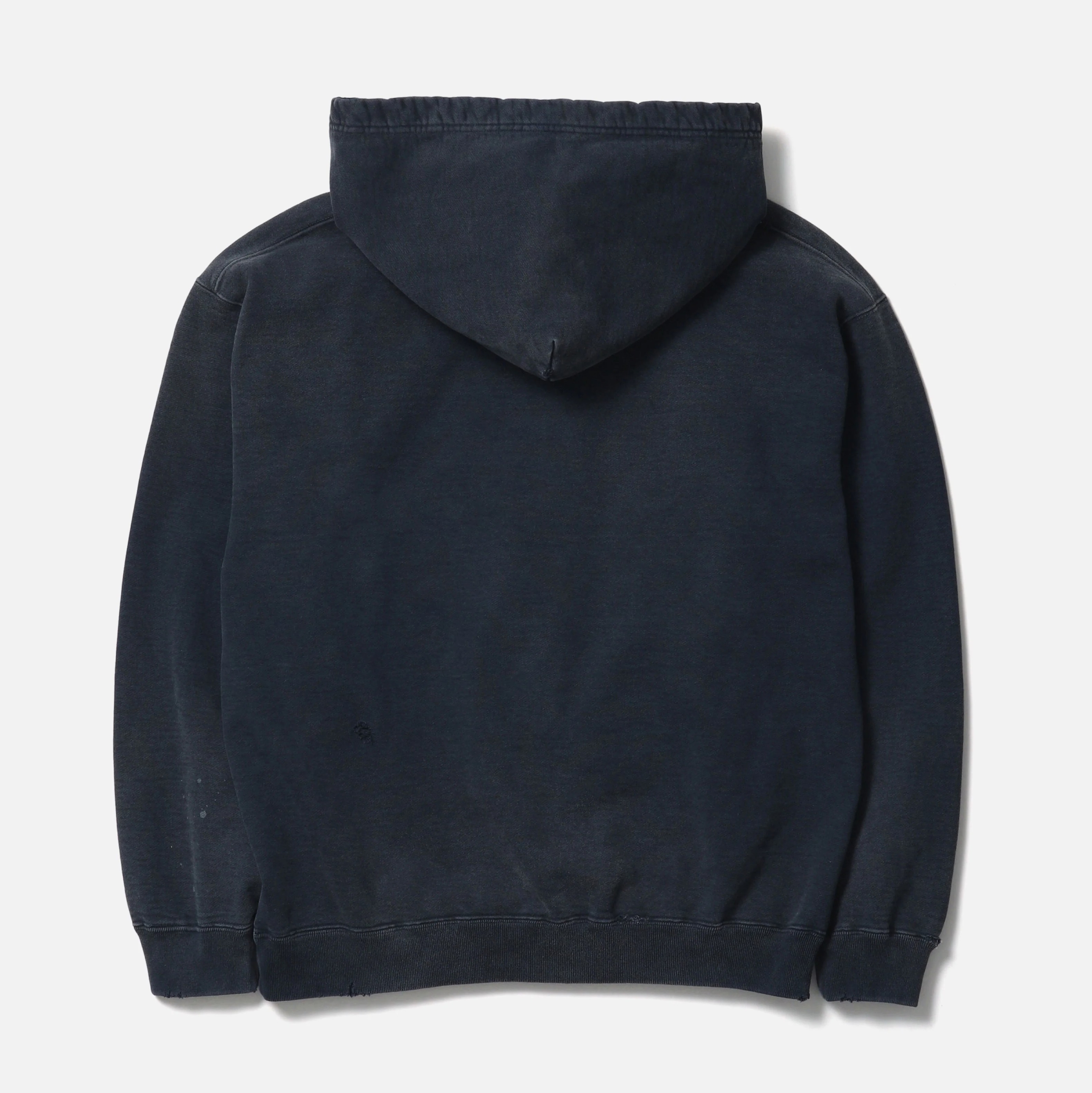 フェード感を出した度詰めの裏毛素材をベースに、サベージ加工を施したプルオーバーフーディ。 色落ち、ペンキドリップ、汚し、ダメージなどの複合加工を用いてリアルなエイジングを表現。フロントにグラフィックをプリント。サイドシームにピスネームを付属。MODEL:184cm / SIZE:XL