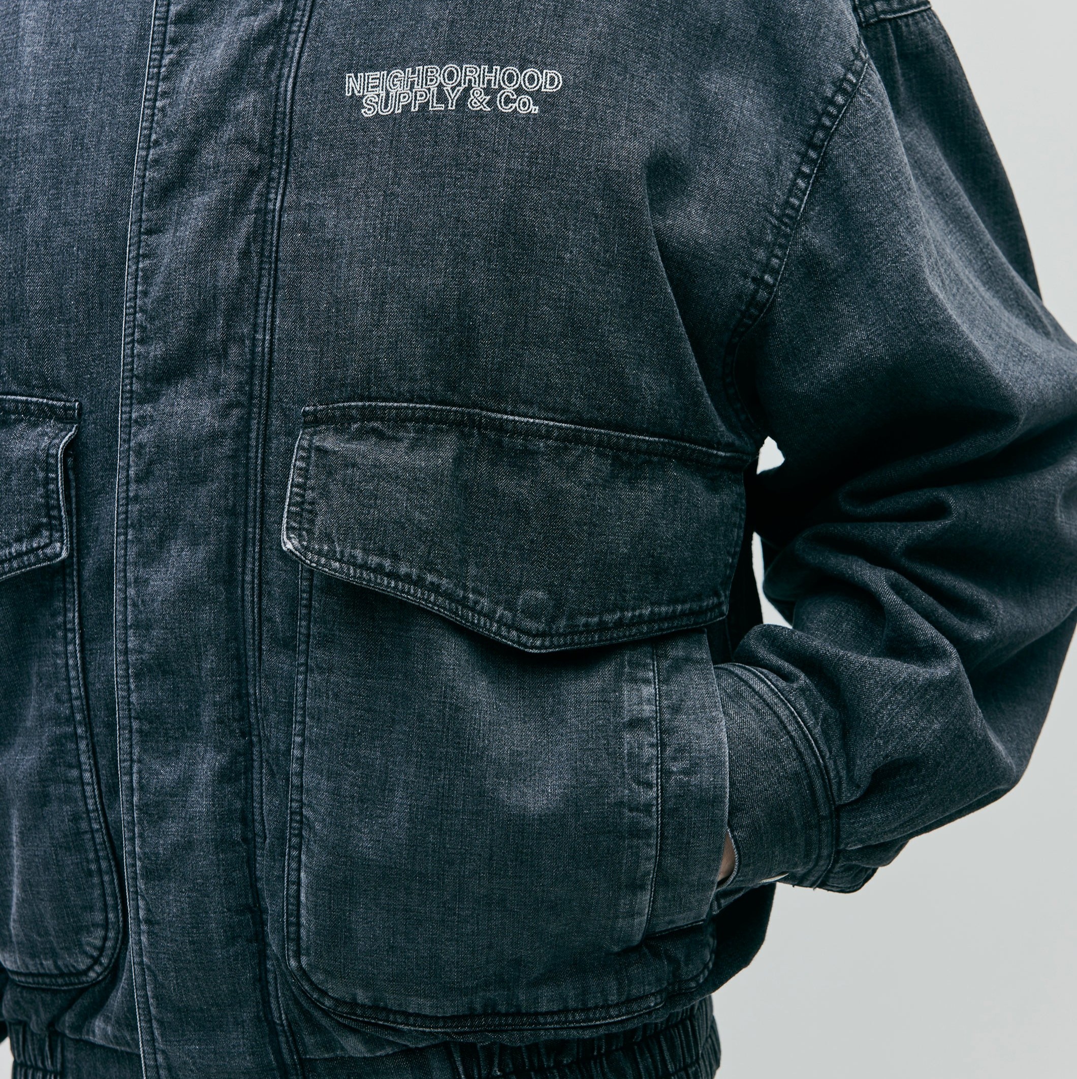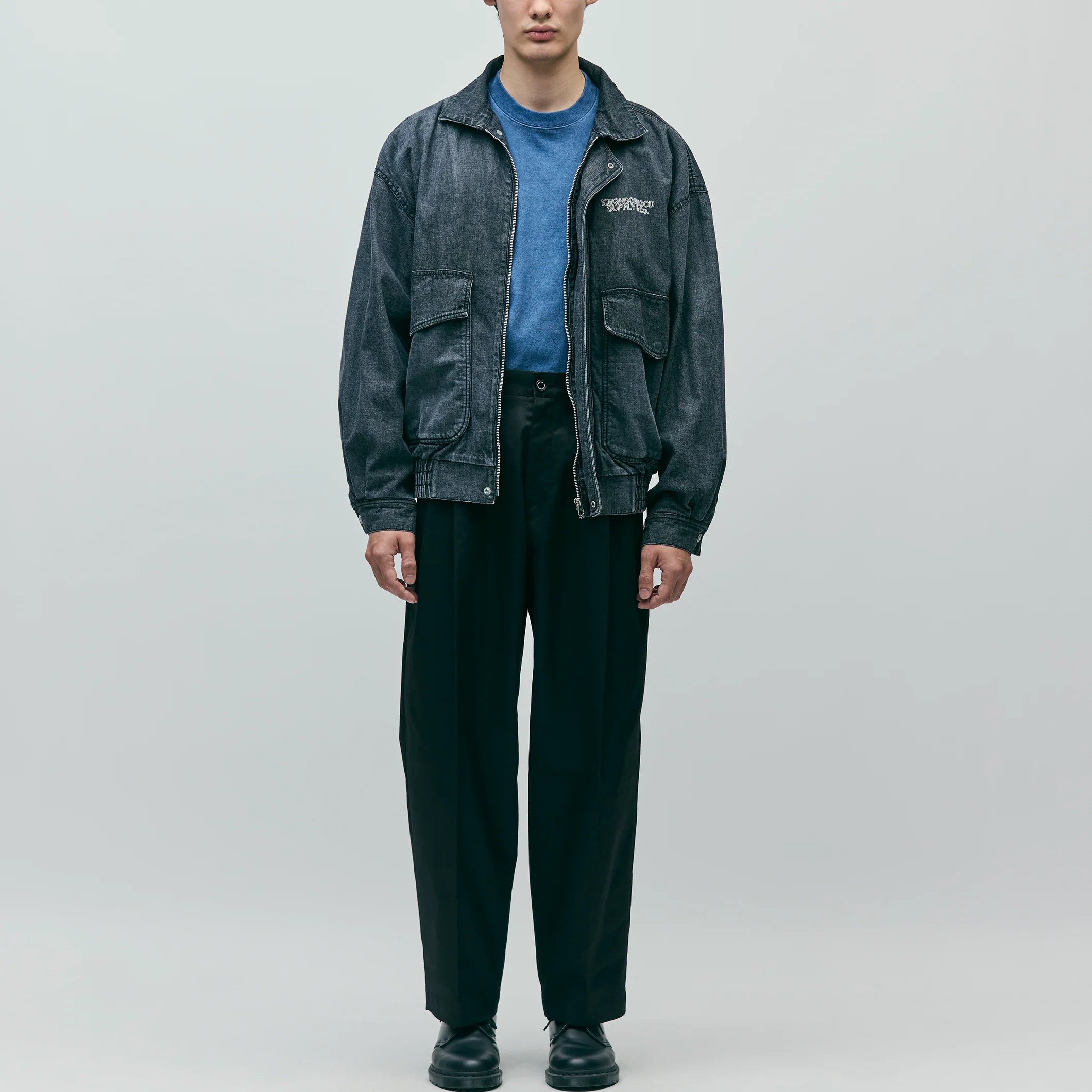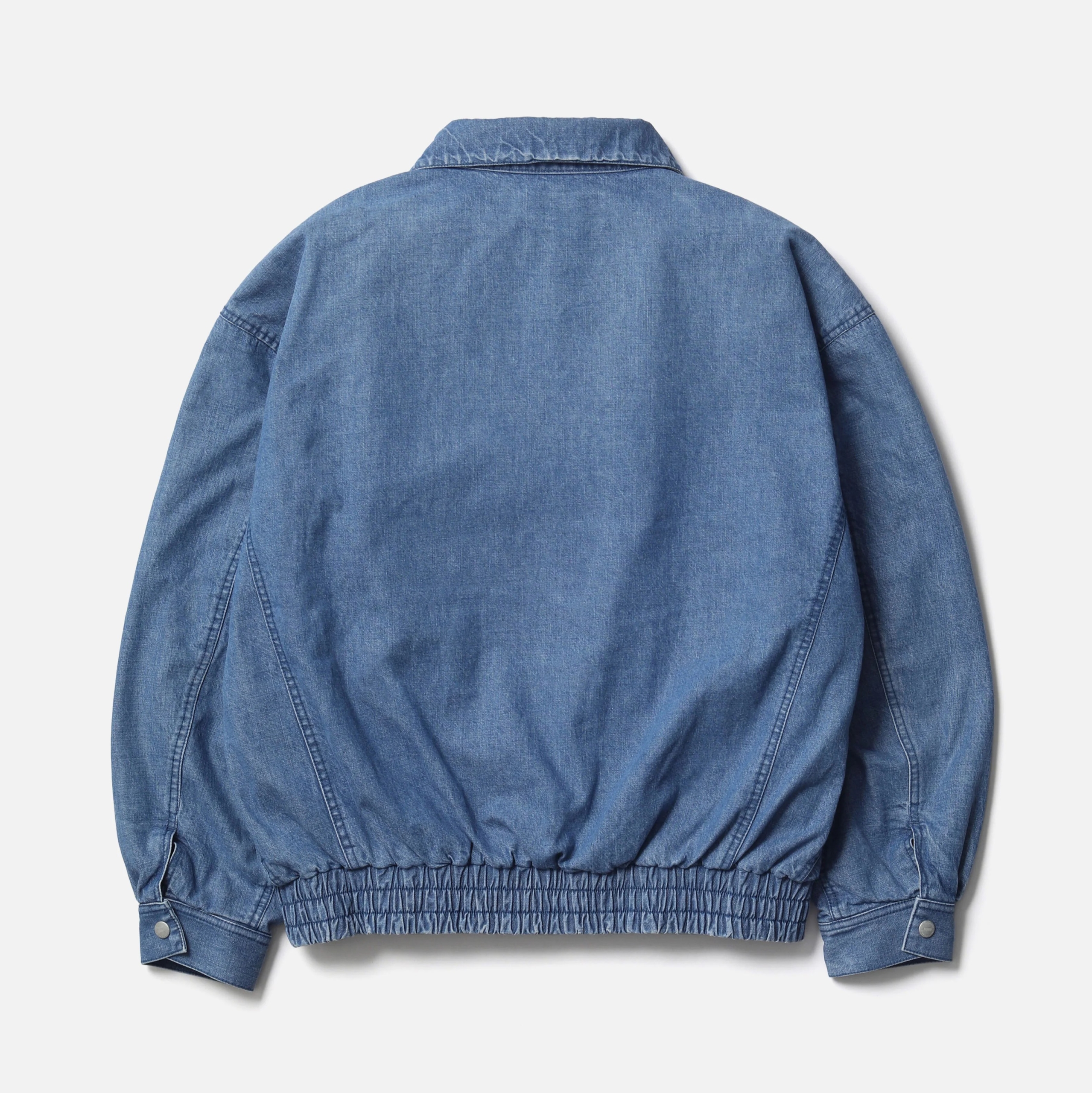 10ozムラ糸デニム生地をベースに、経年変化を表現するフェード加工を施したデニムブルゾン。フロントは、オリジナルの刻印入りスナップボタンとファスナーによる開閉。両サイドに、上部と側面の両方向から使用できるフラップポケットを配置。裾はゴム入りシャーリング仕様。左胸にロゴを刺繍。サイドシームにピスネームを付属。MODEL:183cm / SIZE:M