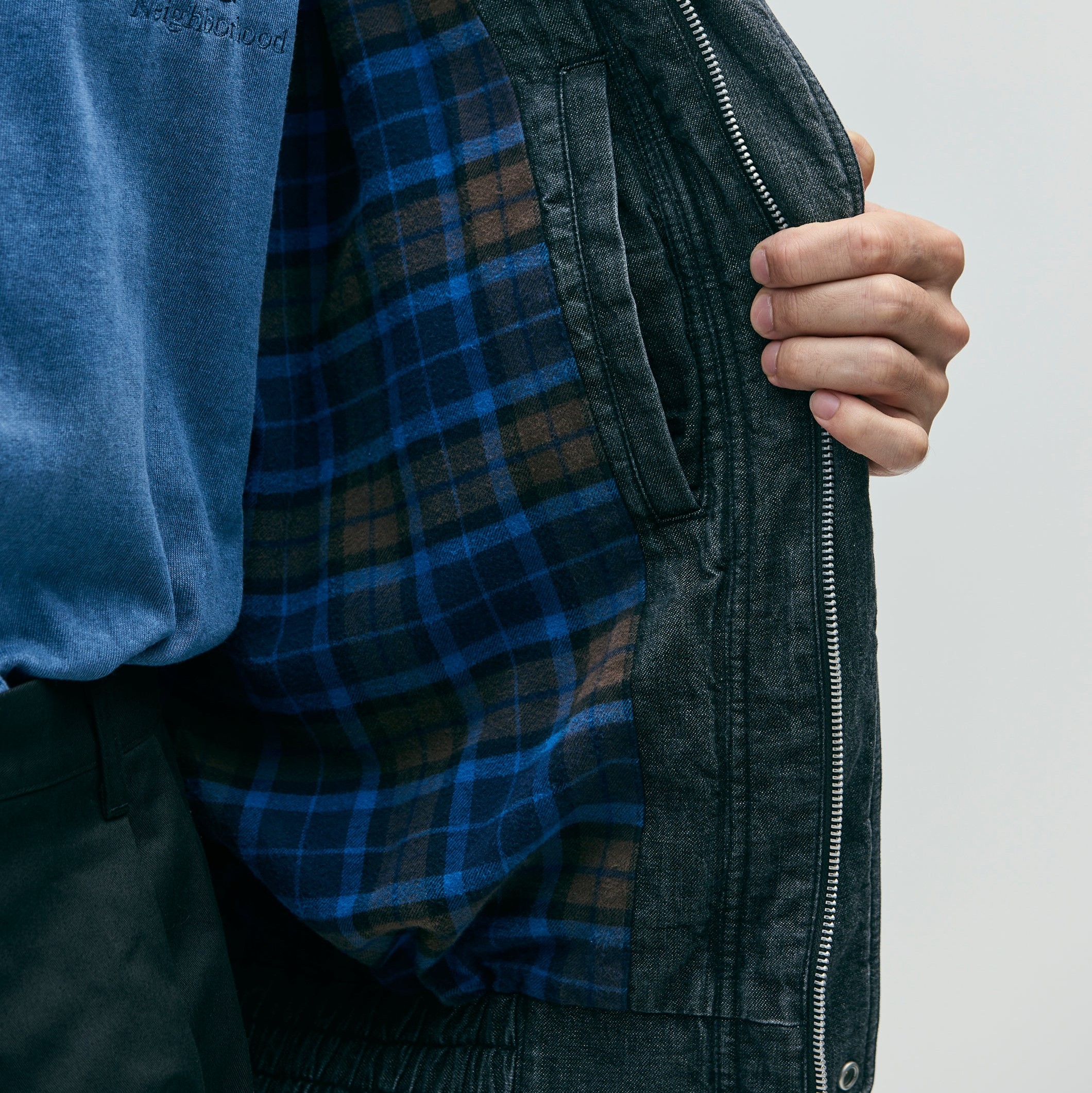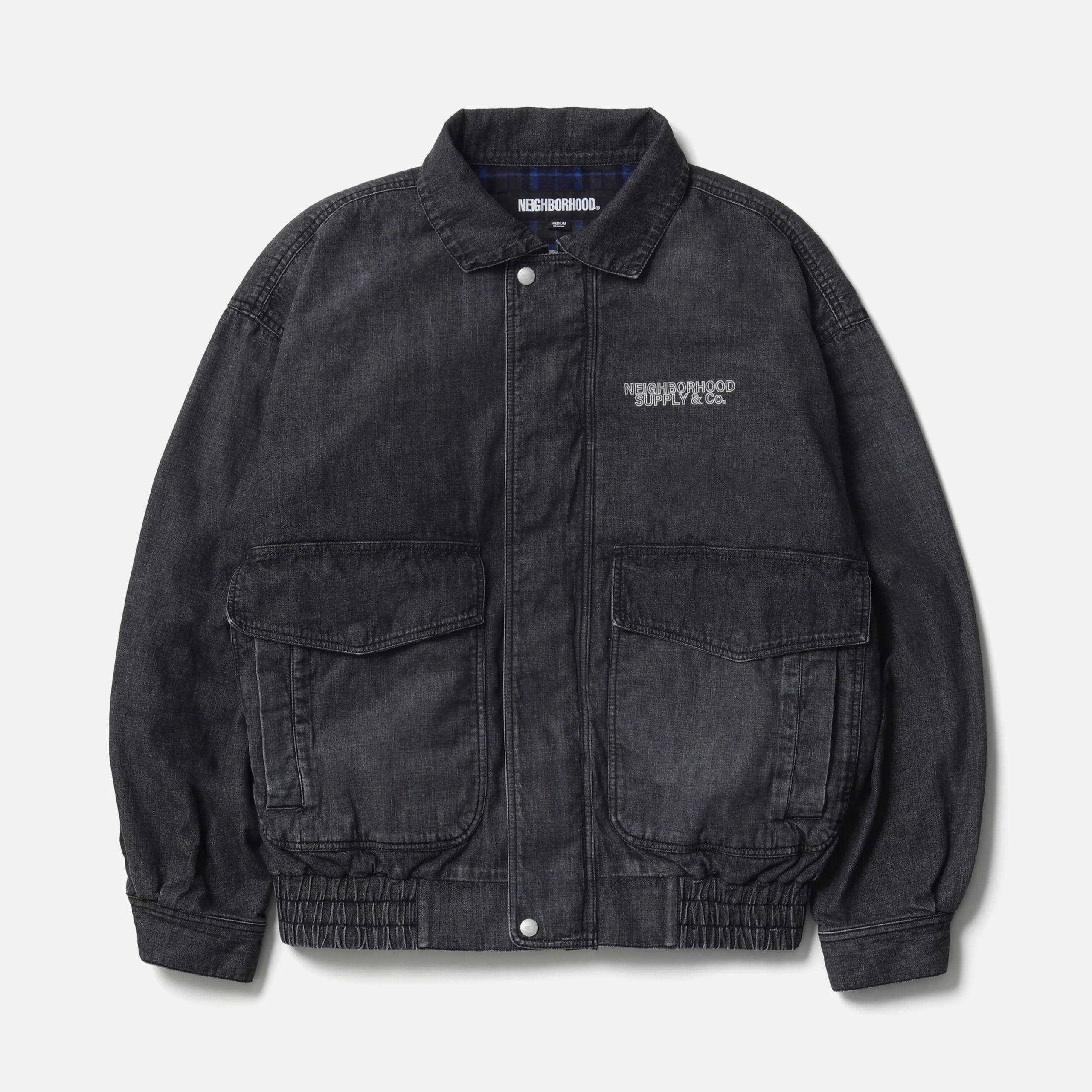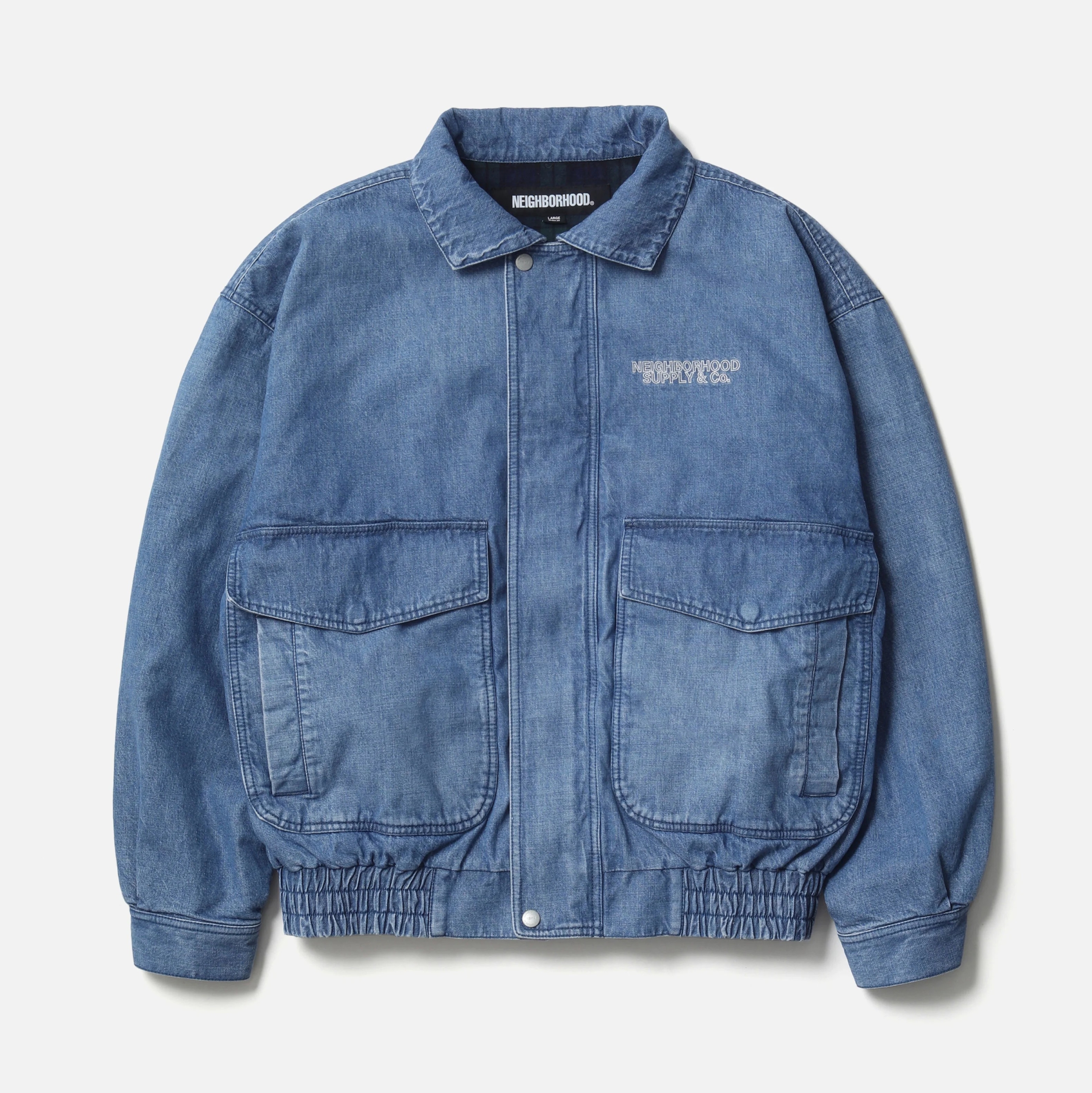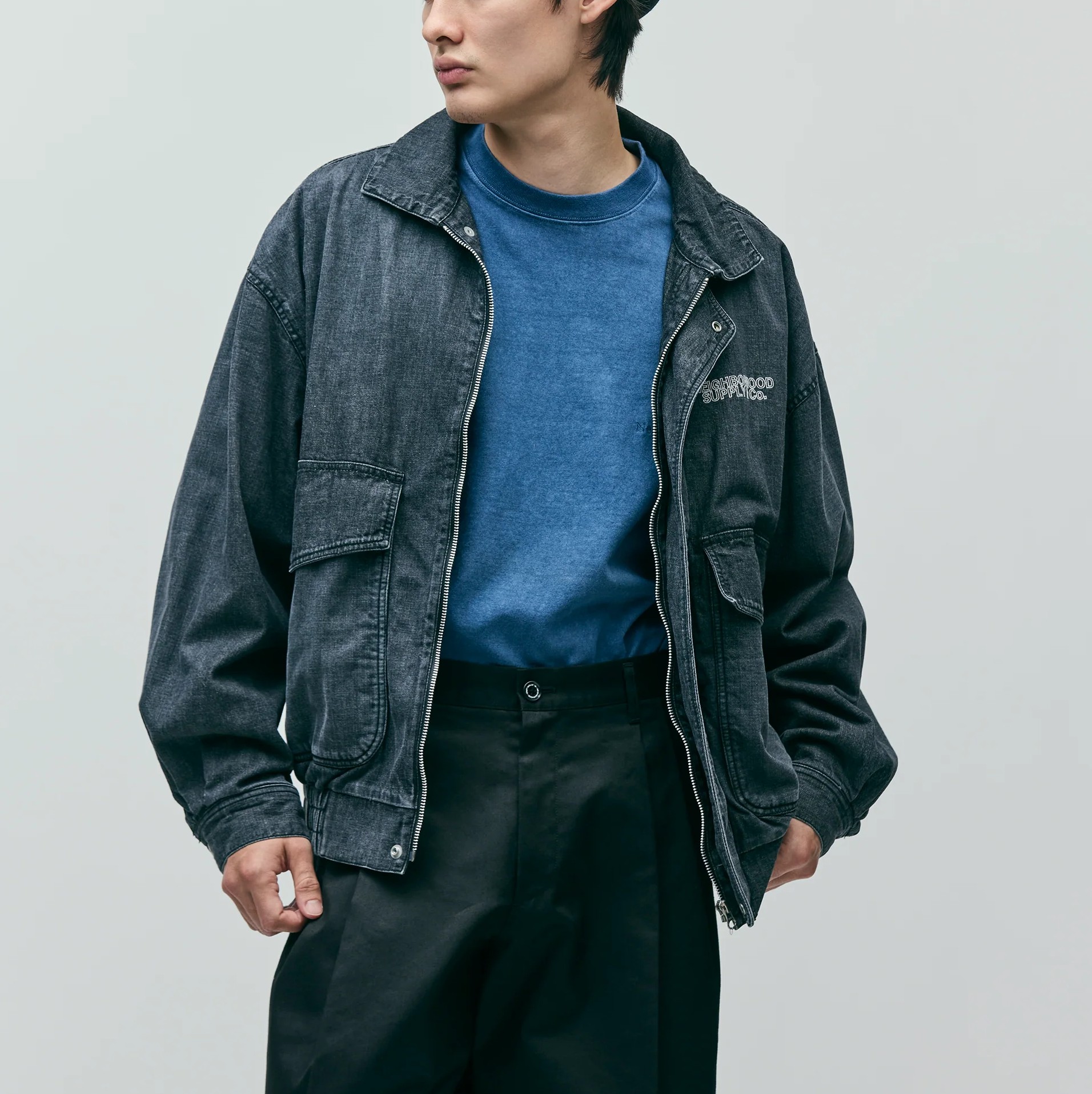 10ozムラ糸デニム生地をベースに、経年変化を表現するフェード加工を施したデニムブルゾン。フロントは、オリジナルの刻印入りスナップボタンとファスナーによる開閉。両サイドに、上部と側面の両方向から使用できるフラップポケットを配置。裾はゴム入りシャーリング仕様。左胸にロゴを刺繍。サイドシームにピスネームを付属。MODEL:183cm / SIZE:M