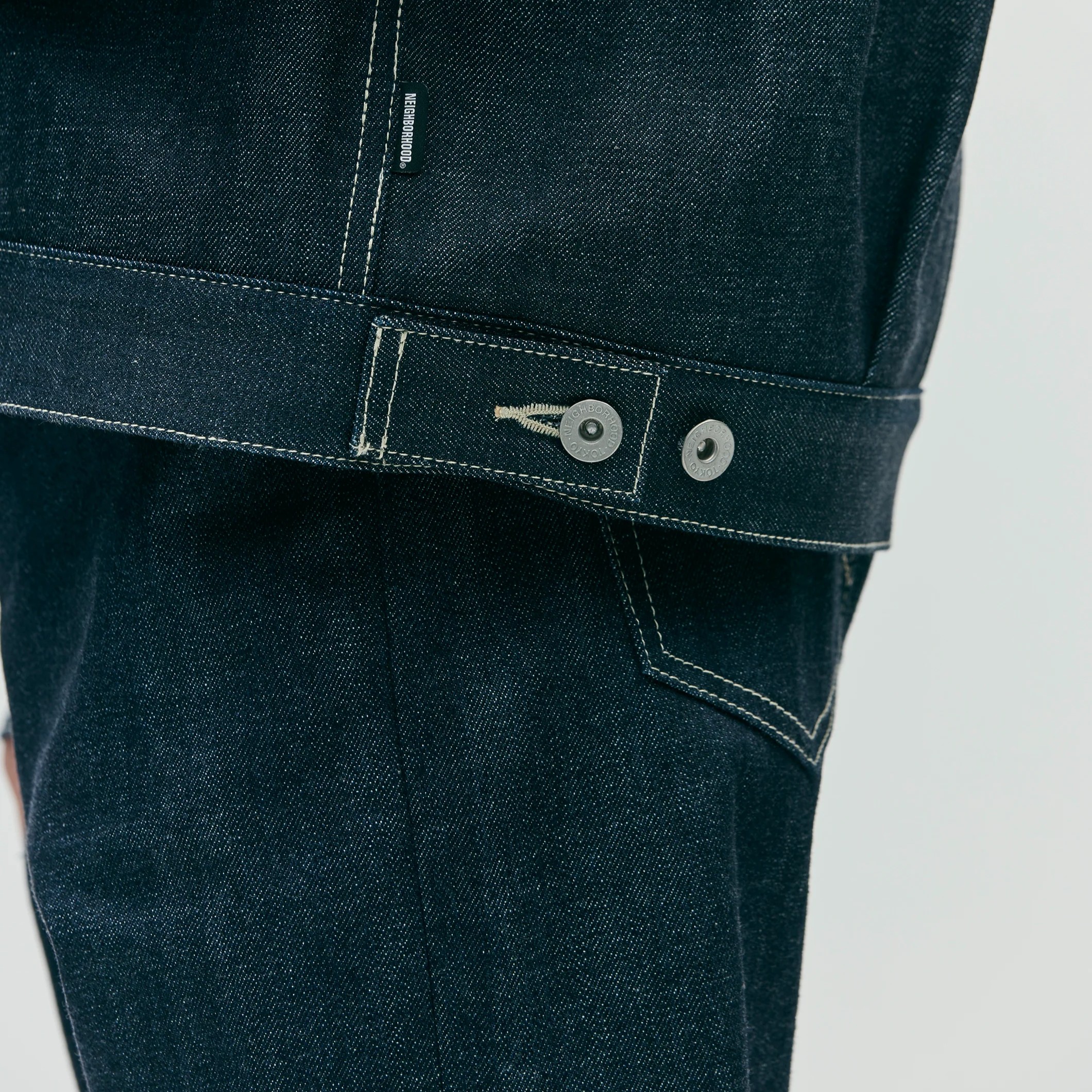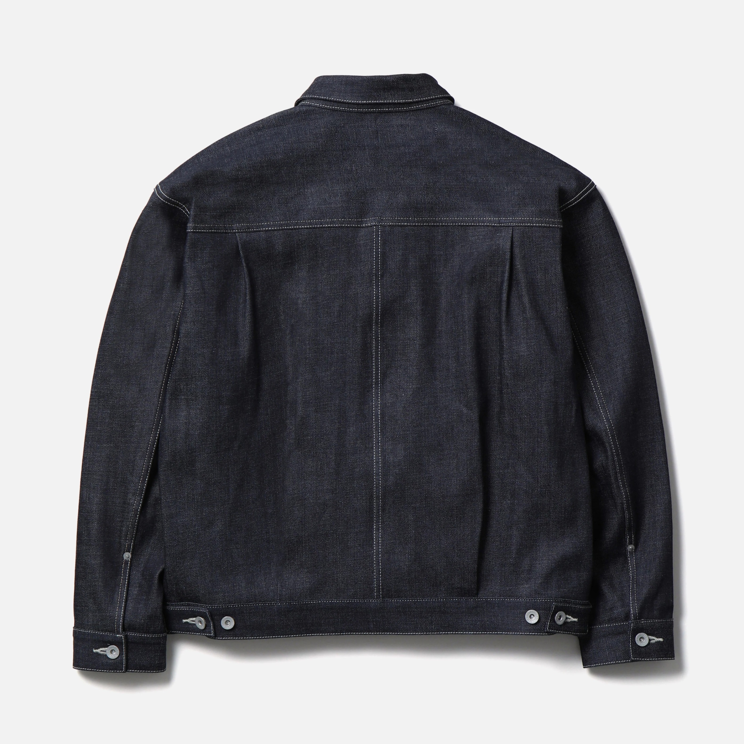 オリジナルの12ozデニム生地を使用した2ndタイプのリジッドデニムジャケット。プリーツ入りのフロントデザイン、左右対称のフラップ付きポケット、アジャストボタン付きの裾ベルトなど、クラシカルなディテールを踏襲。配色ステッチを施し、オリジナルのタックボタンとリベットを採用。サイドシームにピスネームを付属。MODEL:184cm / SIZE:L
