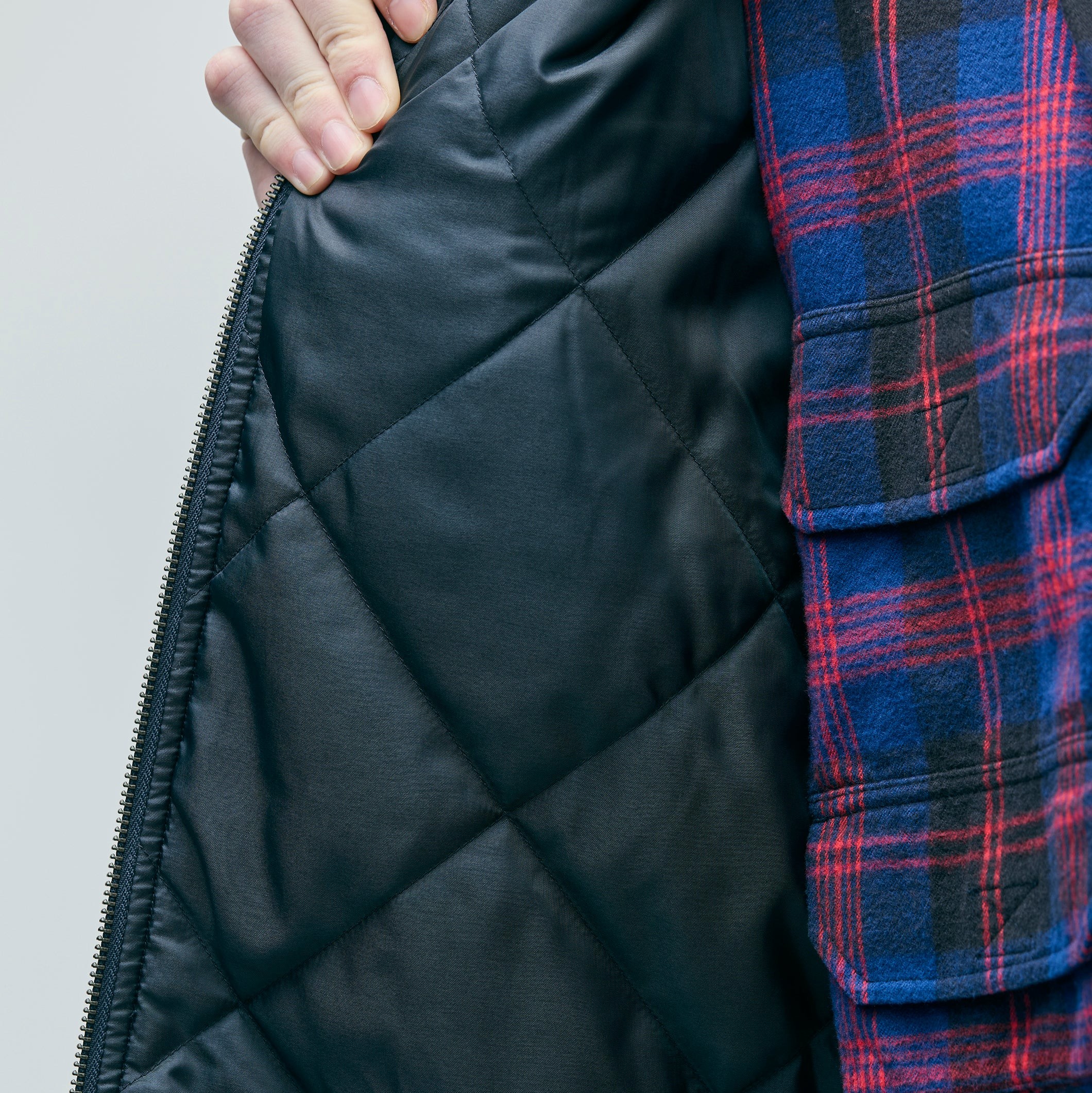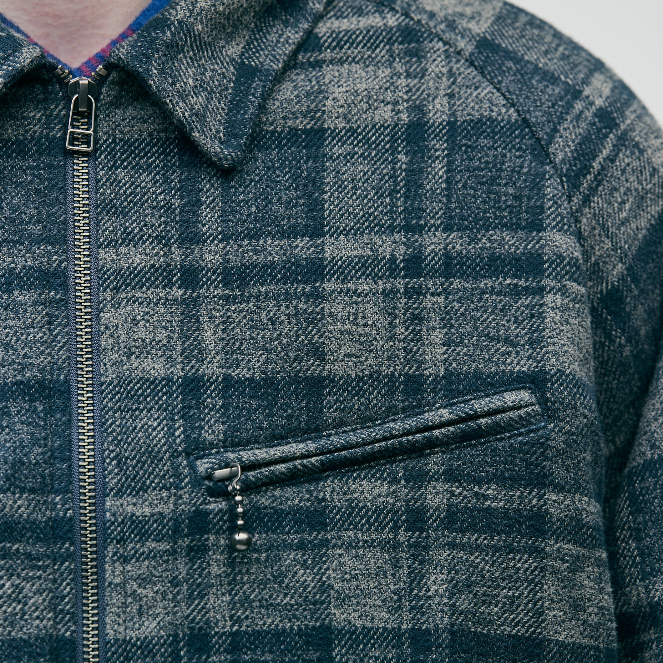 暖かみのある配色のコットンチェック生地を使用したジップワークジャケット。両サイドにファスナーテープを見せた箱ポケットを配置。袖口はタブ付きの剣ボロ仕様。裏地にはダイヤキルティングを採用。サイドシームにピスネームを付属。MODEL:184cm / SIZE:L