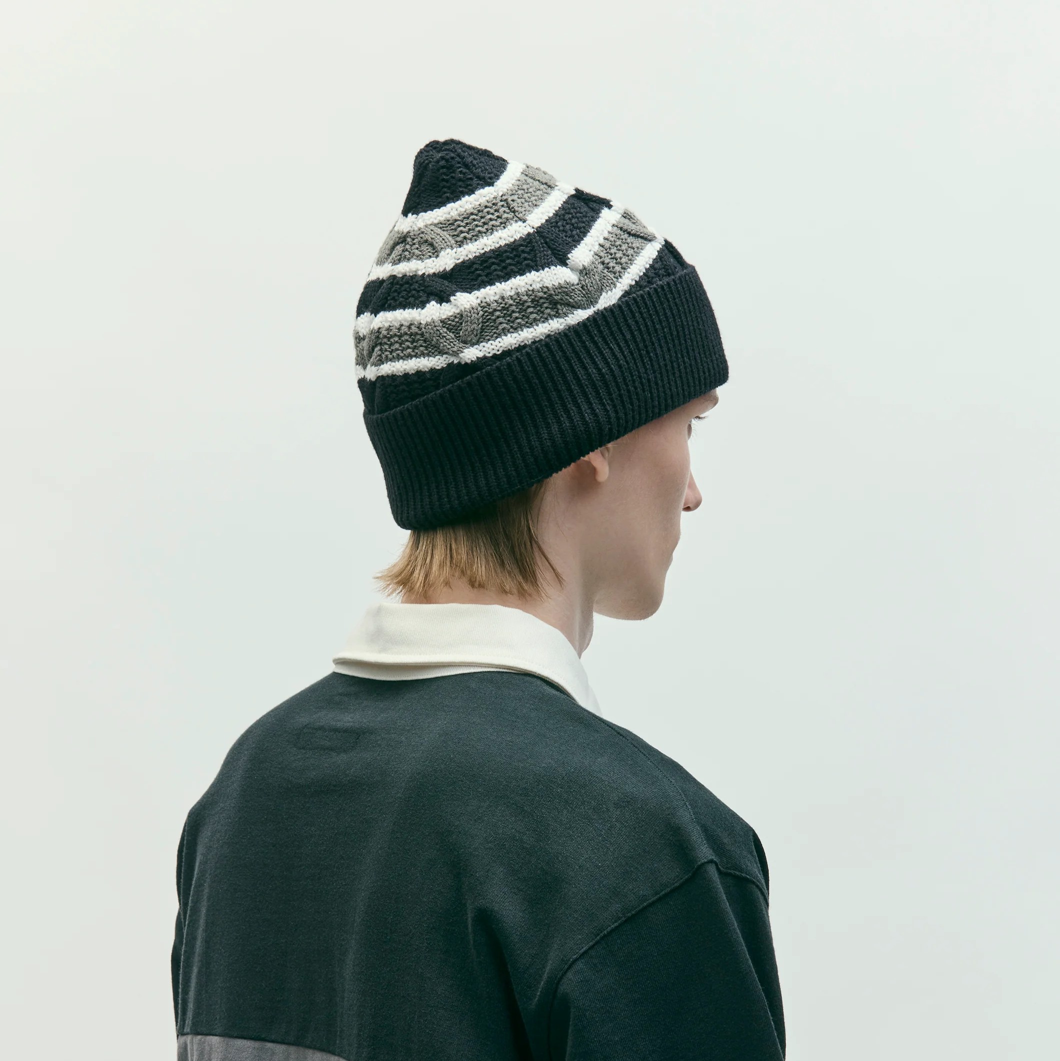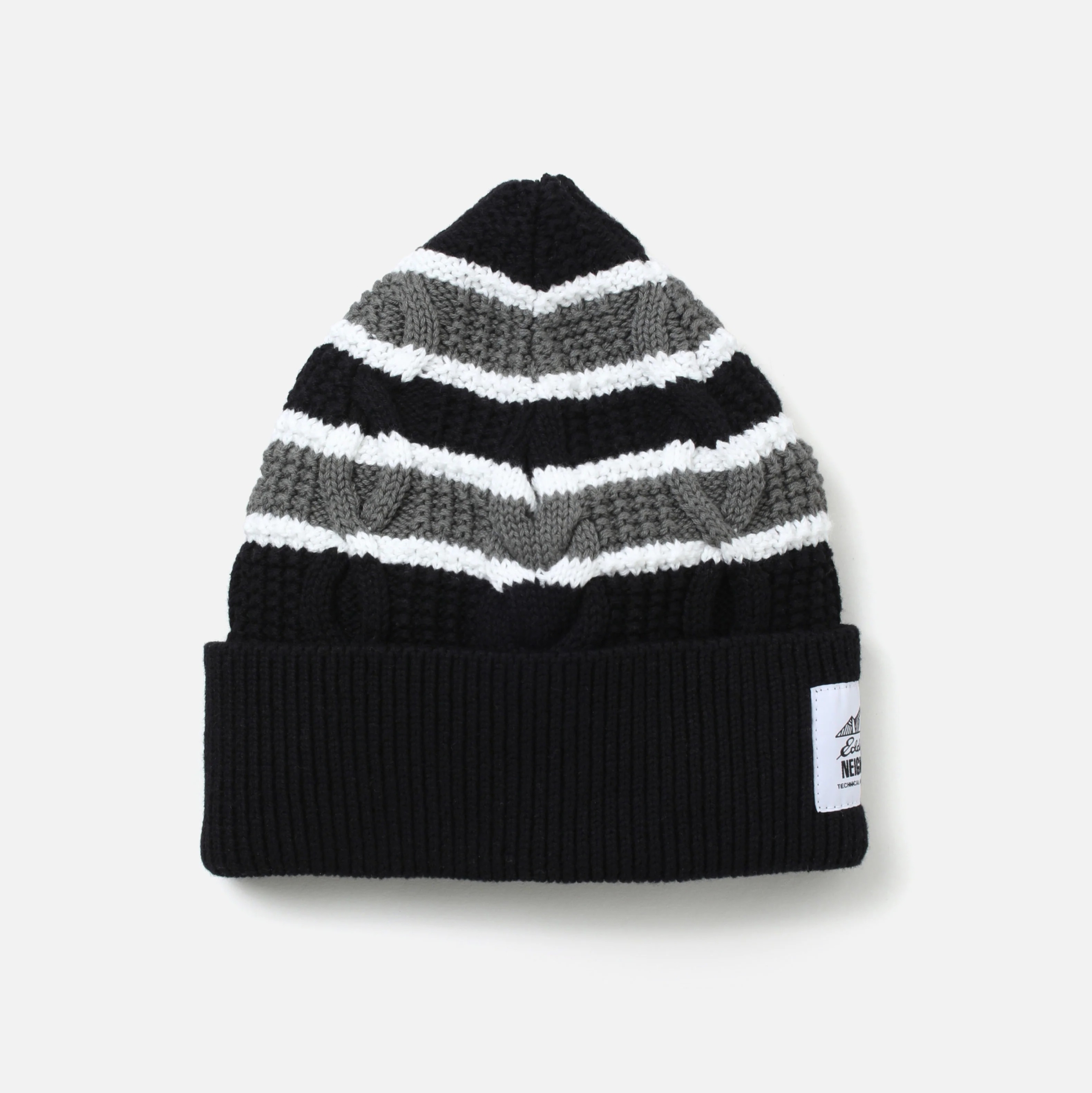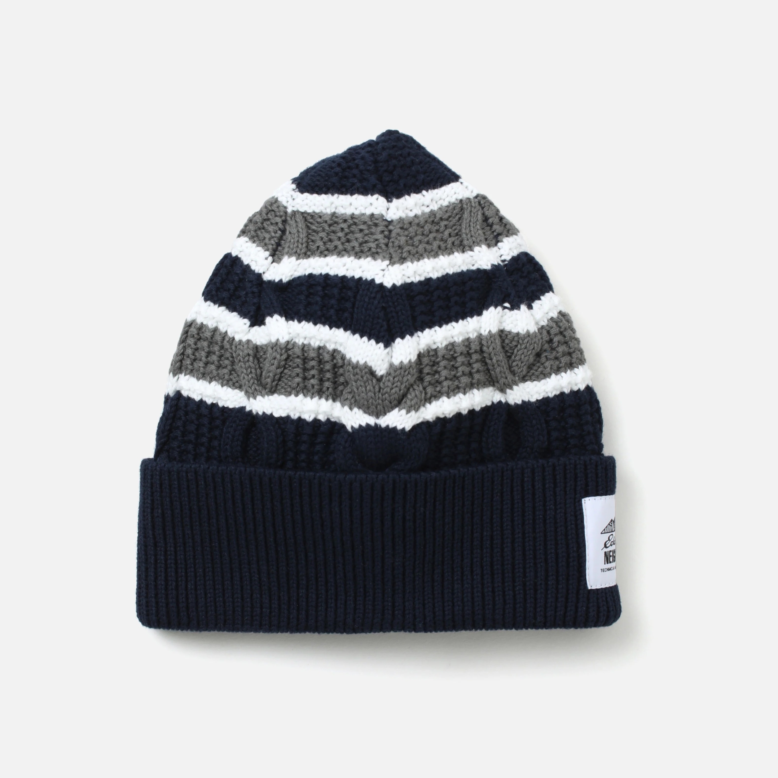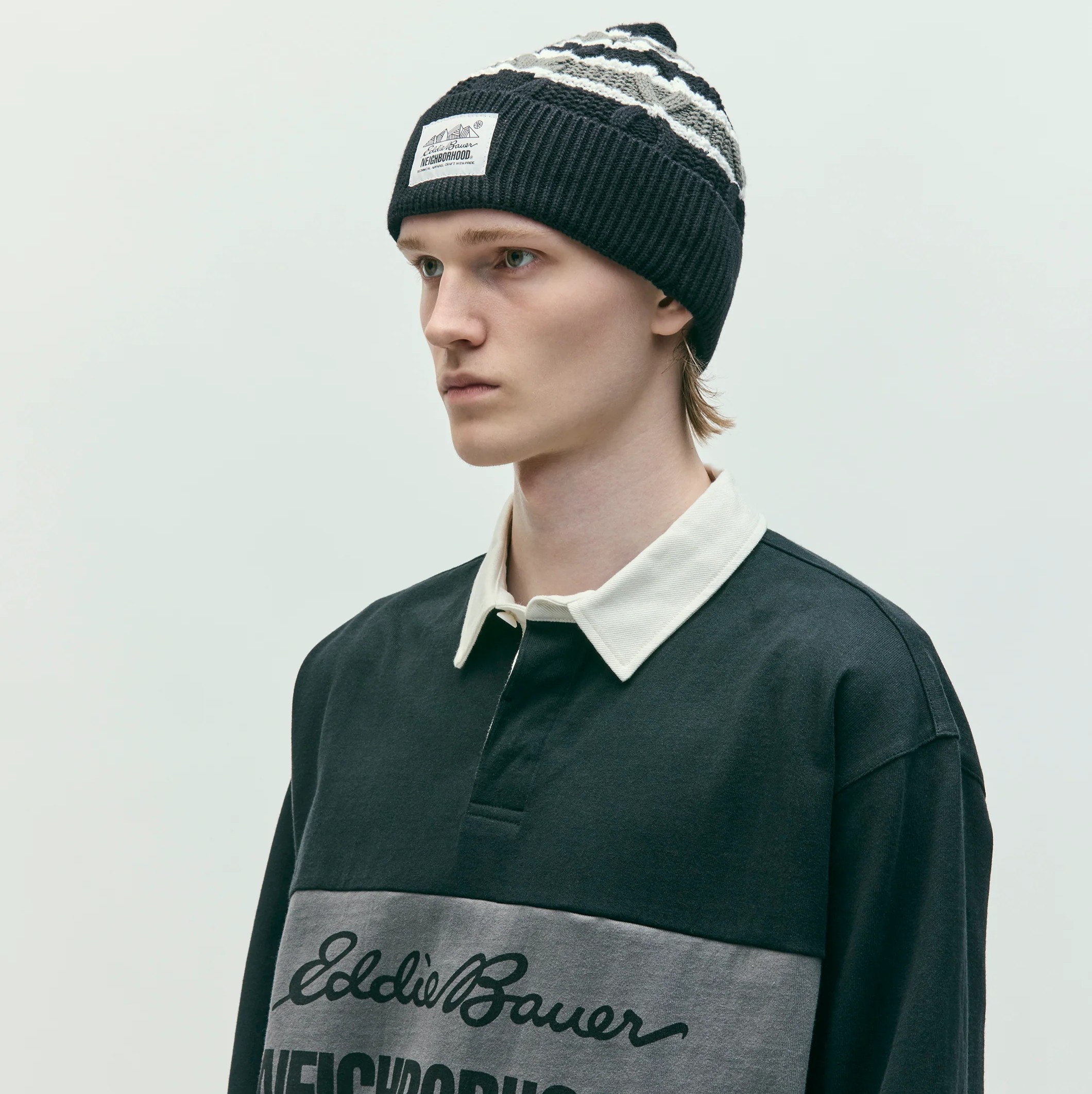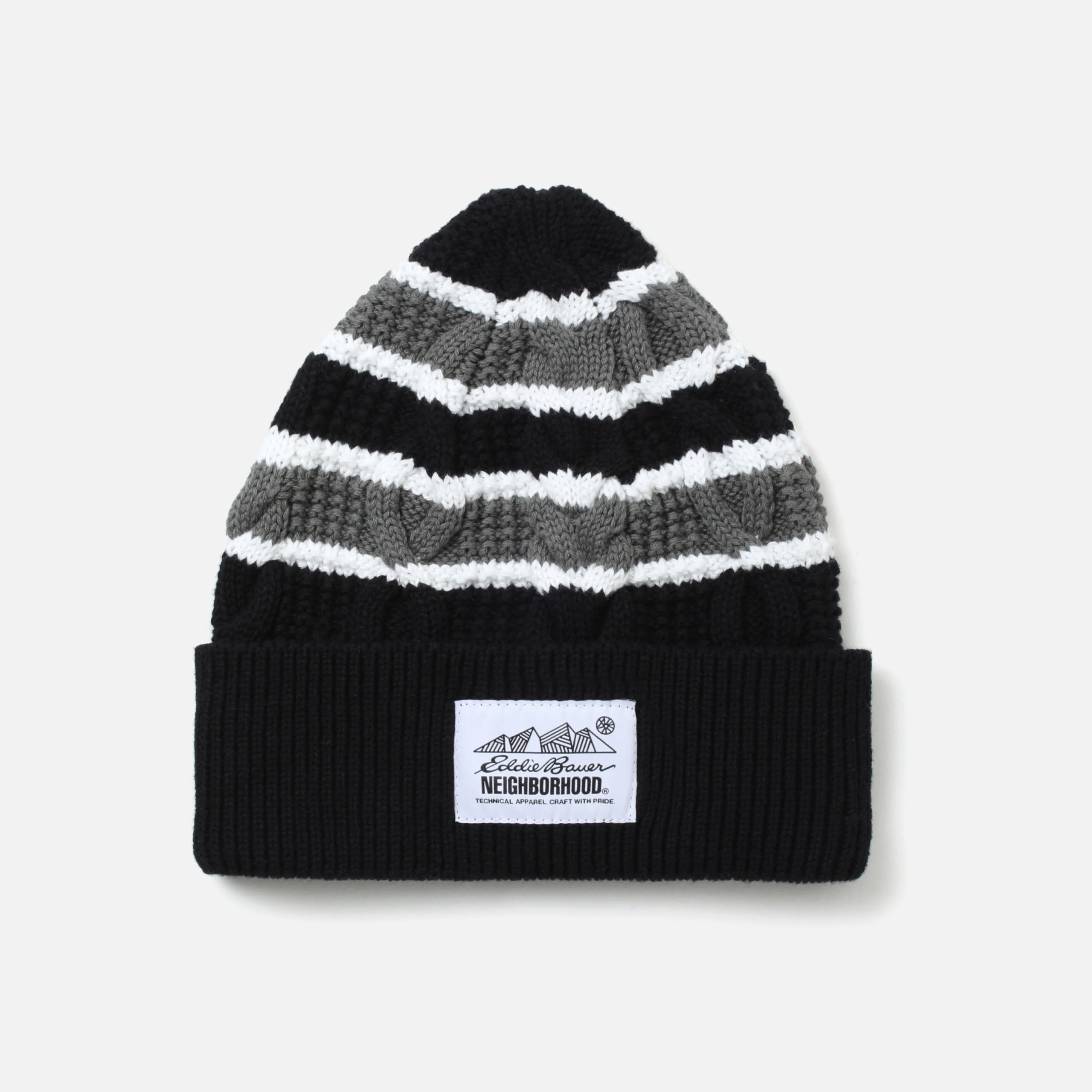 コットン糸で編み立てたボーダー柄のケーブルニットを使用したビーニー。フロント折り返し部分にコラボレーションネームを配置。1920年創業のアメリカ・シアトル発アウトドアブランドEddie Bauerとのジョイントワークアイテム。