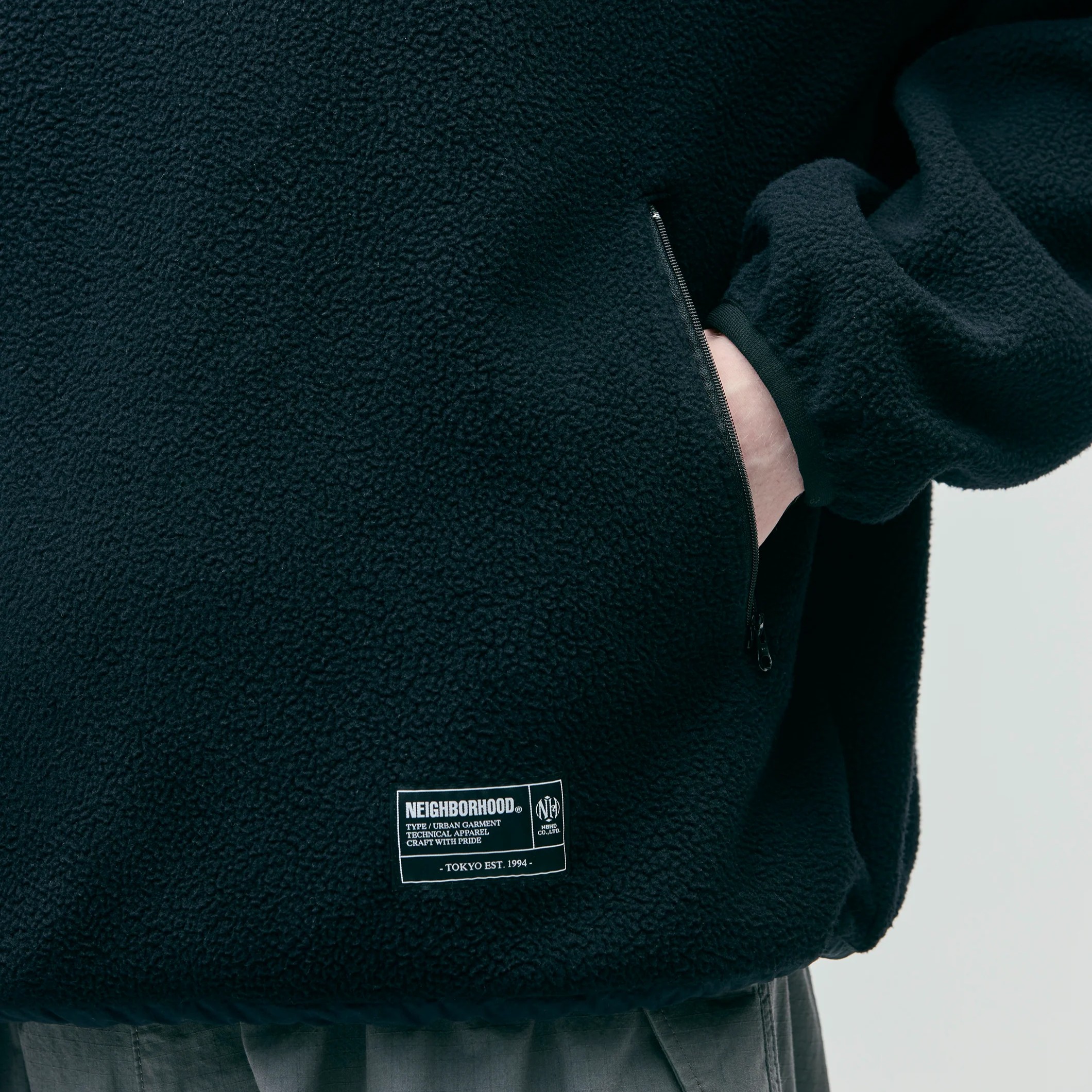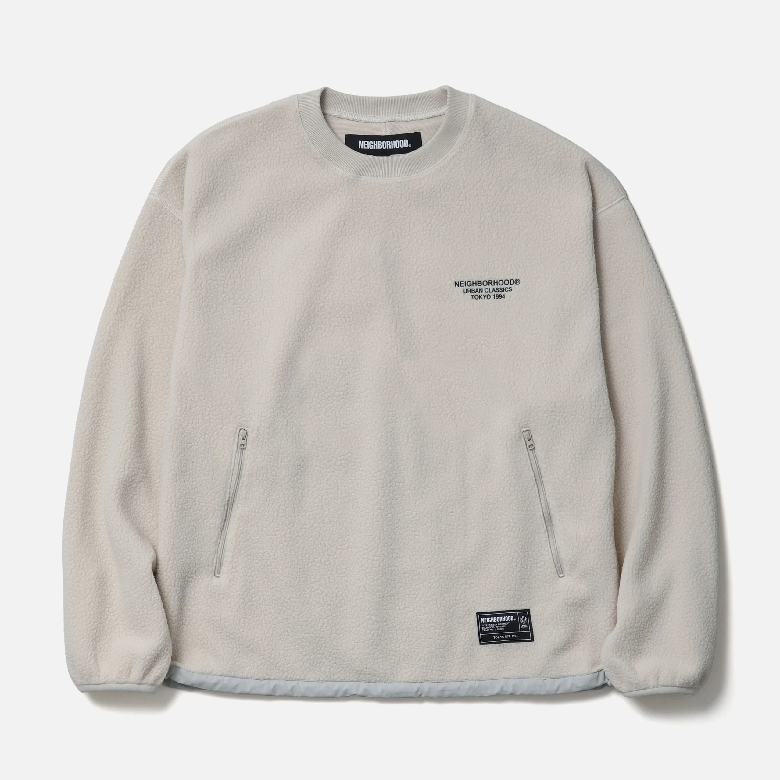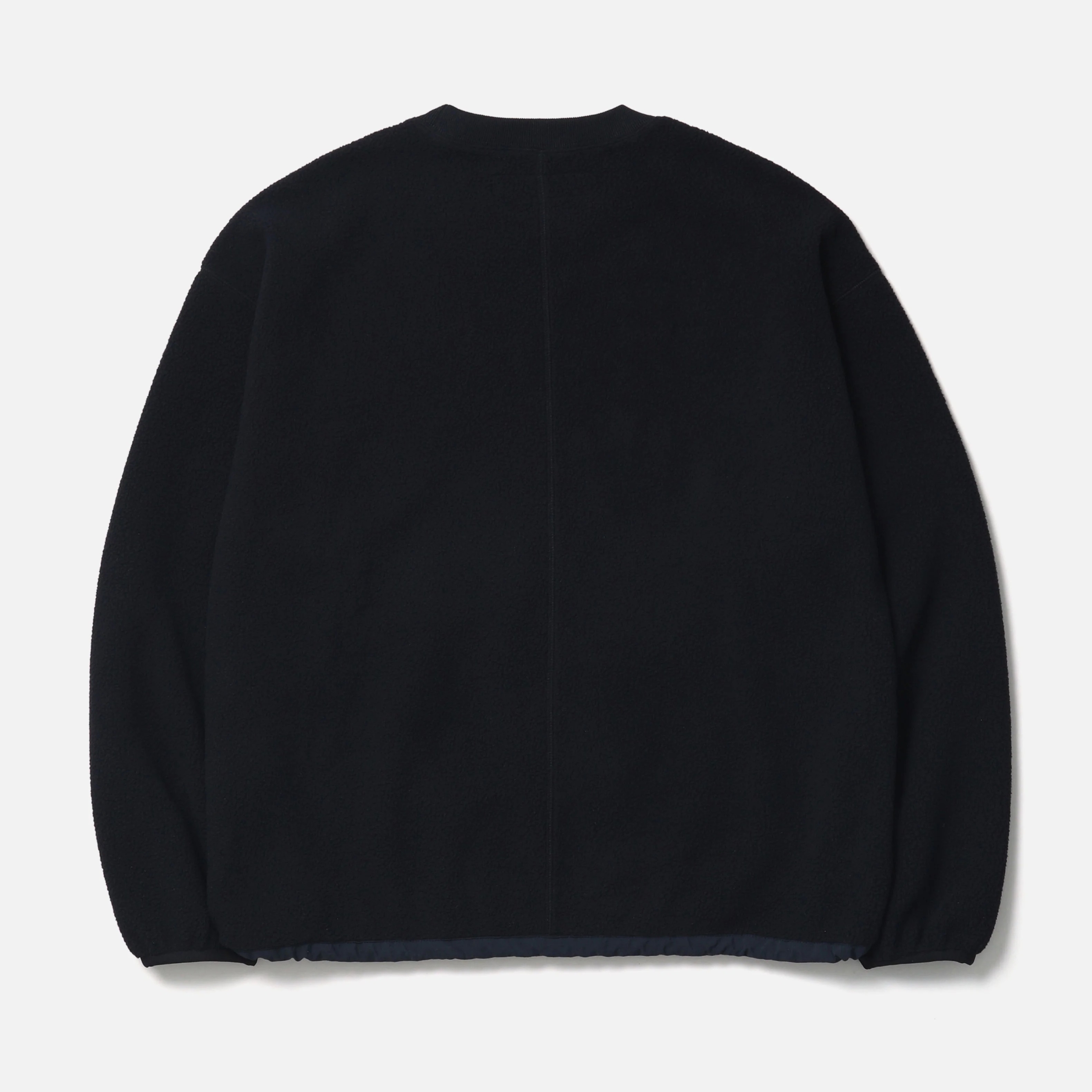 POLARTEC社THERMAL PRO®の保温性に優れる軽量ボア素材(リサイクルポリエステル100%)を使用したクルーネックプルオーバー。両サイドにファスナー付きのポケットを配置。裾部分に調節用のゴムスピンドルを内蔵。左胸にロゴを刺繍。サイドシームにピスネームを付属。MODEL:184cm / SIZE:L