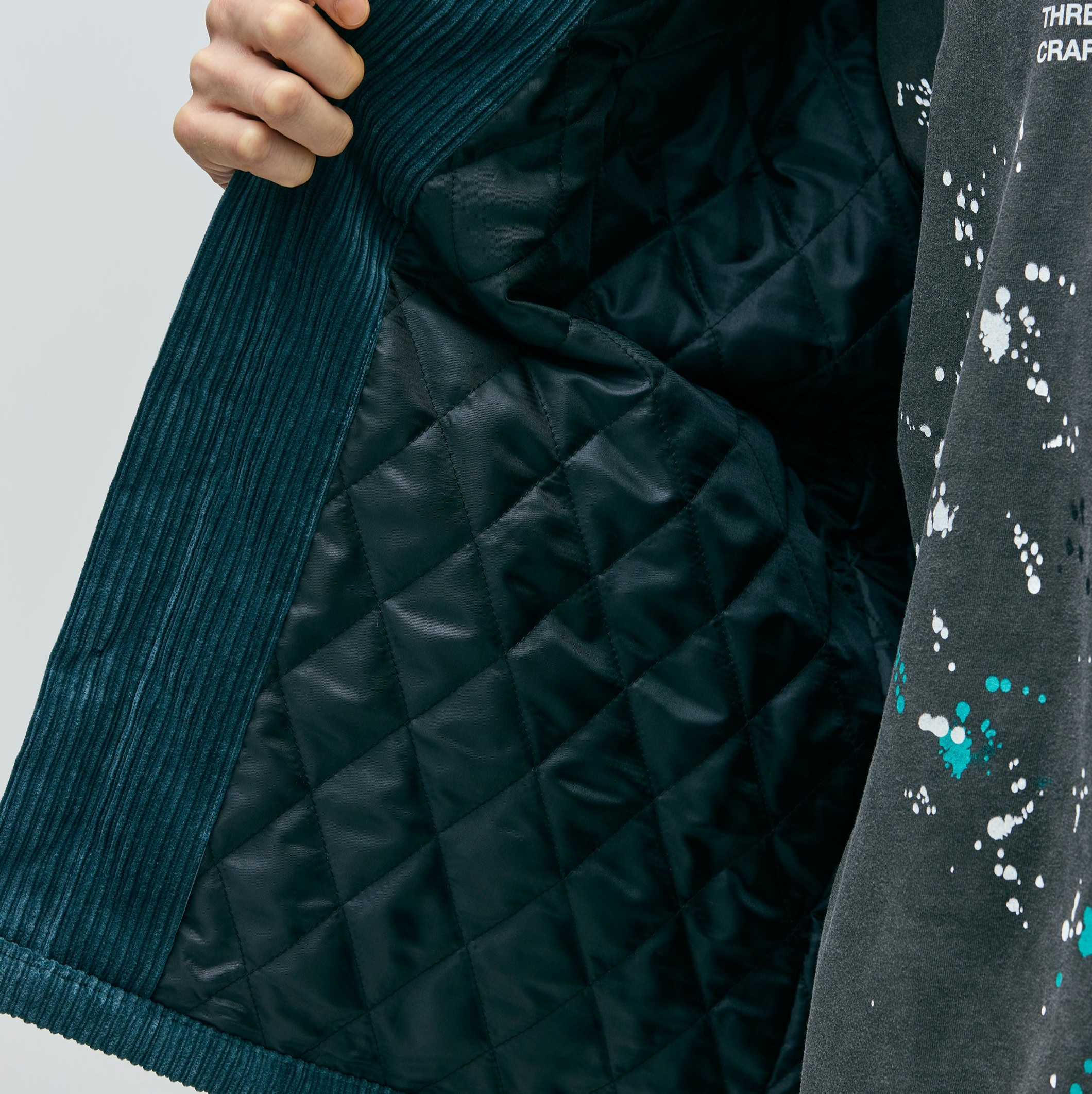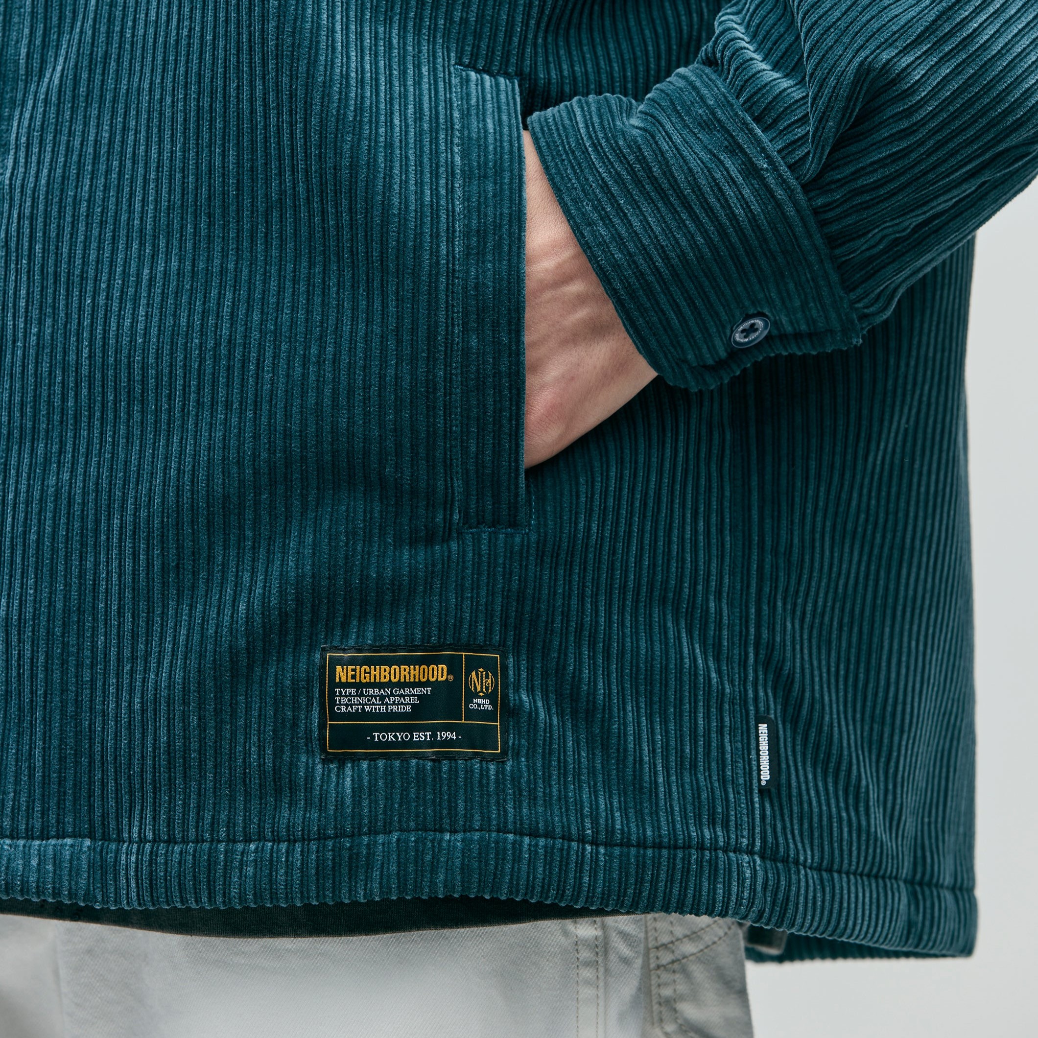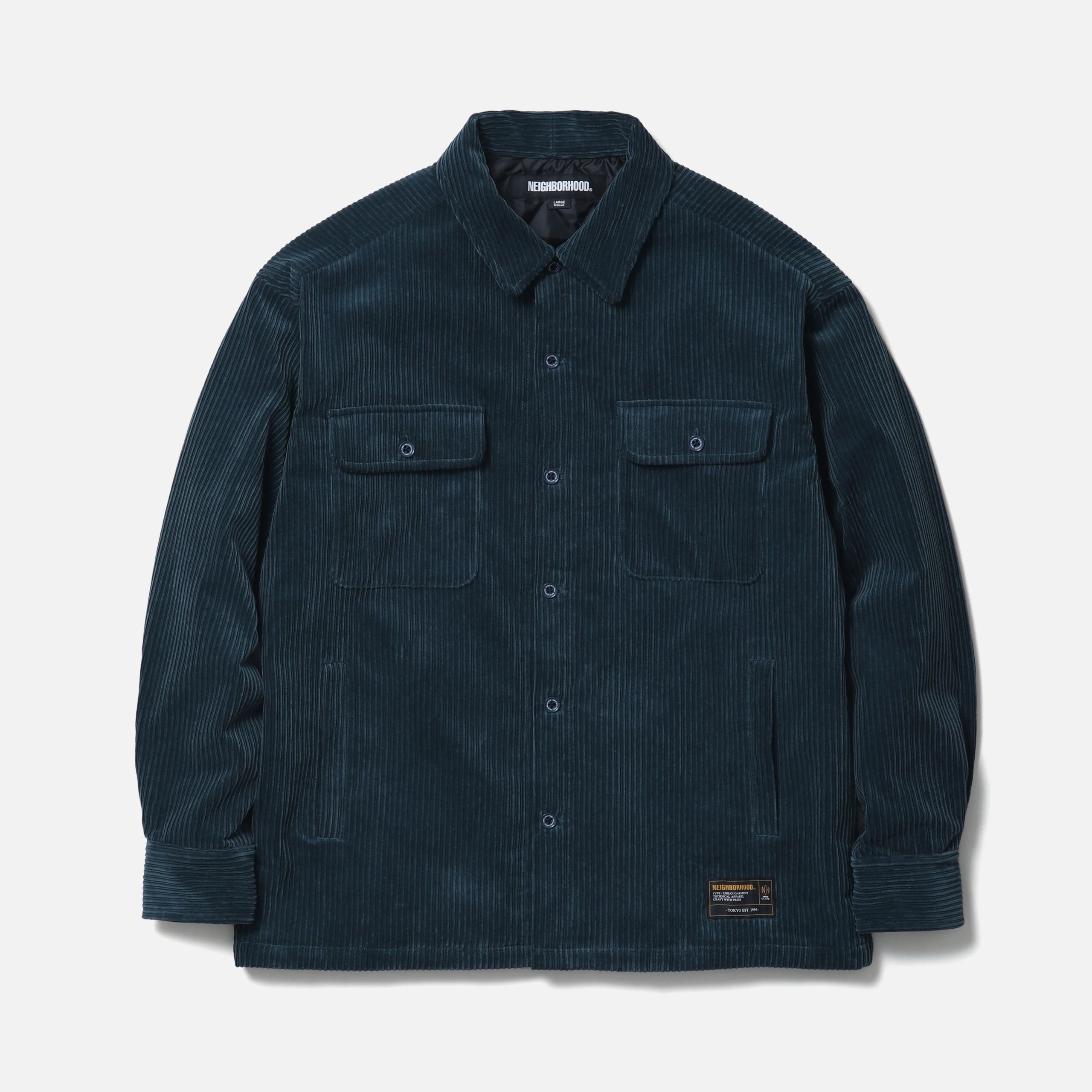 保温性に優れたコールエアータンブラー素材のコーデュロイキルティングシャツ。裏地は中綿入りのダイヤキルティング仕様でアウターライクです。両サイドに片玉縁ポケットを配置。オリジナルの四つ穴ボタンを採用し、左裾にネームタグ、サイドシームにピスネームを付属。MODEL:184cm / SIZE:L