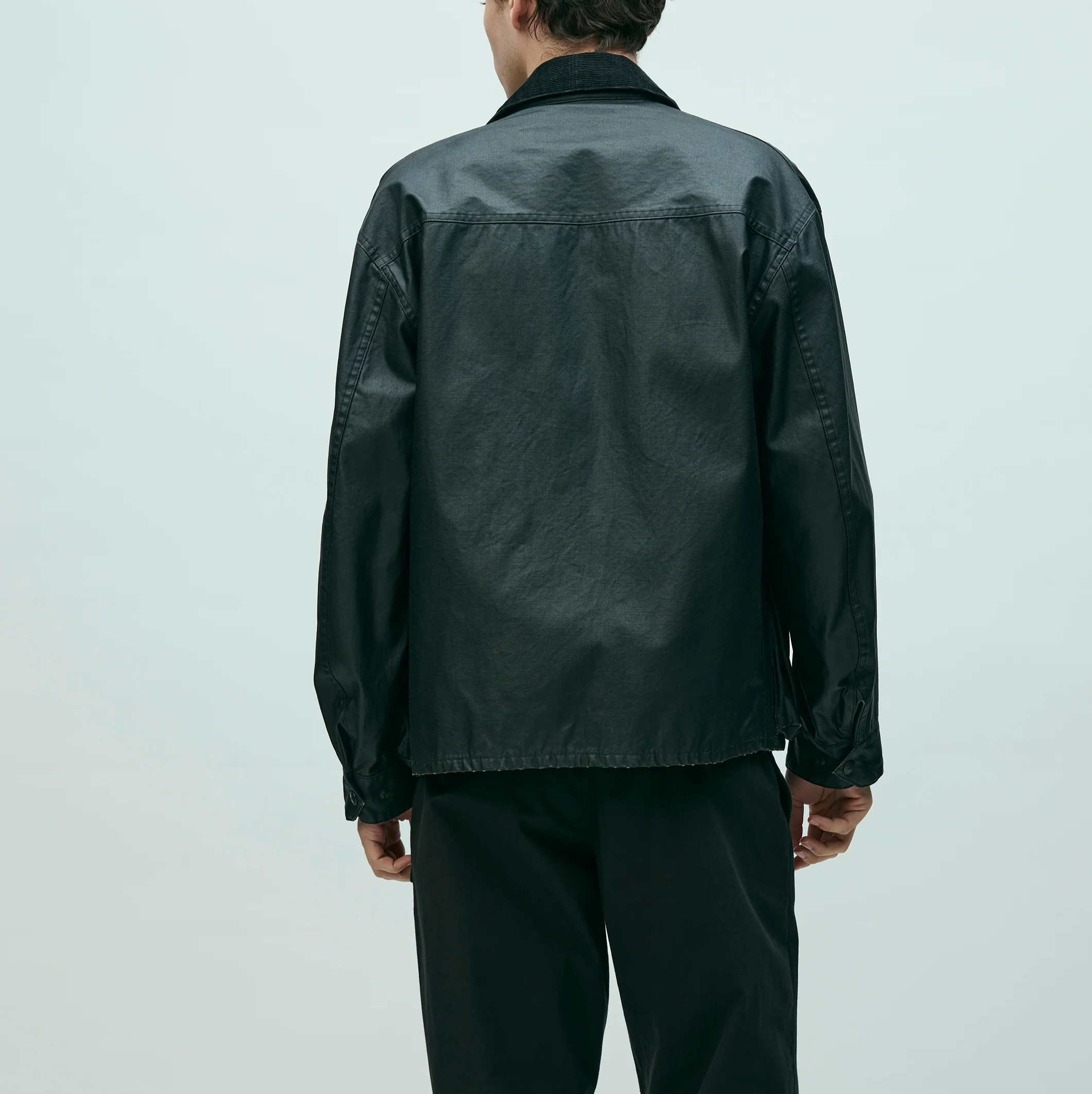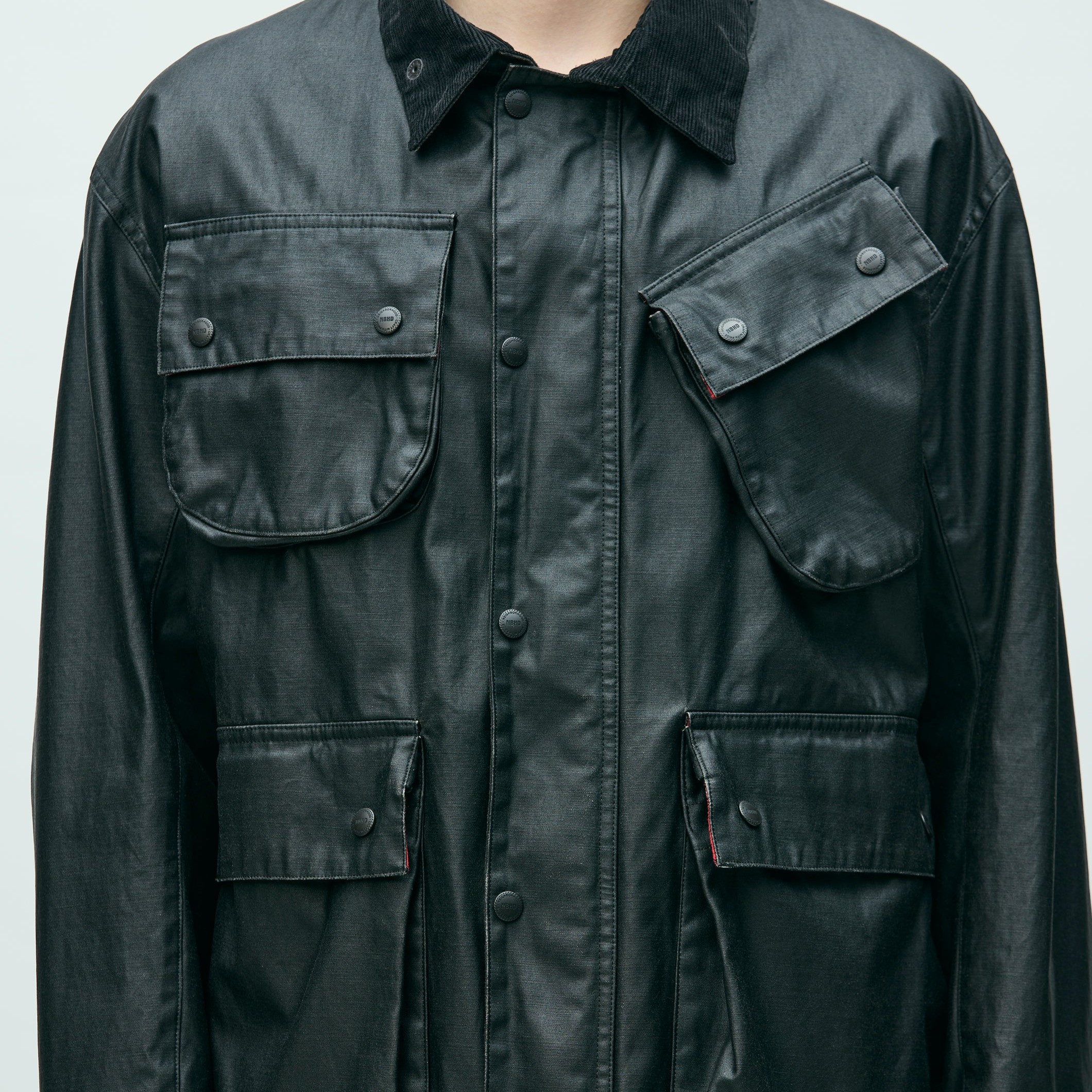バックサテンに顔料コーティングを施したレザーライクなコーティングフィールドジャケット。洗いや着用を重ねるごとにスレやアタリが出てくるので表情豊かになる過程を楽しめるのが特徴。襟はコーデュロイで切り替え、裏地はタータンチェック生地を使用。フロントに大容量のマチ付きポケット、風防仕様の襟タブ、スナップ式の前立てとジップ開きの2重構造など、機能性のある仕様。オリジナルのスナップボタンとジッパープルを採用。脇接ぎにピスネームを付属。MODEL:185cm / SIZE:L