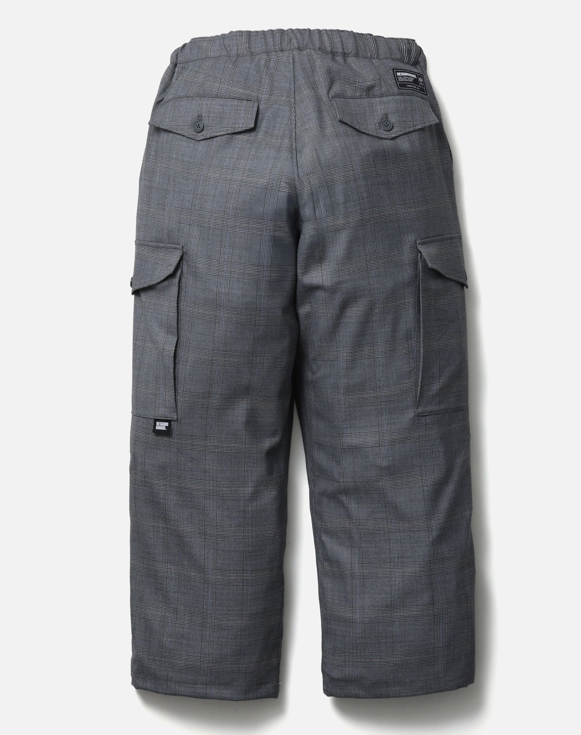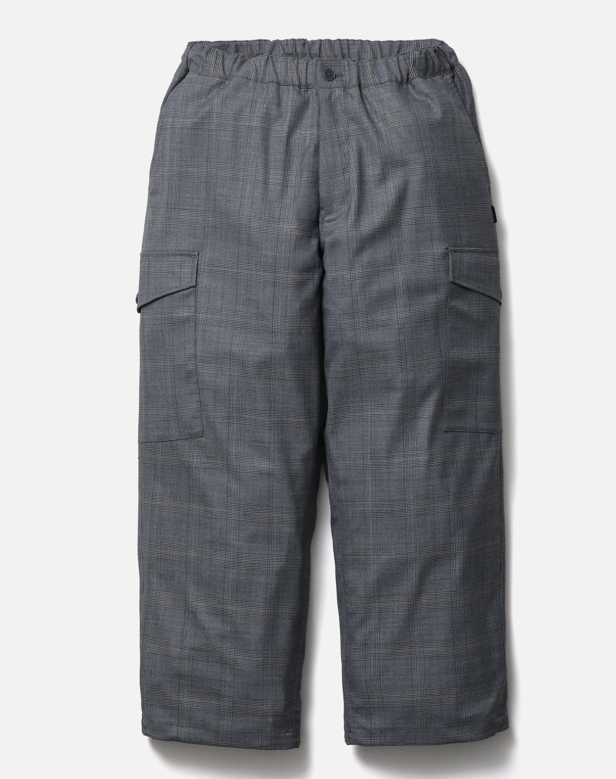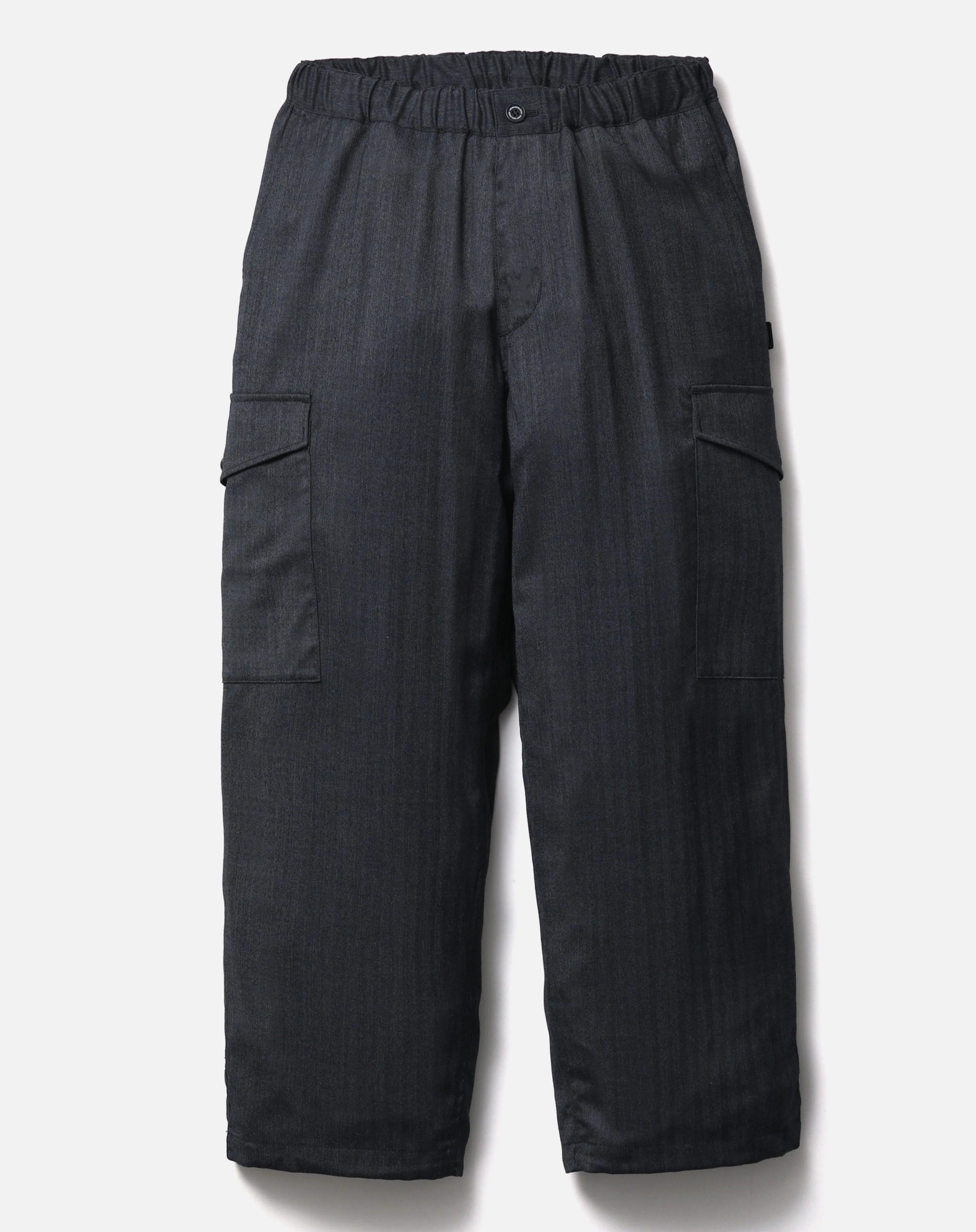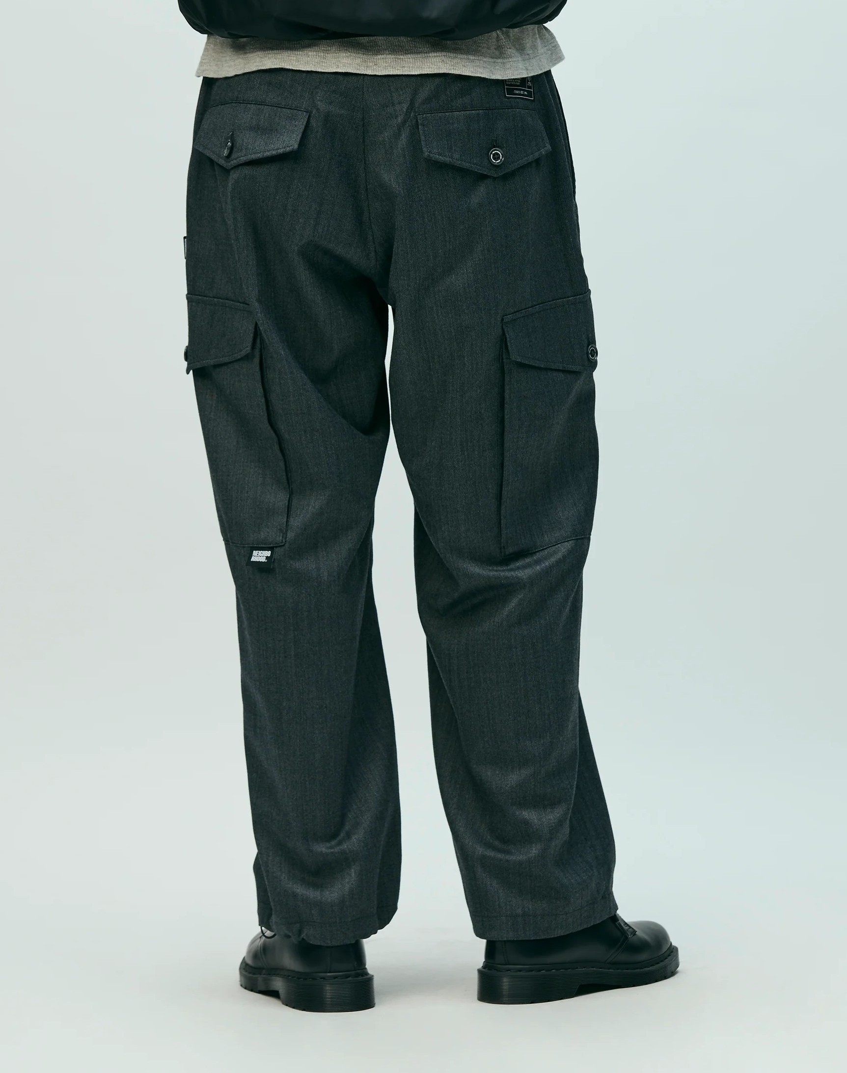 柔らかな質感。ゆったりとしたたるみや流れるようなひだ。流動的な表情。ウールレーヨン混なので大人っぽい生地。ウォッシャブルウール混で仕立てたワイドカーゴパンツ。両脇にマチ付きカーゴポケットを配置。ゴム入りウエスト内側と裾にゴムドローコードを内蔵。オリジナルボタン、ジッパープル、シグネチャーテープを採用。カーゴポケットと背面フラップポケット上部にブランドタグ、脇接ぎにピスネームを付属。 MODEL:185cm / SIZE:L
