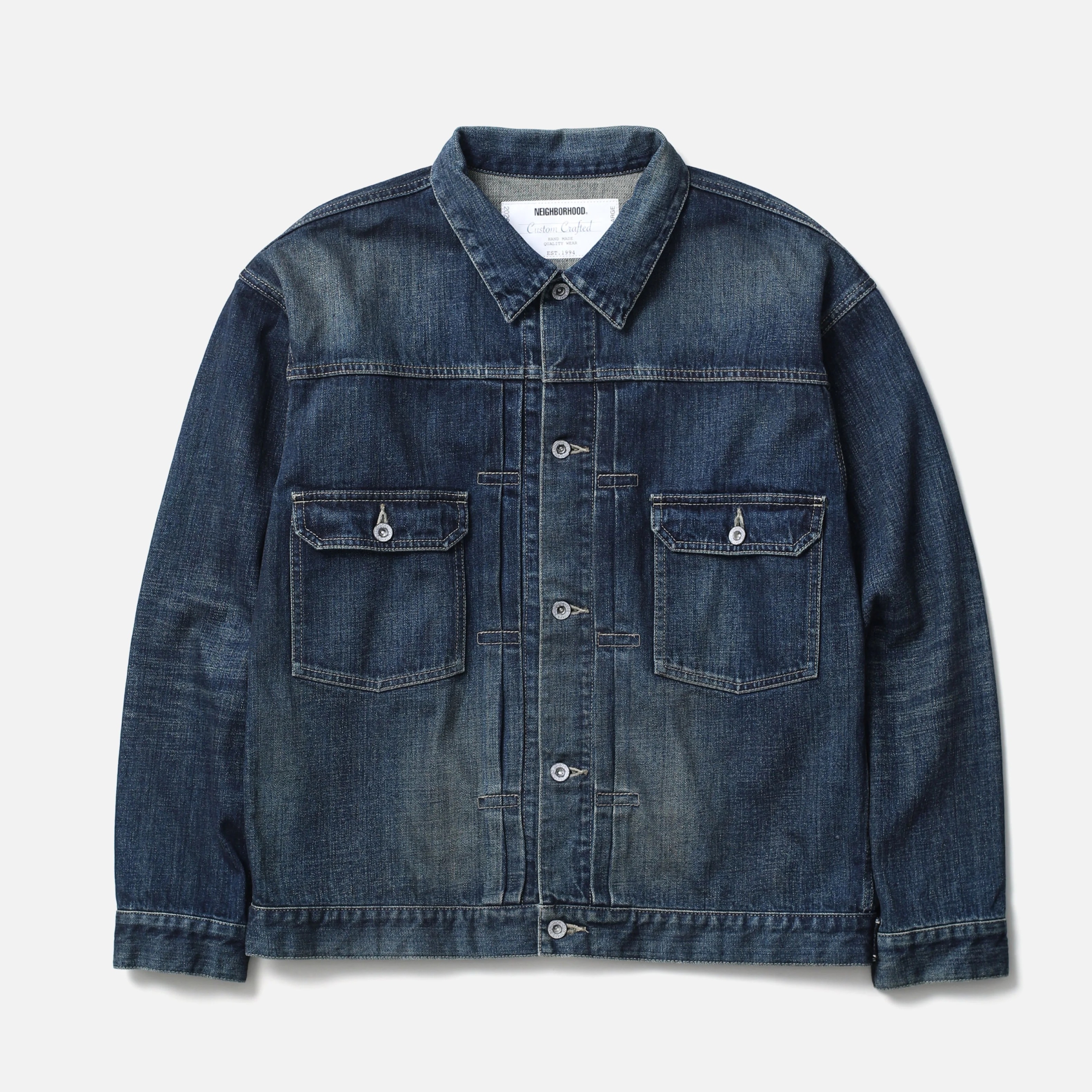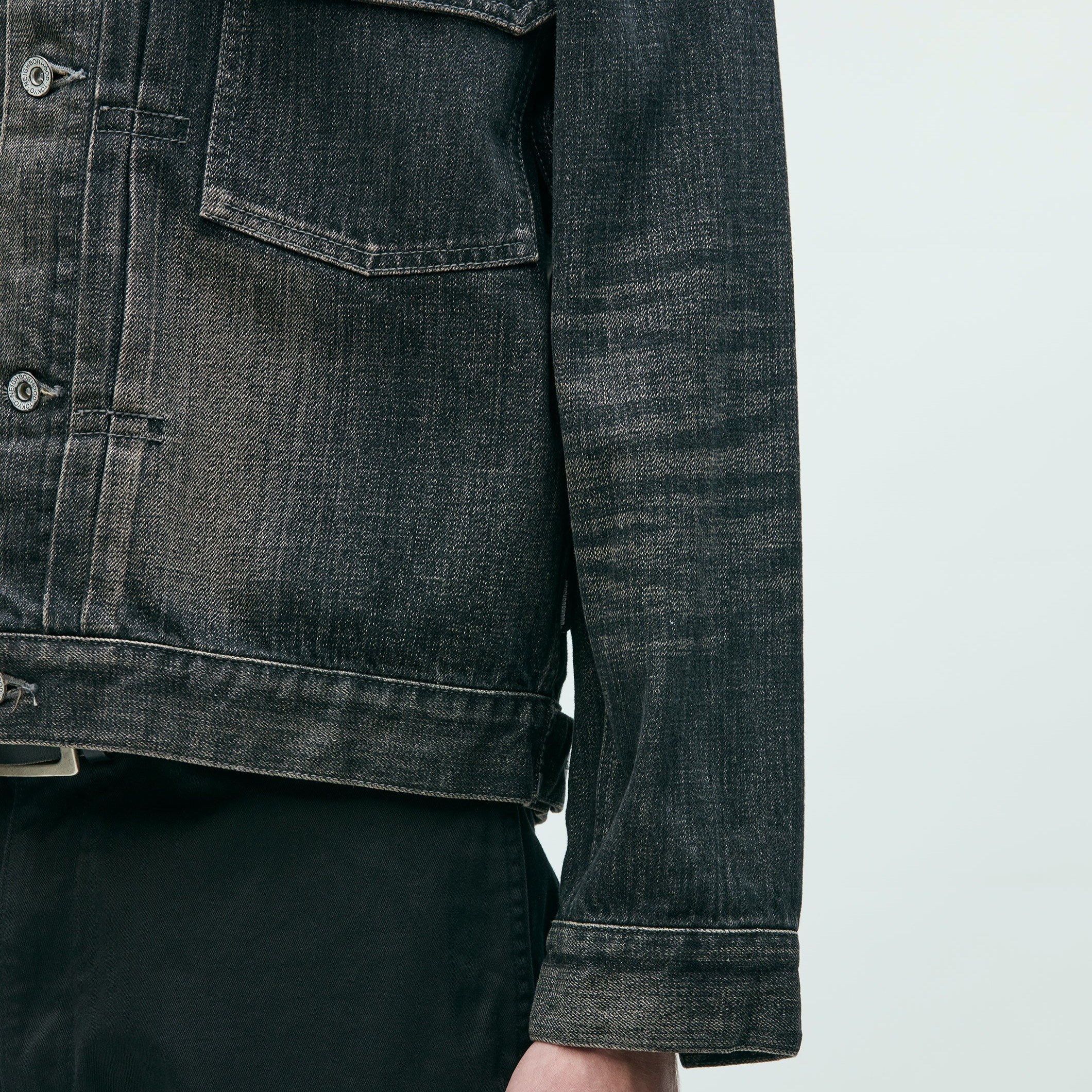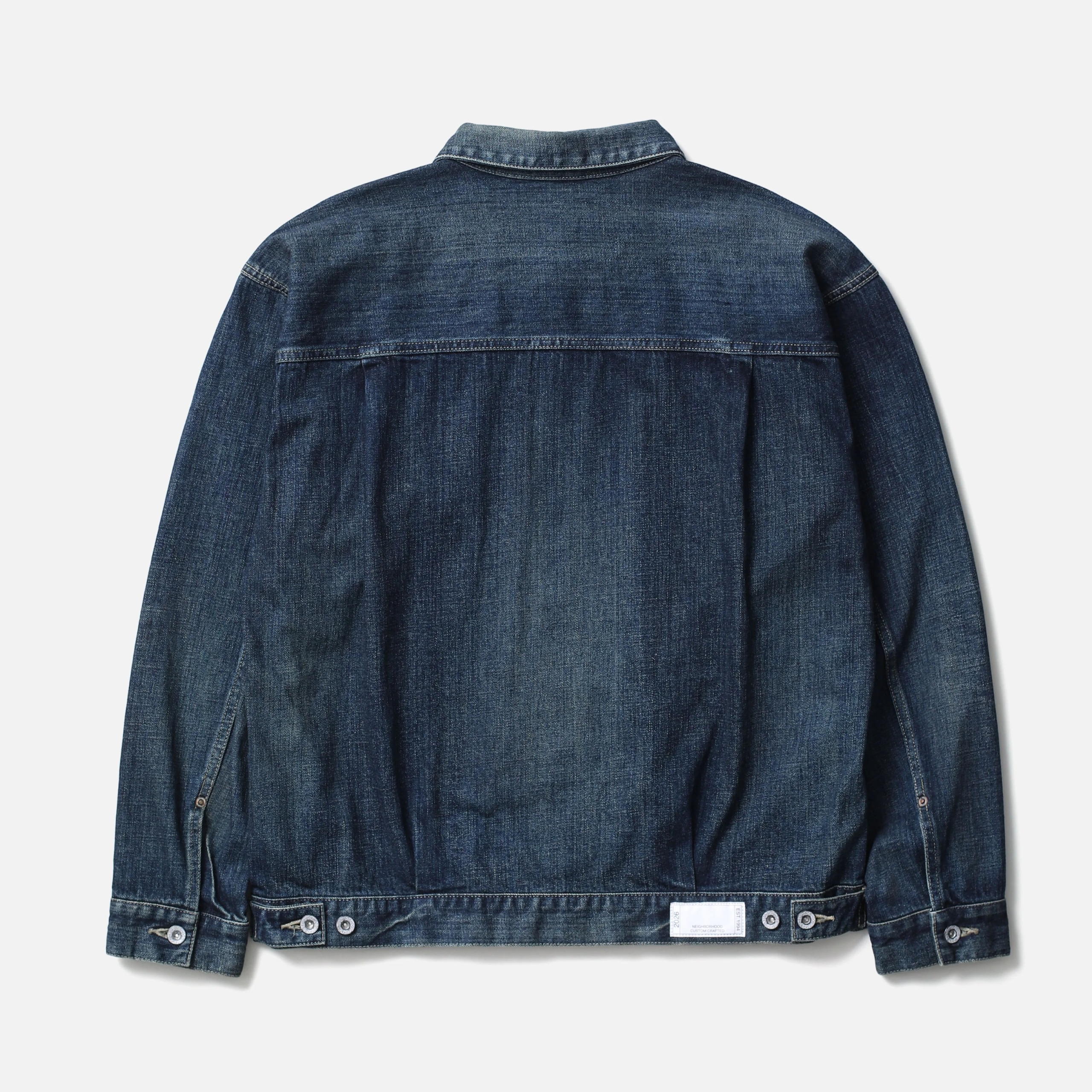 オリジナルの12ozデニム生地にウォッシュド加工を施した2ndタイプのデニムジャケット。自然な色落ちやダメージ加工などの複合加工を用いて、リアルなエイジングを再現。ステッチは配色仕様。オリジナルのタックボタンとリベットを採用。カスタムクラフテッドアイテム専用のサイズネーム、脇接ぎにピスネームを付属。MODEL:186cm / SIZE:M