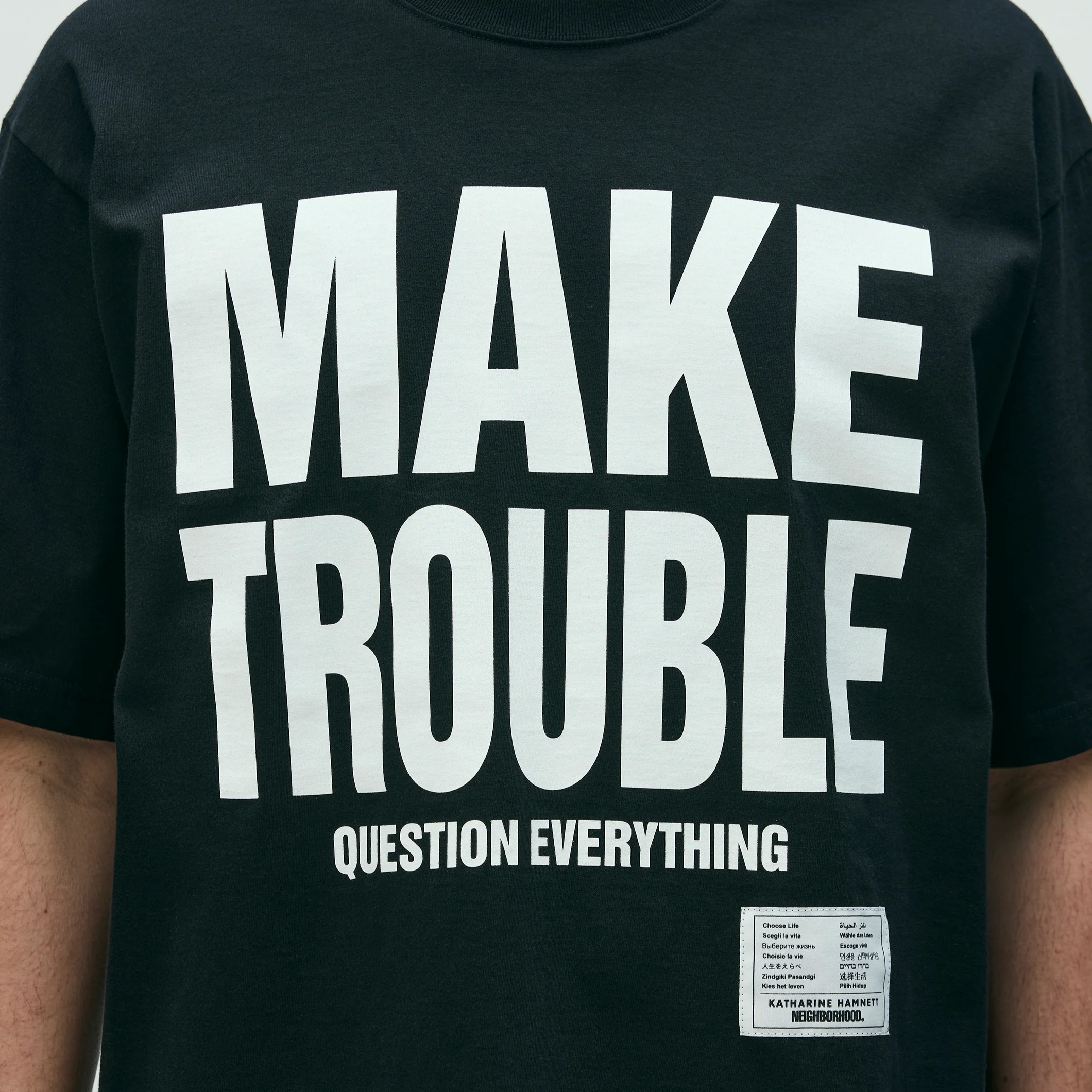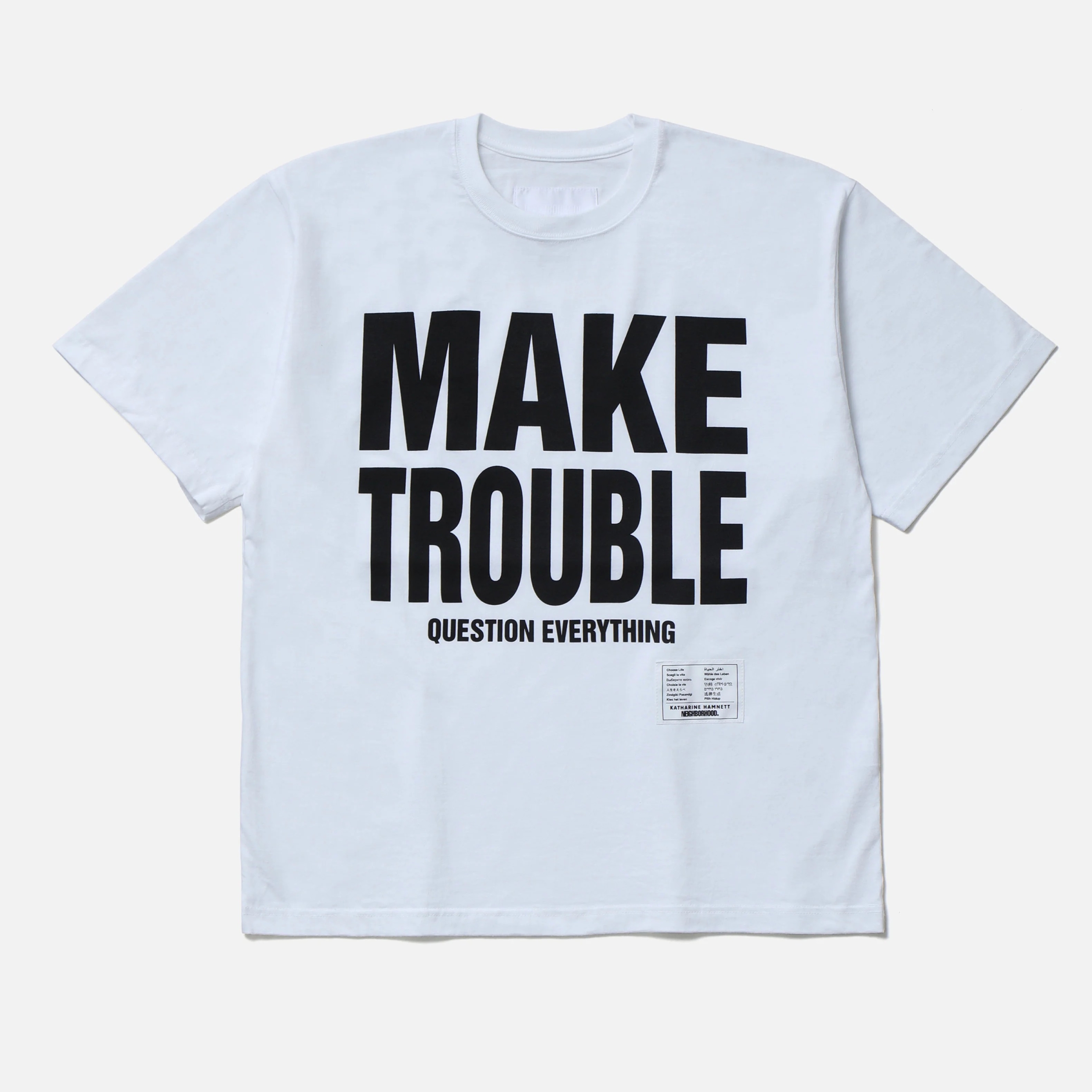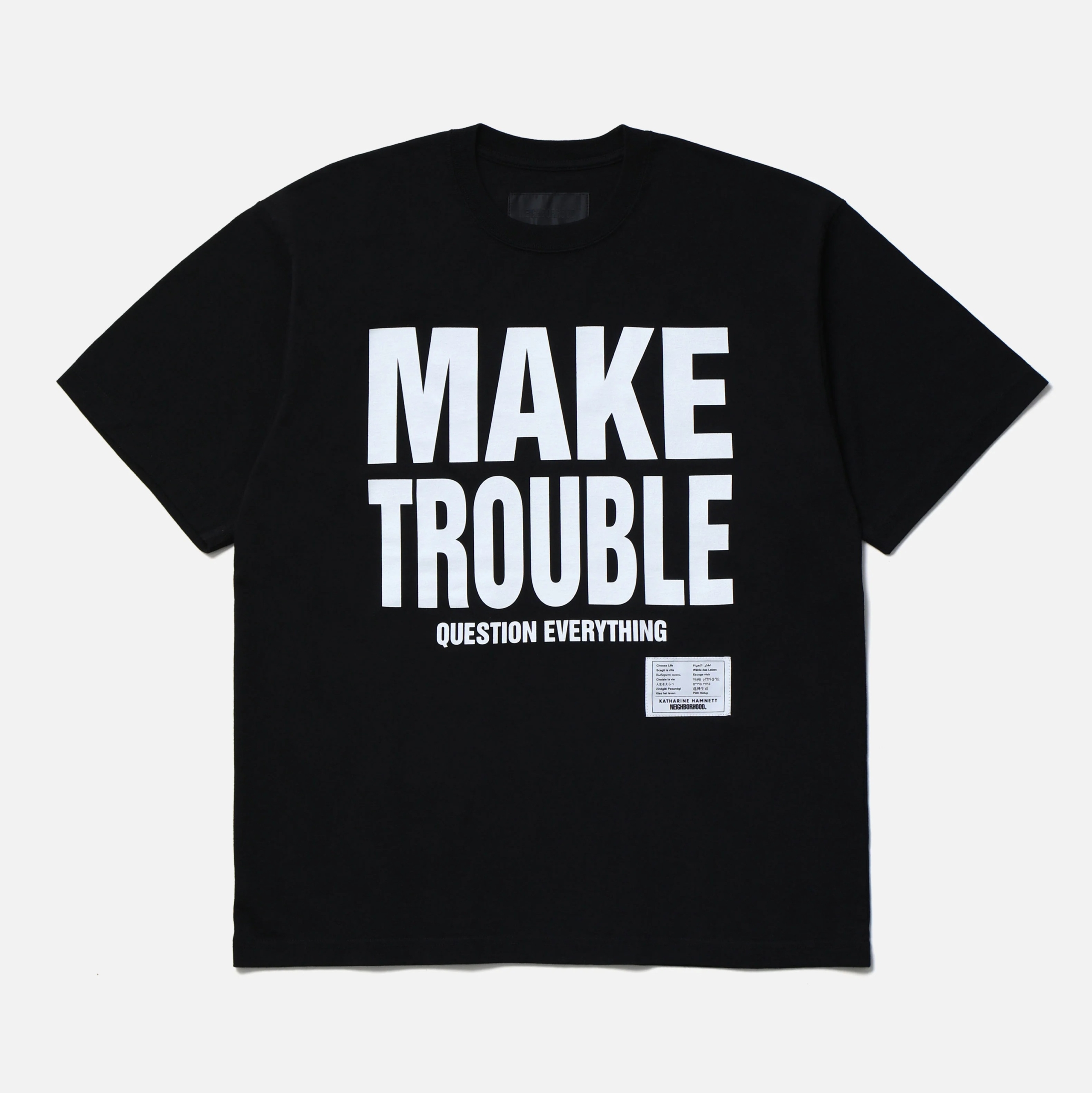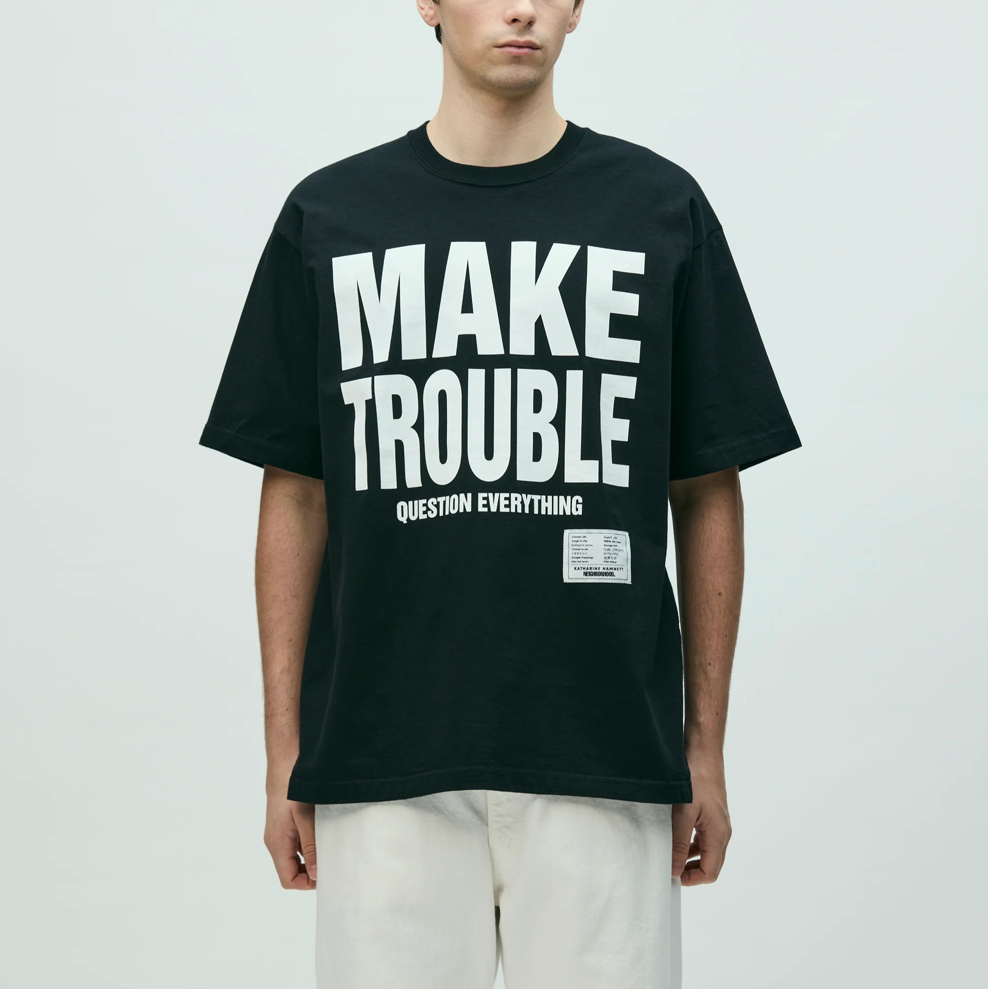 KATHARINE HAMNETTが提言するスローガンをプリントしたショートスリーブTシャツ。スローガンには、既存の権威や常識を疑い、変革を促す行動を呼びかけるメッセージが込められている。コットン天竺のオリジナルボディを使用。特別仕様のブランドタグを配置。MODEL:185cm / SIZE:L