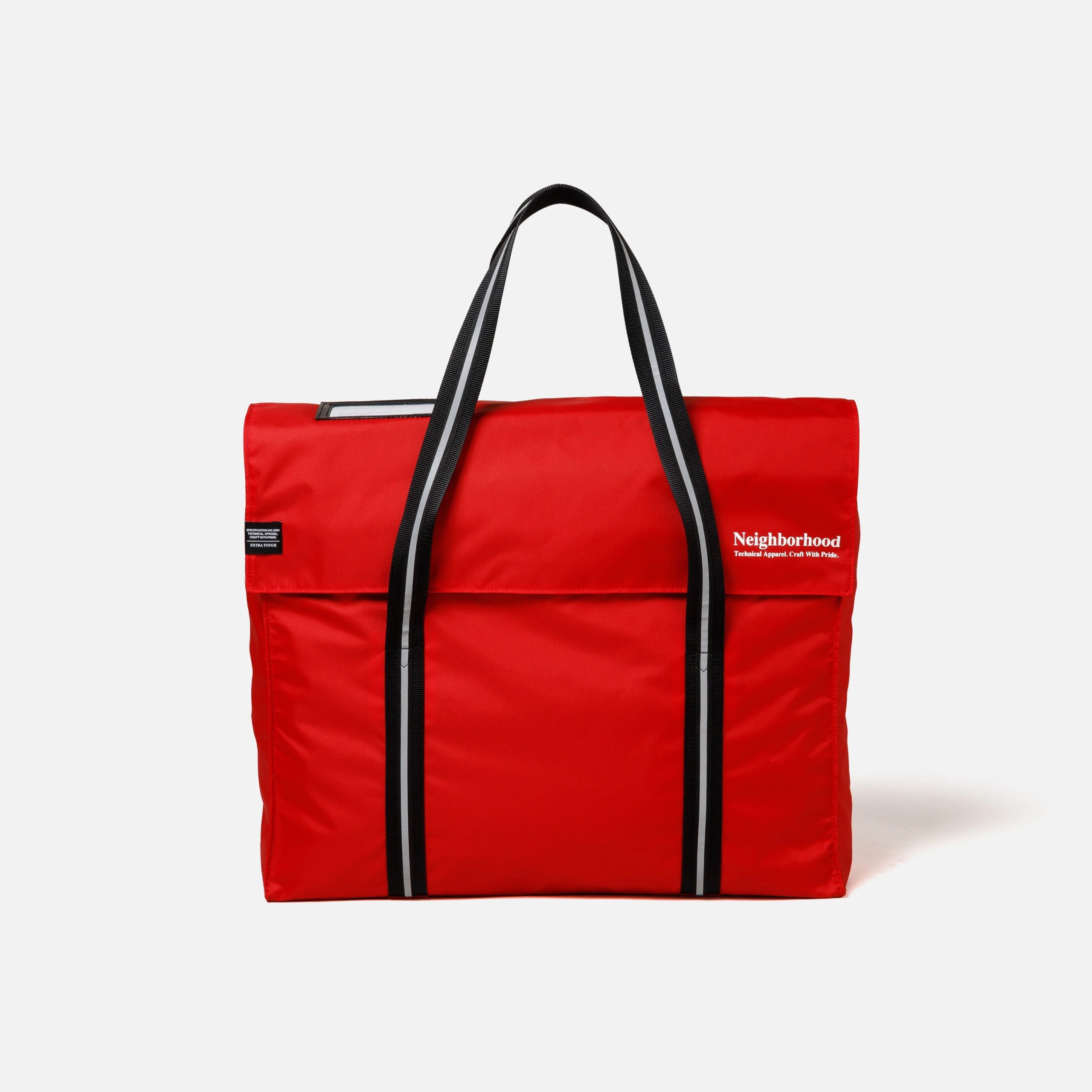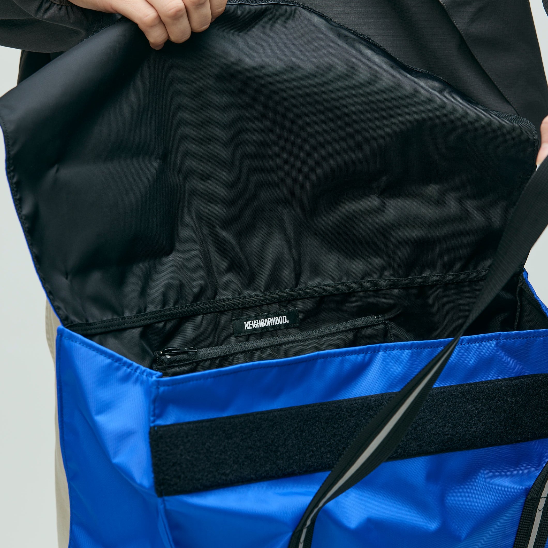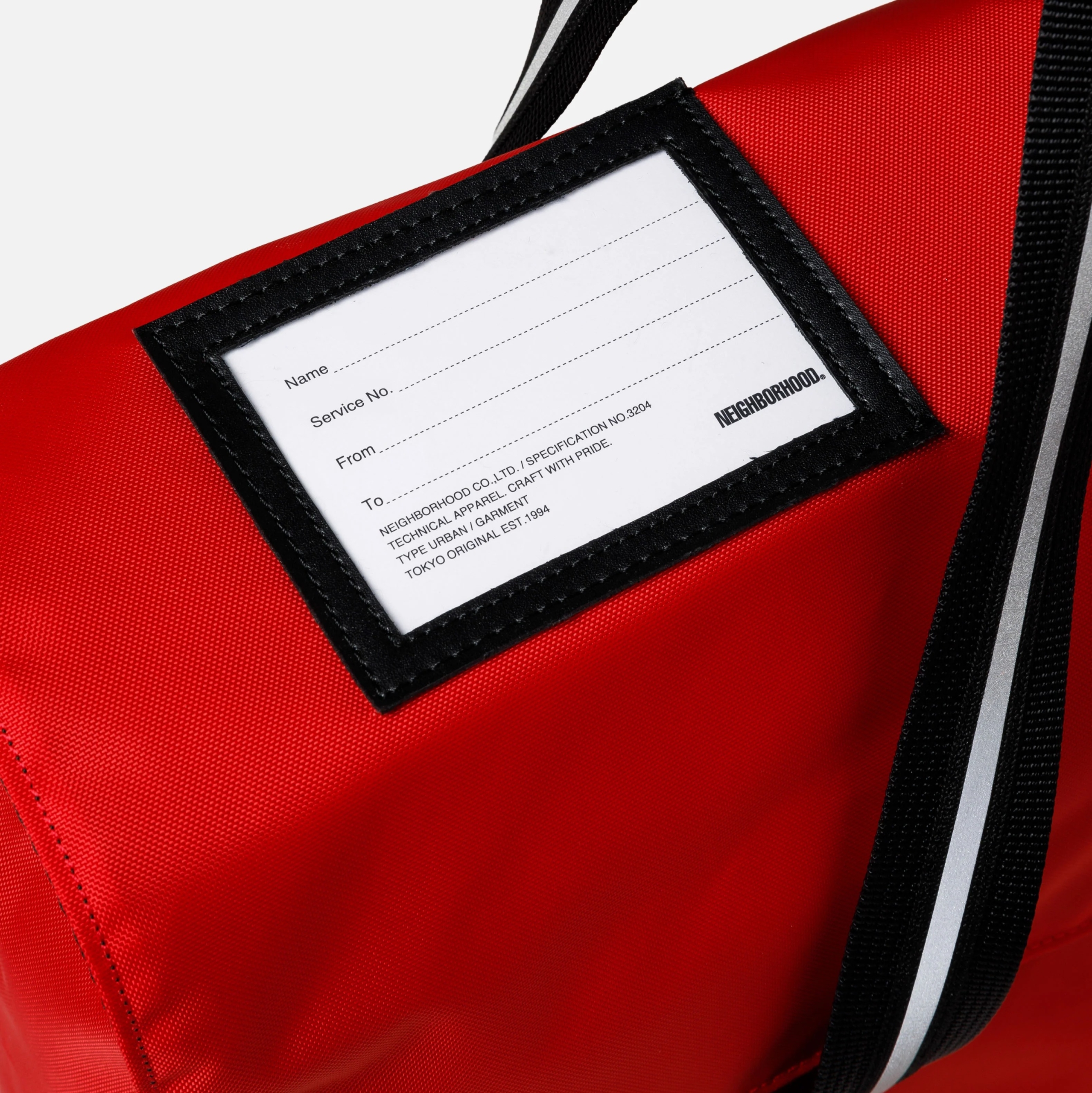 テフロン加工を施した耐久性に優れた撥水効果のあるナイロンオックス素材のトートバッグ。簡単に荷物の出し入れが行えるシンプルな構造(フラップ開閉式)は、実際の郵便配達員のバッグがモチーフ。フロント上部にIDカードホルダー、内側には小物収納に便利なジップポケットを備えた仕様。表側にロゴプリントとブランドタグを配置。W450/H330/D140(mm)