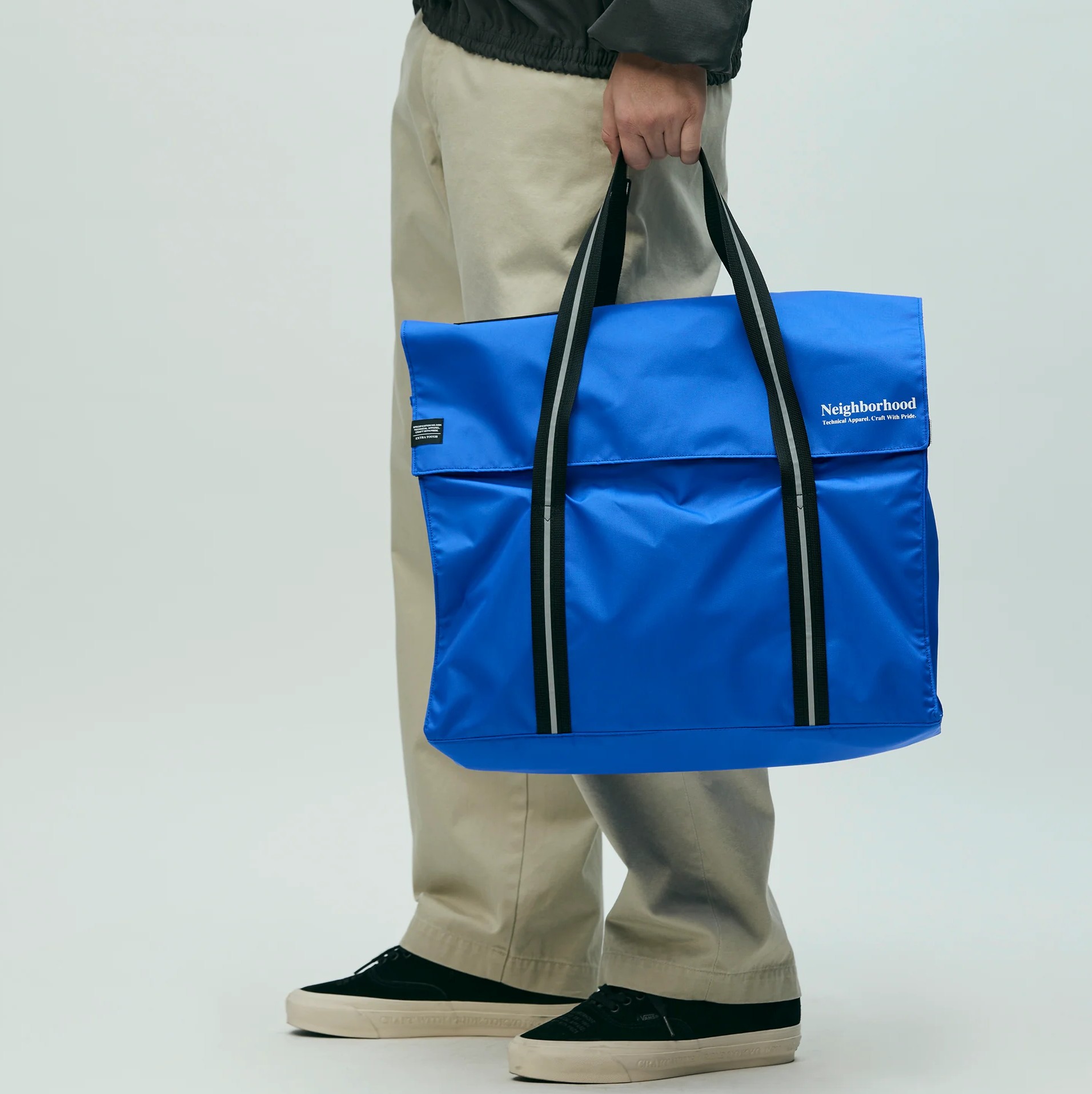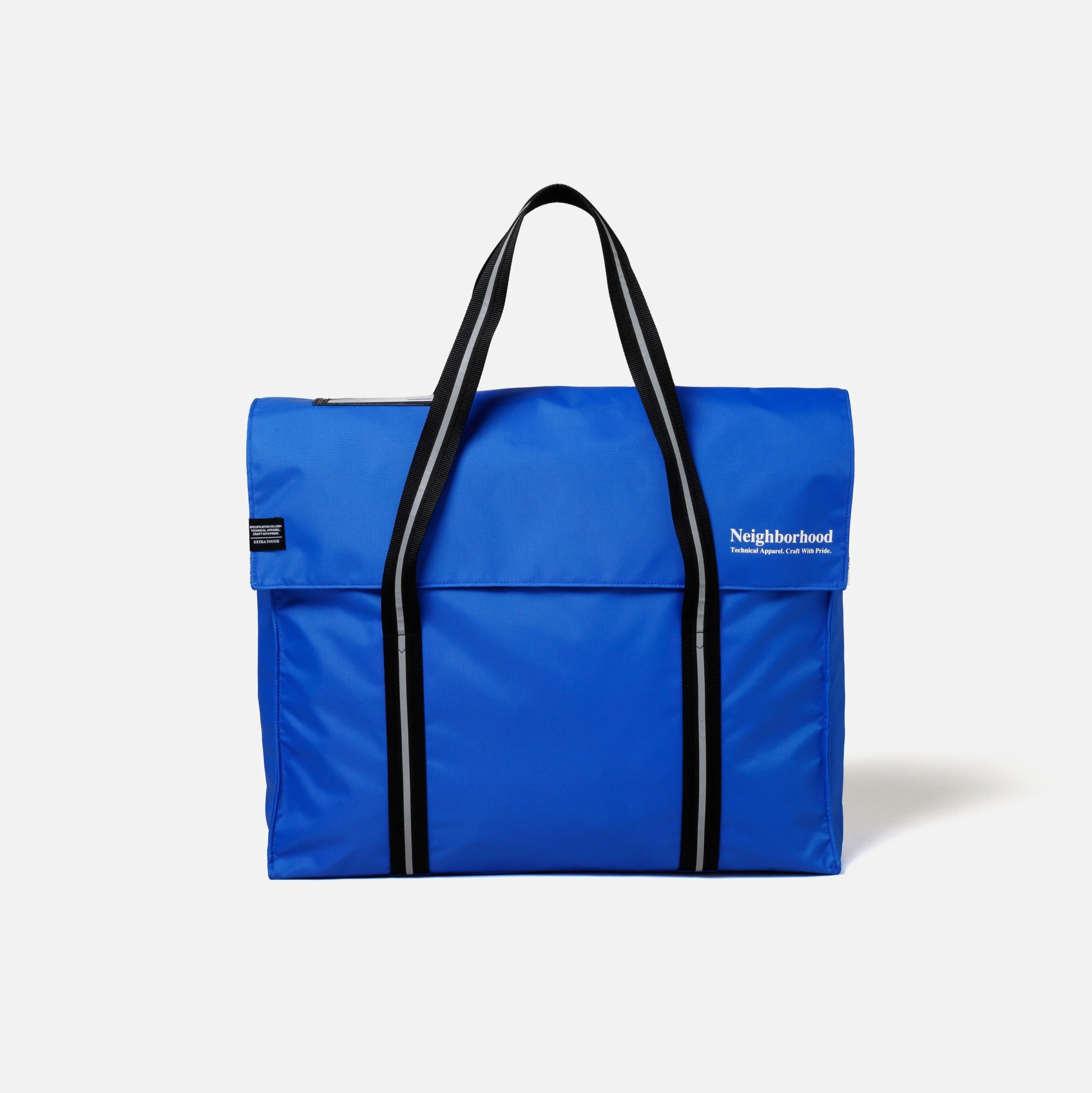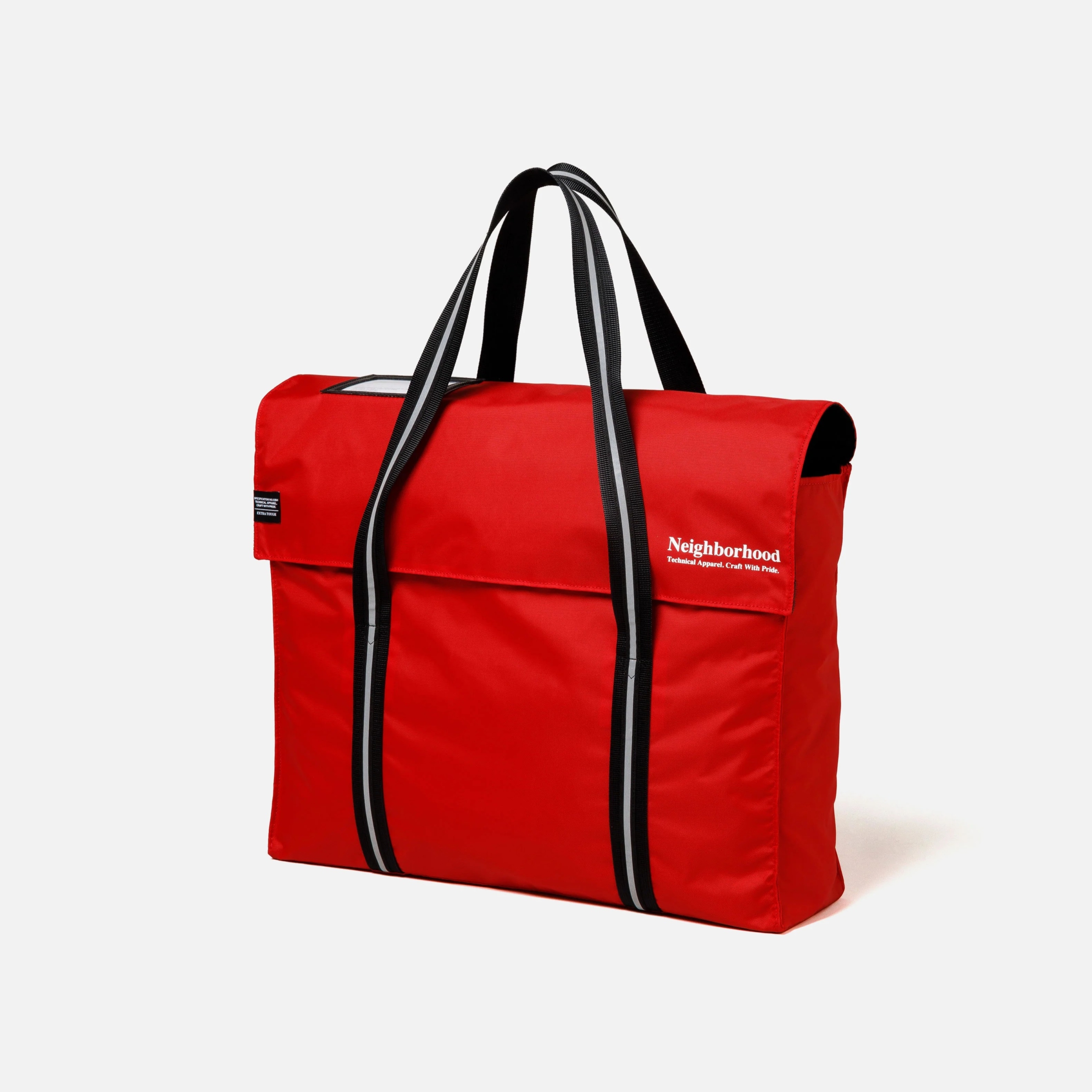 テフロン加工を施した耐久性に優れた撥水効果のあるナイロンオックス素材のトートバッグ。簡単に荷物の出し入れが行えるシンプルな構造(フラップ開閉式)は、実際の郵便配達員のバッグがモチーフ。フロント上部にIDカードホルダー、内側には小物収納に便利なジップポケットを備えた仕様。表側にロゴプリントとブランドタグを配置。W450/H330/D140(mm)