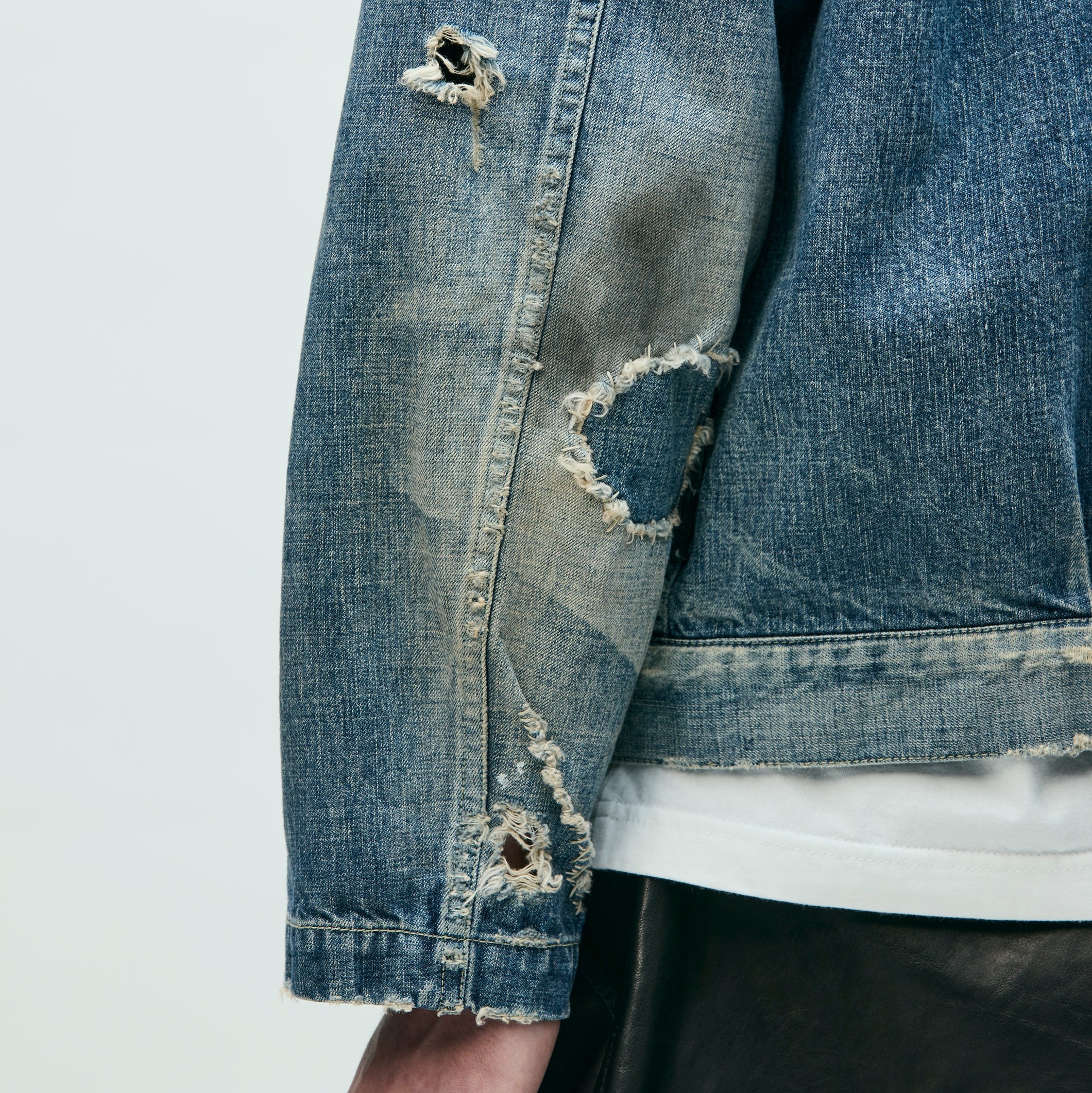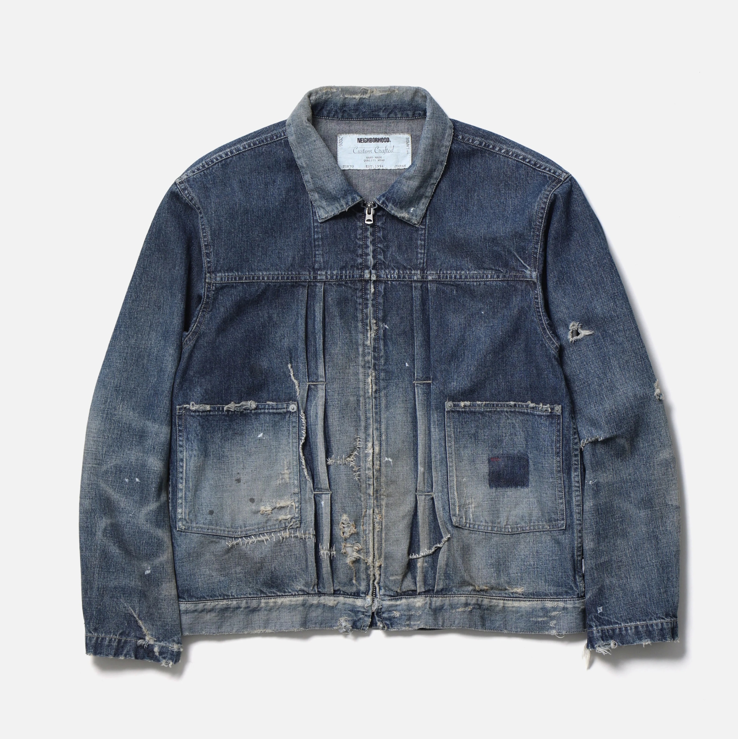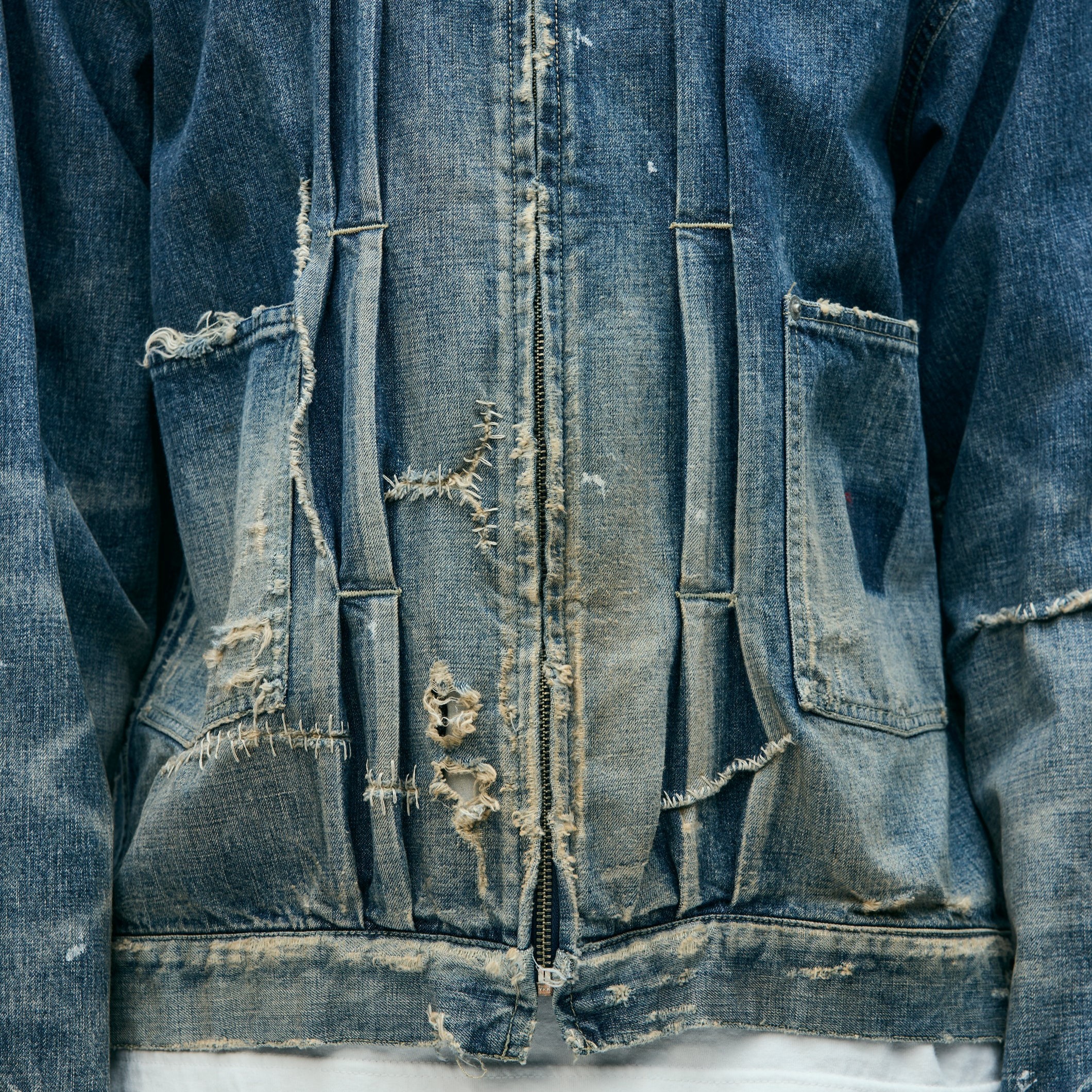 オリジナルの11ozデニム生地を使用したジップタイプのサベージデニムジャケット。手かがりリメイクや裏当て、各所ダメージ、ペンキ汚しなどの複合加工を施しリアルな経年変化を再現。オリジナルのジッパープル、リベットを採用。カスタムクラフテッドアイテム専用のサイズネームを配置。脇接ぎにピスネームを付属。MODEL:186cm / SIZE:L