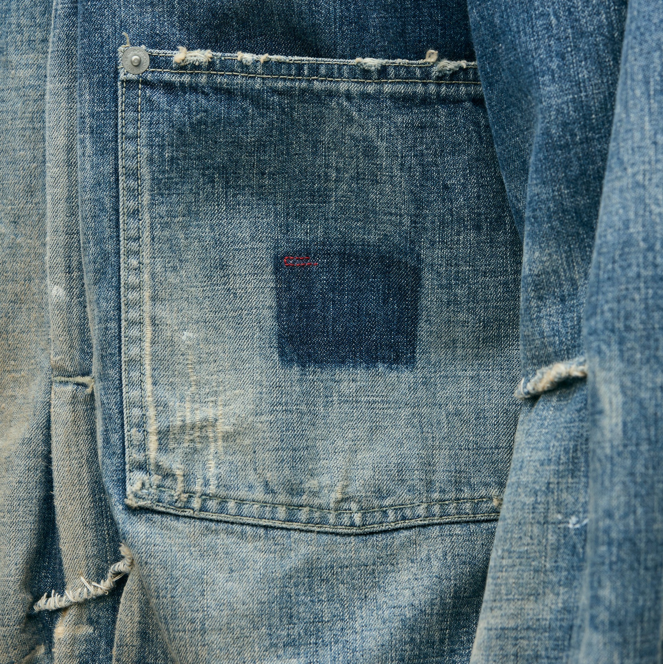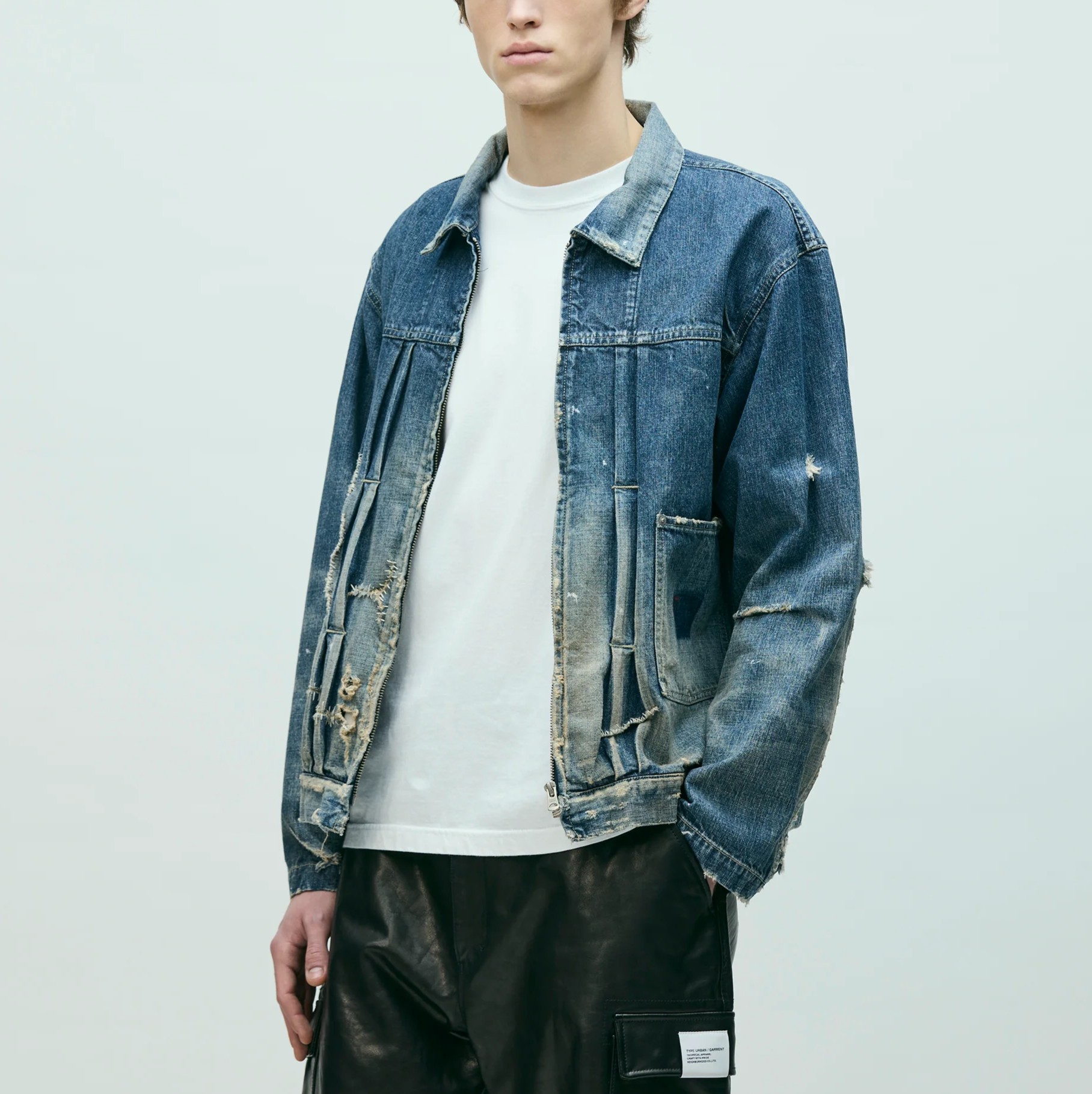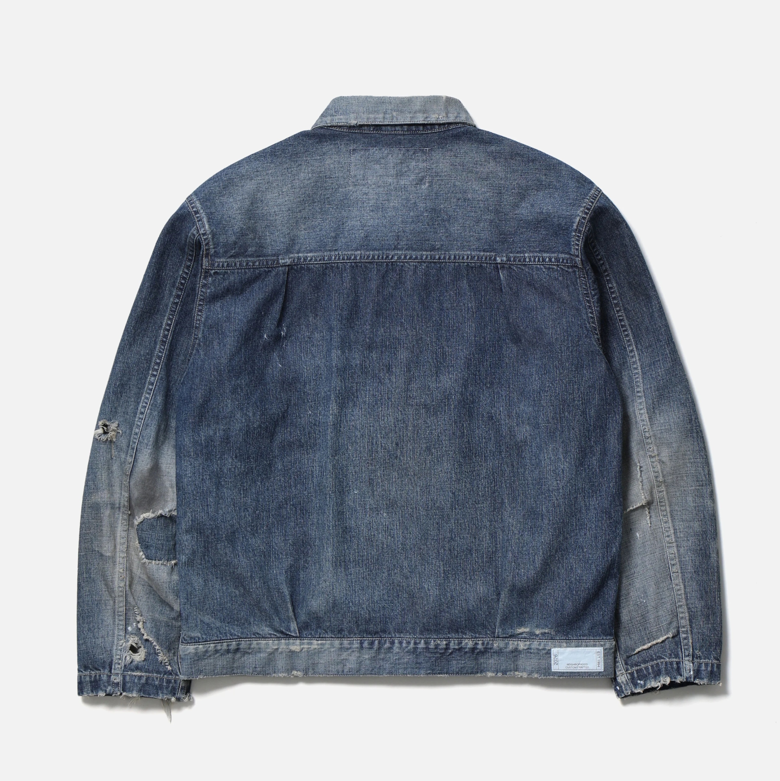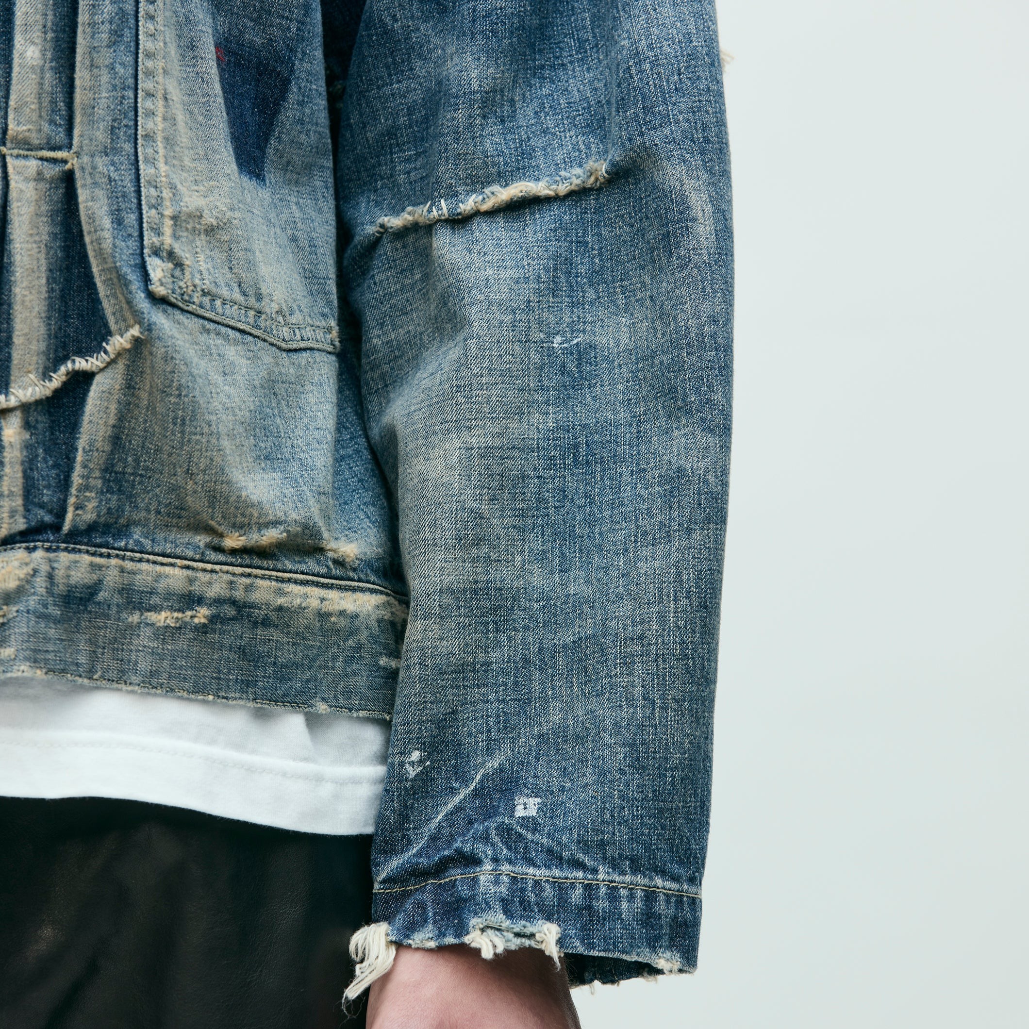 オリジナルの11ozデニム生地を使用したジップタイプのサベージデニムジャケット。手かがりリメイクや裏当て、各所ダメージ、ペンキ汚しなどの複合加工を施しリアルな経年変化を再現。オリジナルのジッパープル、リベットを採用。カスタムクラフテッドアイテム専用のサイズネームを配置。脇接ぎにピスネームを付属。MODEL:186cm / SIZE:L