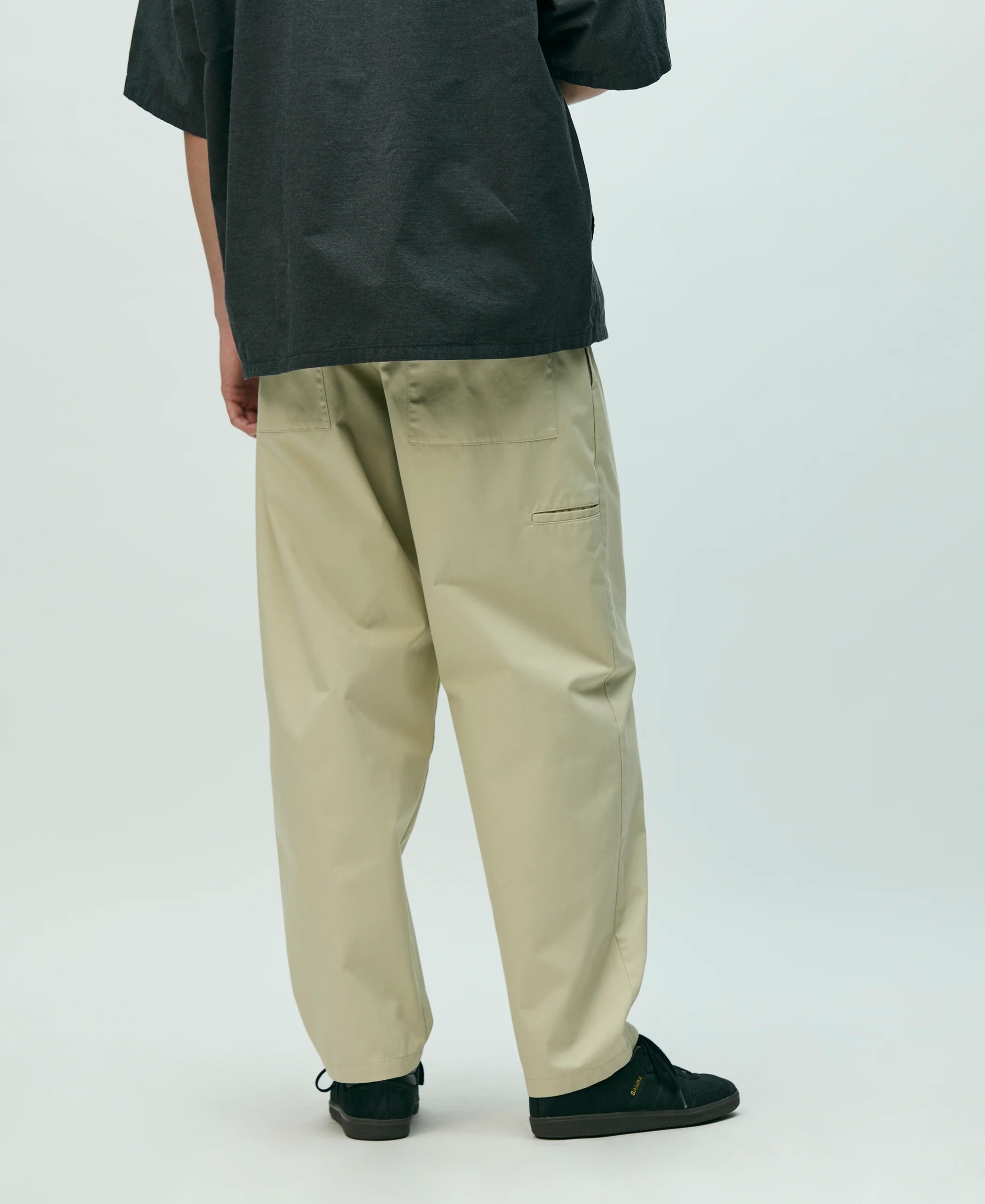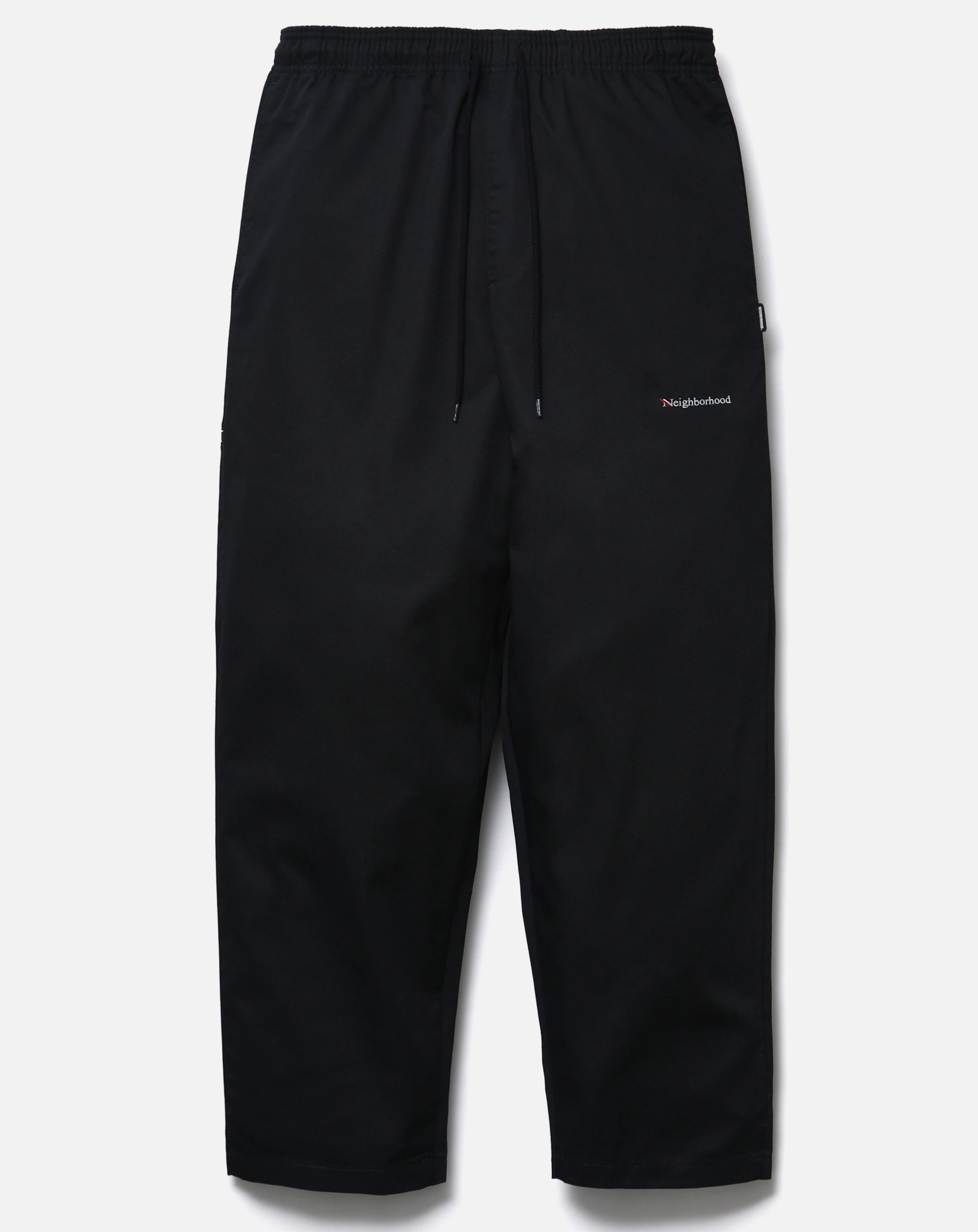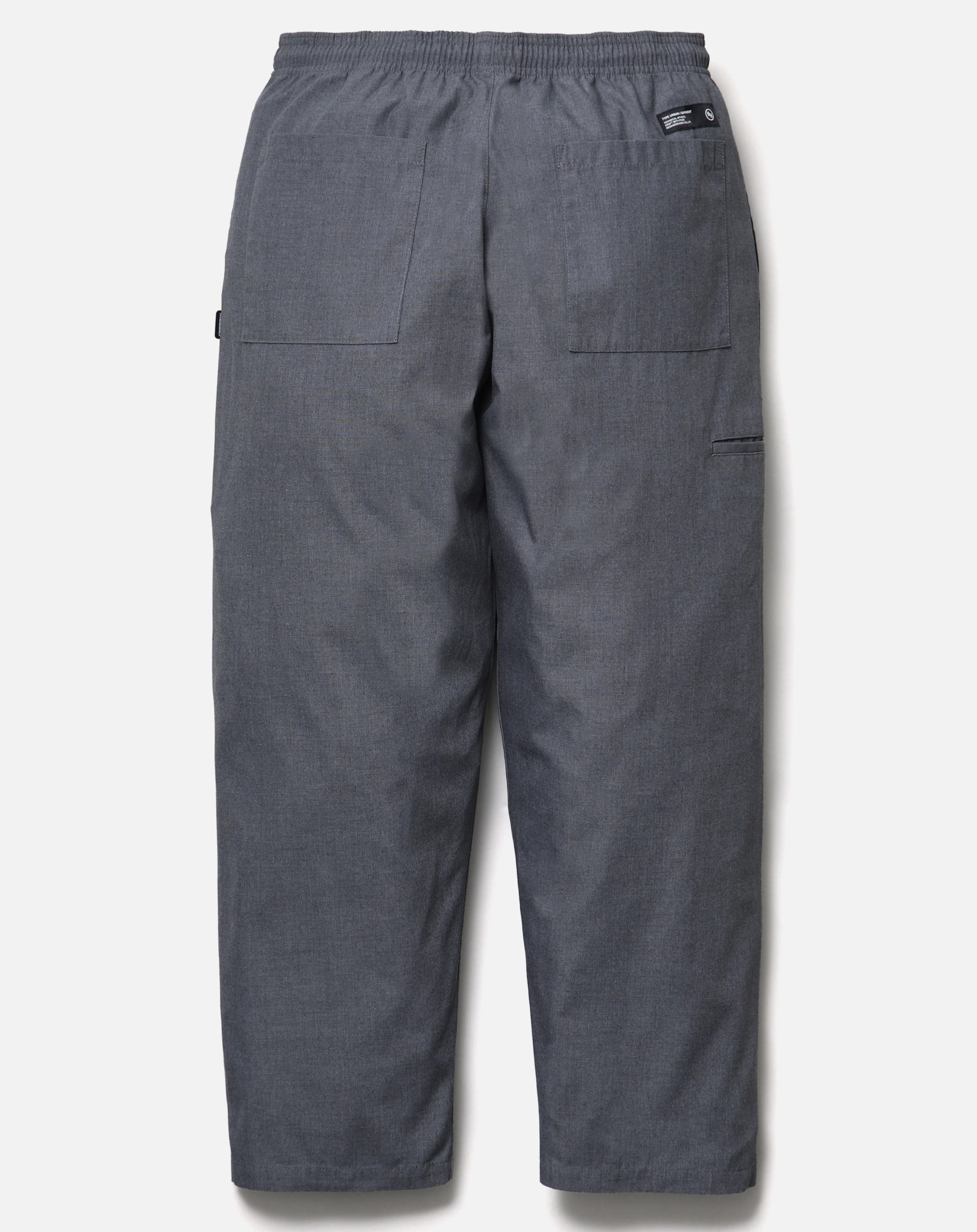 コットン/ポリエステル混紡の中肉厚ツイル素材を使用したイージーパンツ。ゴム入りウエストにドローコードを内蔵。左腿にロゴを刺繍。右脇にツールポケットを配置。バックポケット上部にブランドタグ、脇接ぎにピスネームを付属。ワンウォッシュ仕上げ。  MODEL:186cm / SIZE:L