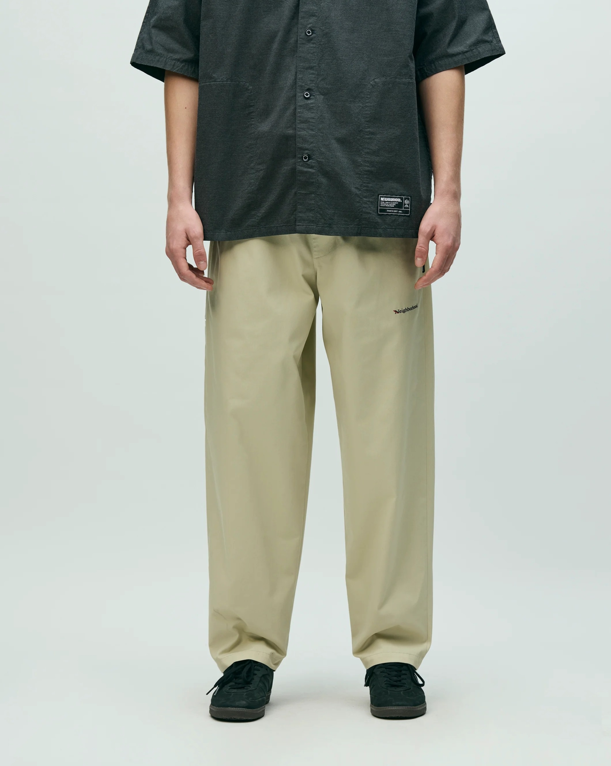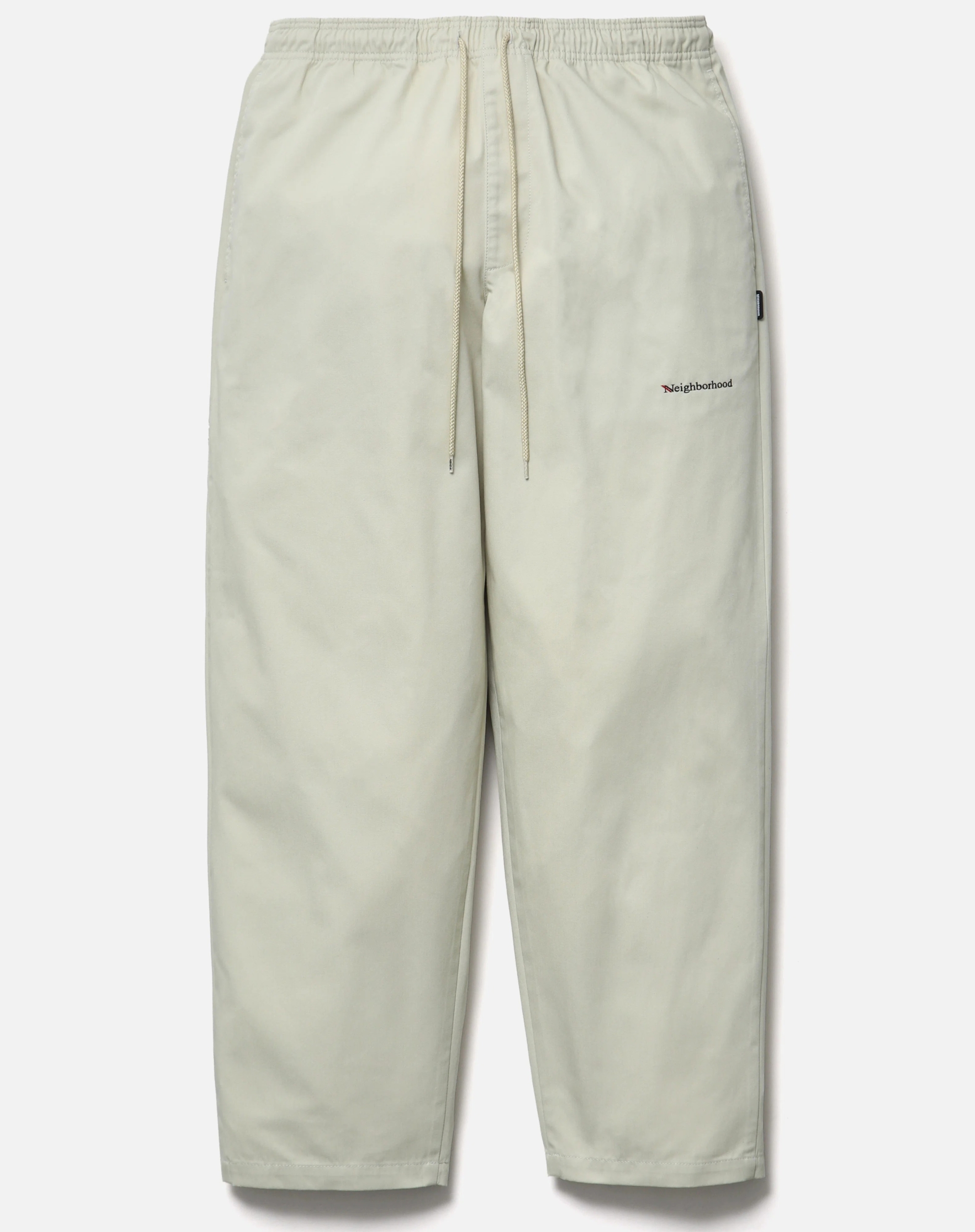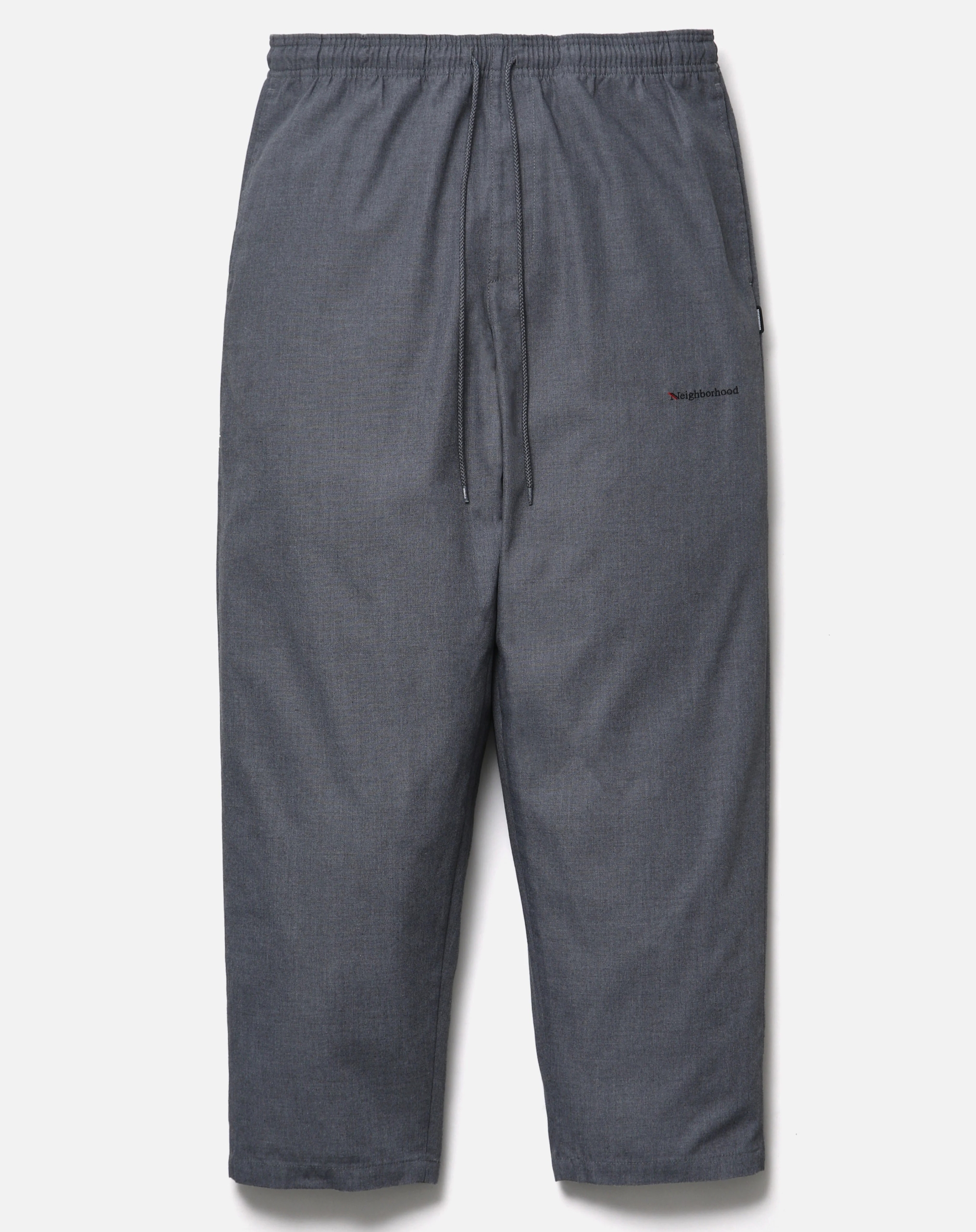 コットン/ポリエステル混紡の中肉厚ツイル素材を使用したイージーパンツ。ゴム入りウエストにドローコードを内蔵。左腿にロゴを刺繍。右脇にツールポケットを配置。バックポケット上部にブランドタグ、脇接ぎにピスネームを付属。ワンウォッシュ仕上げ。  MODEL:186cm / SIZE:L