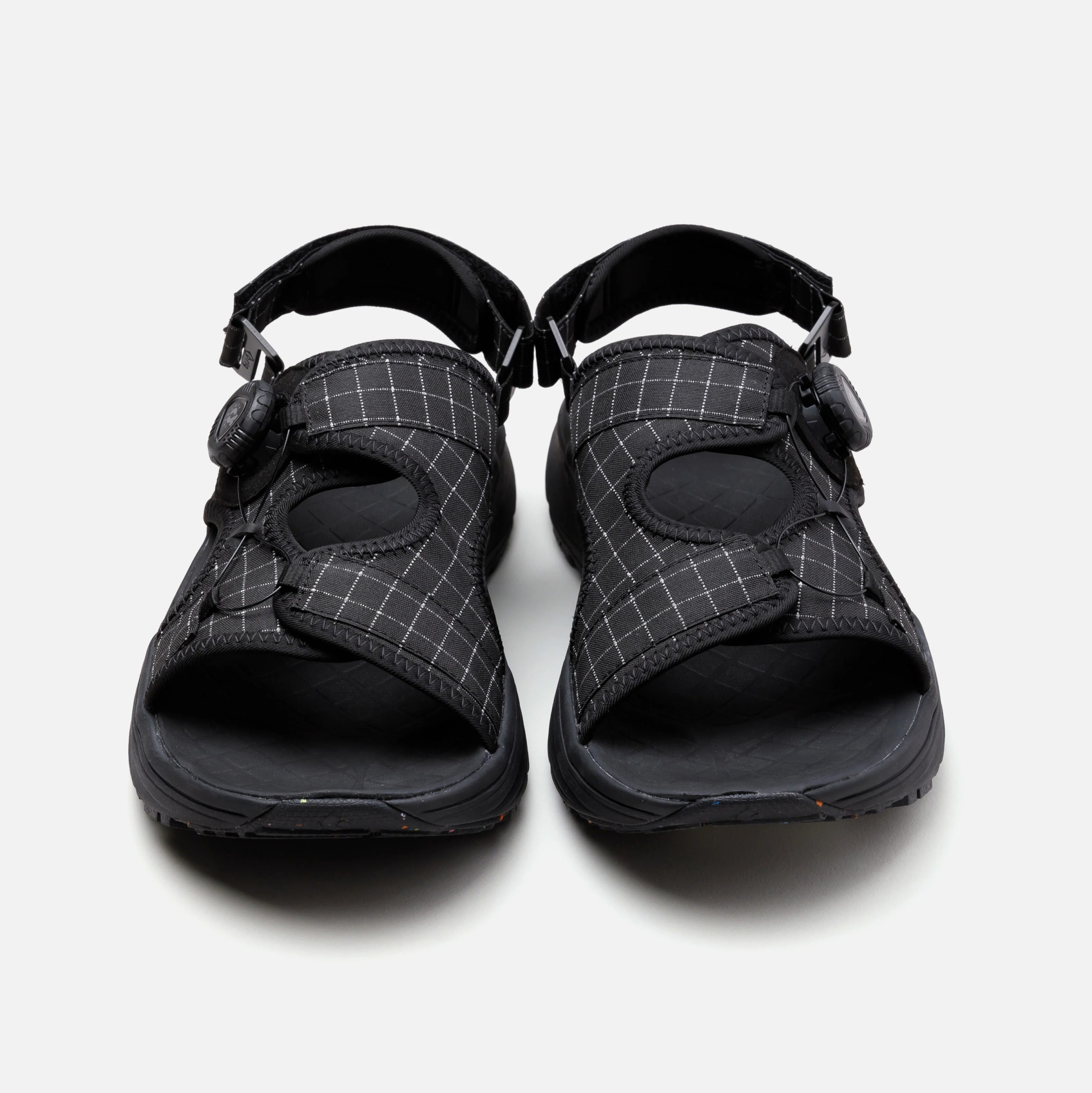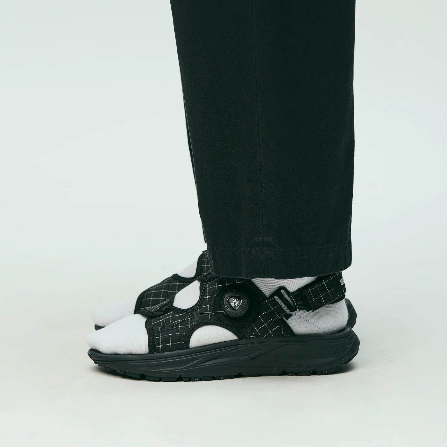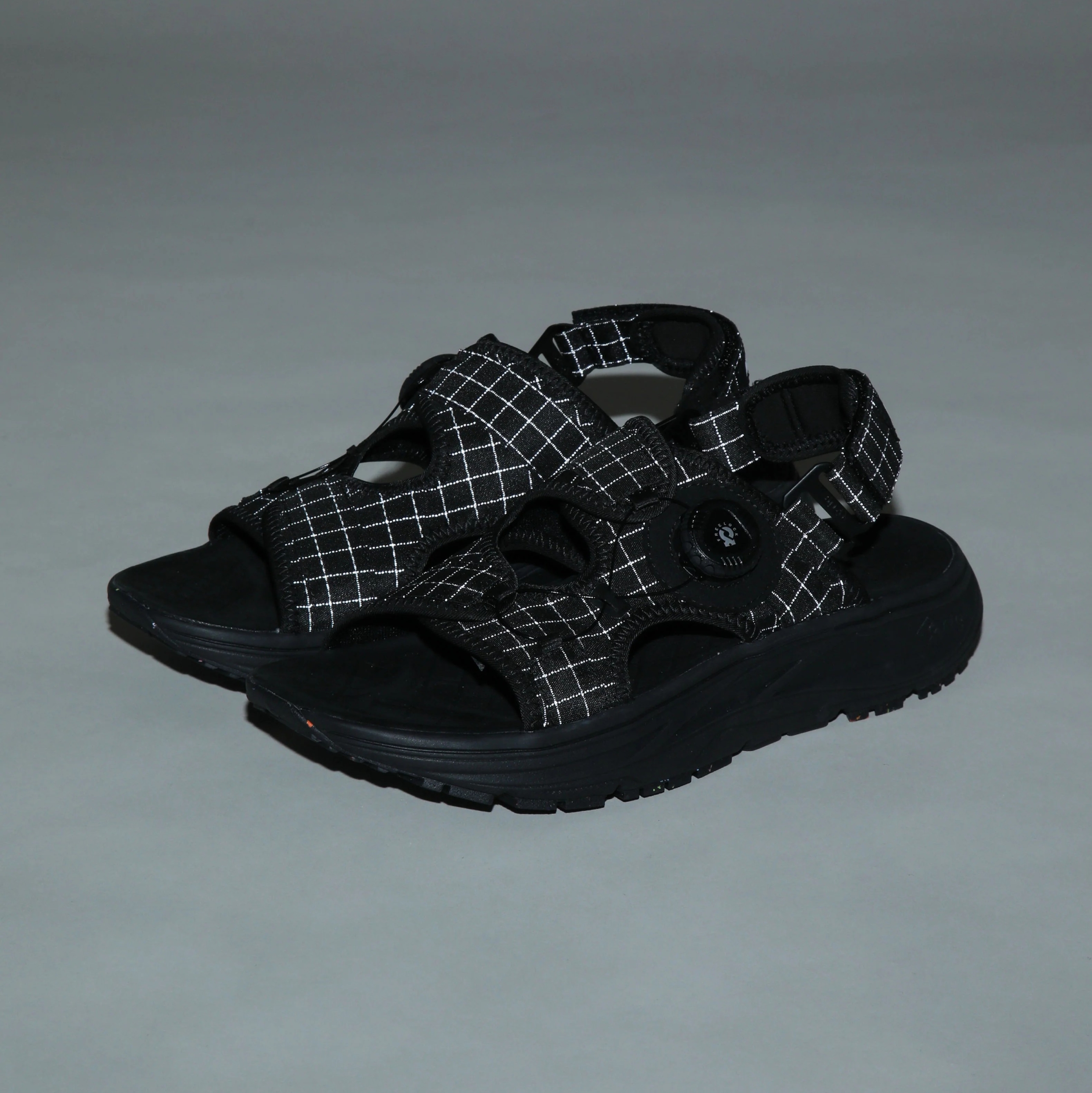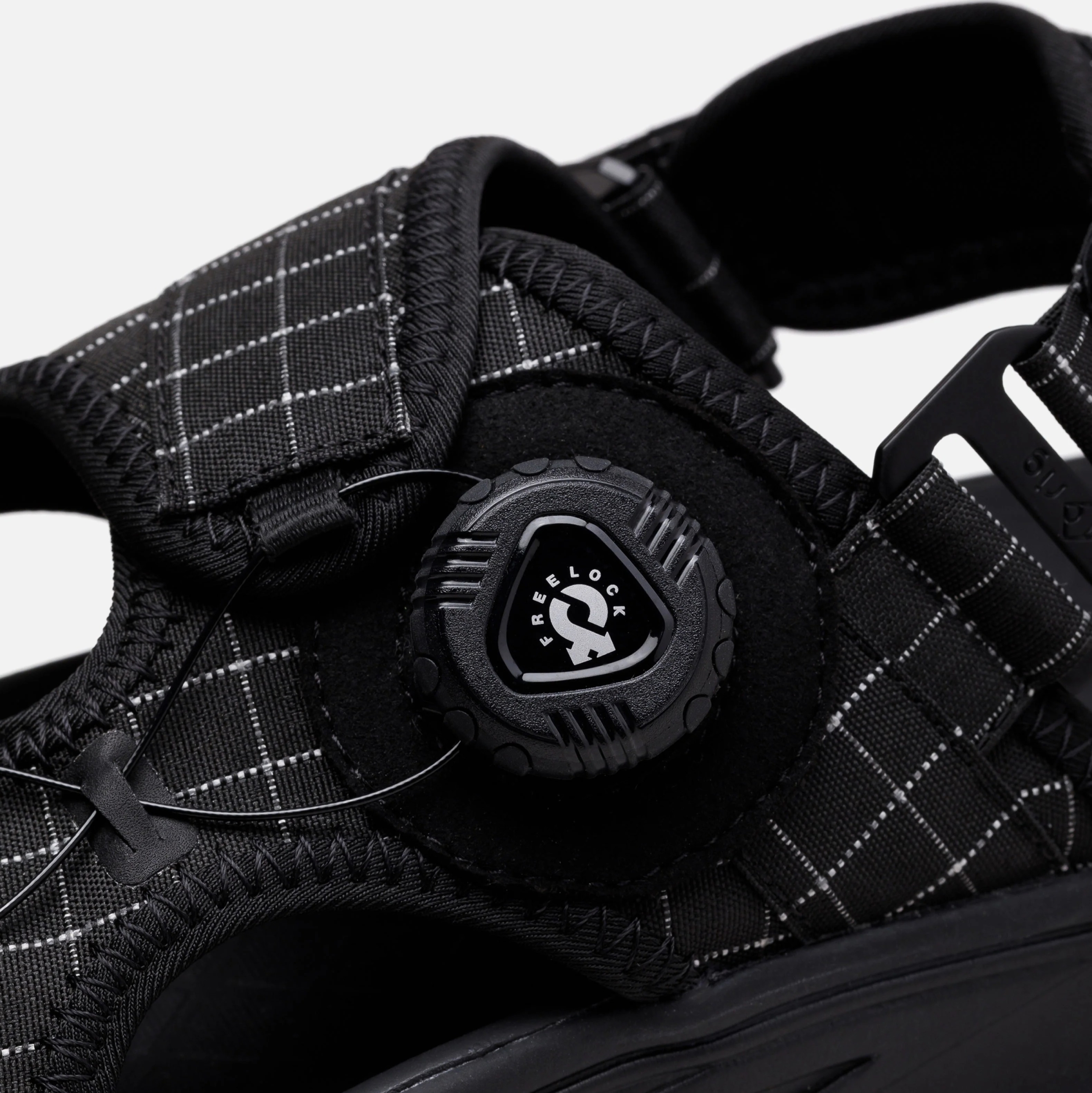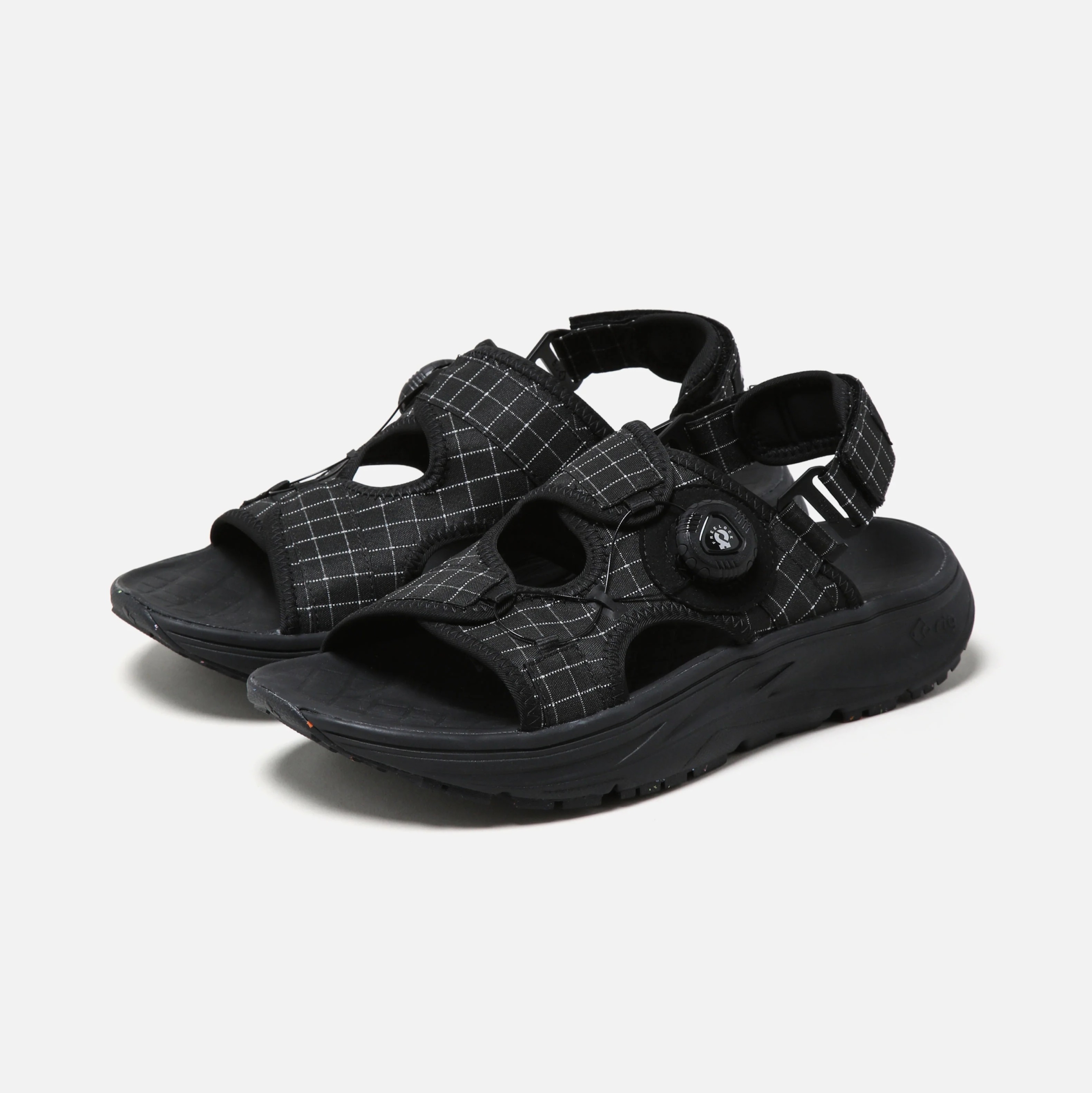 RIG FOOTWEAR "kuruka 2.0"をベースに、オリジナルのリフレクティブリップストップ素材を使用したリカバリーサンダル。リフレクター糸を使用した視認性の良さに加え、表面を撥水加工、裏面はアクリルコーティングを施すことで耐久性と撥水性、安全性を確保したオリジナルテキスタイル。アッパーは2枚の羽と調節用のFREELOCK DIAL SYSTEM(クイックダイヤル)を搭載することで、どんな足型にもフィットし、動きの多いシーンでも足への負荷を低減。硬質サンダルよりもクッション性の高いEVA-RUBBER製を採用しており、優れた衝撃吸収性が足腰への負担を軽減することで疲労回復を促進。