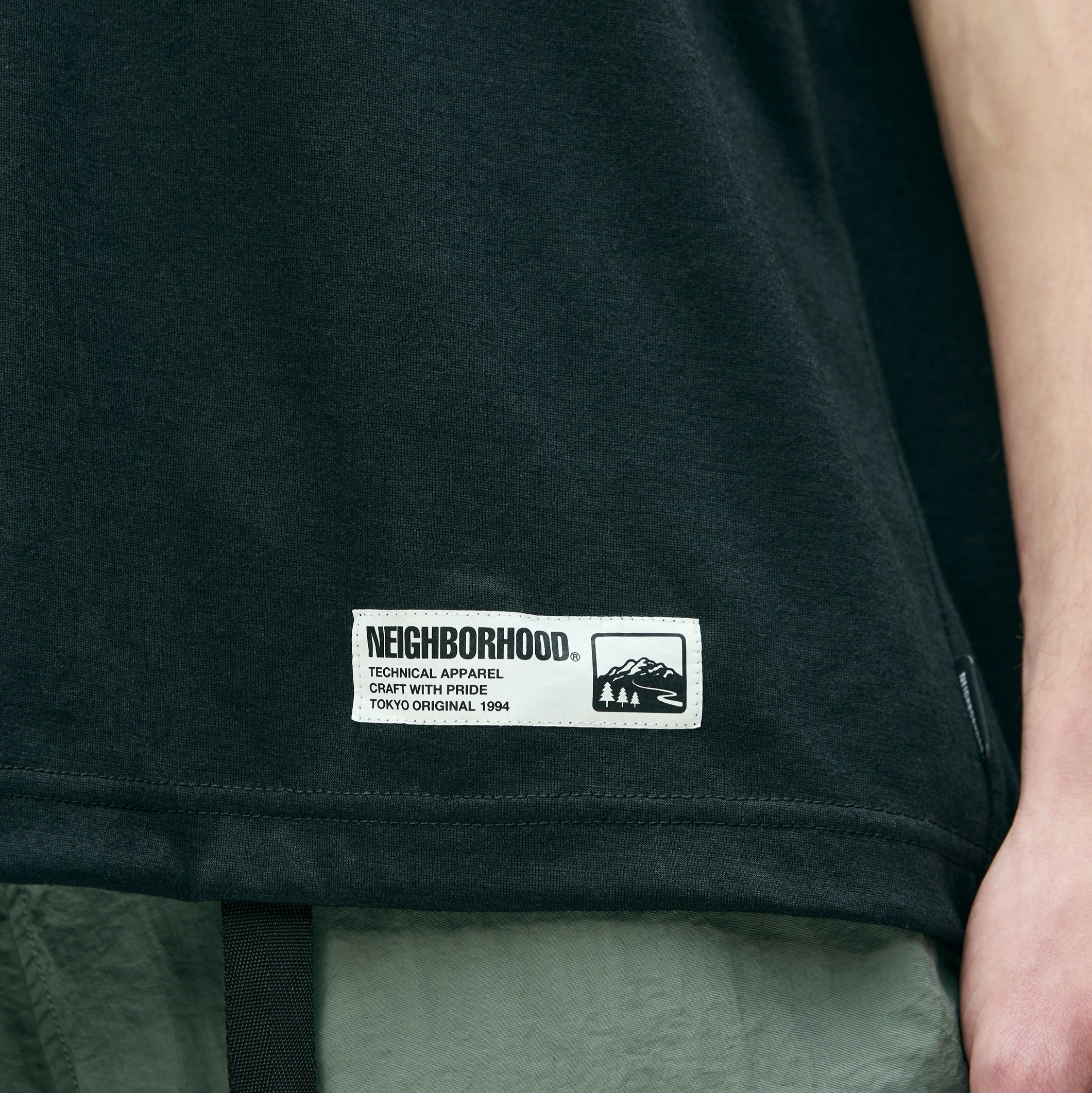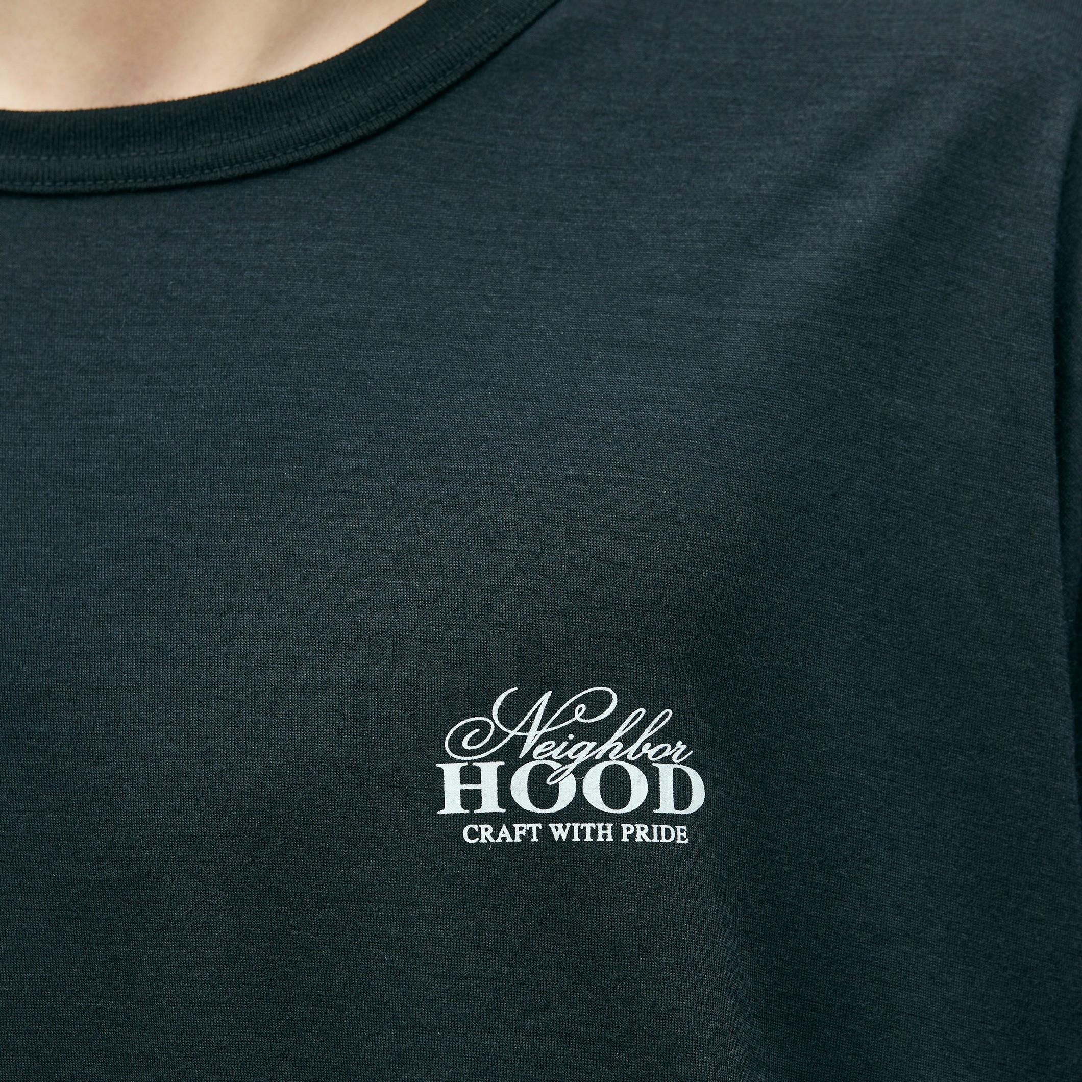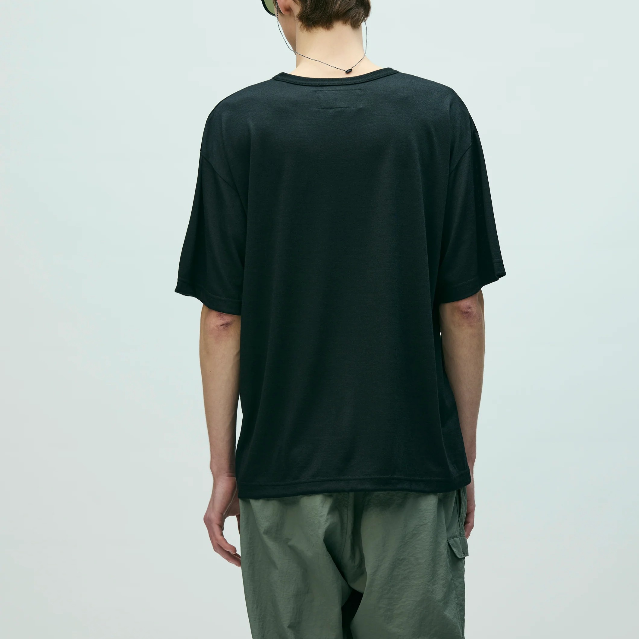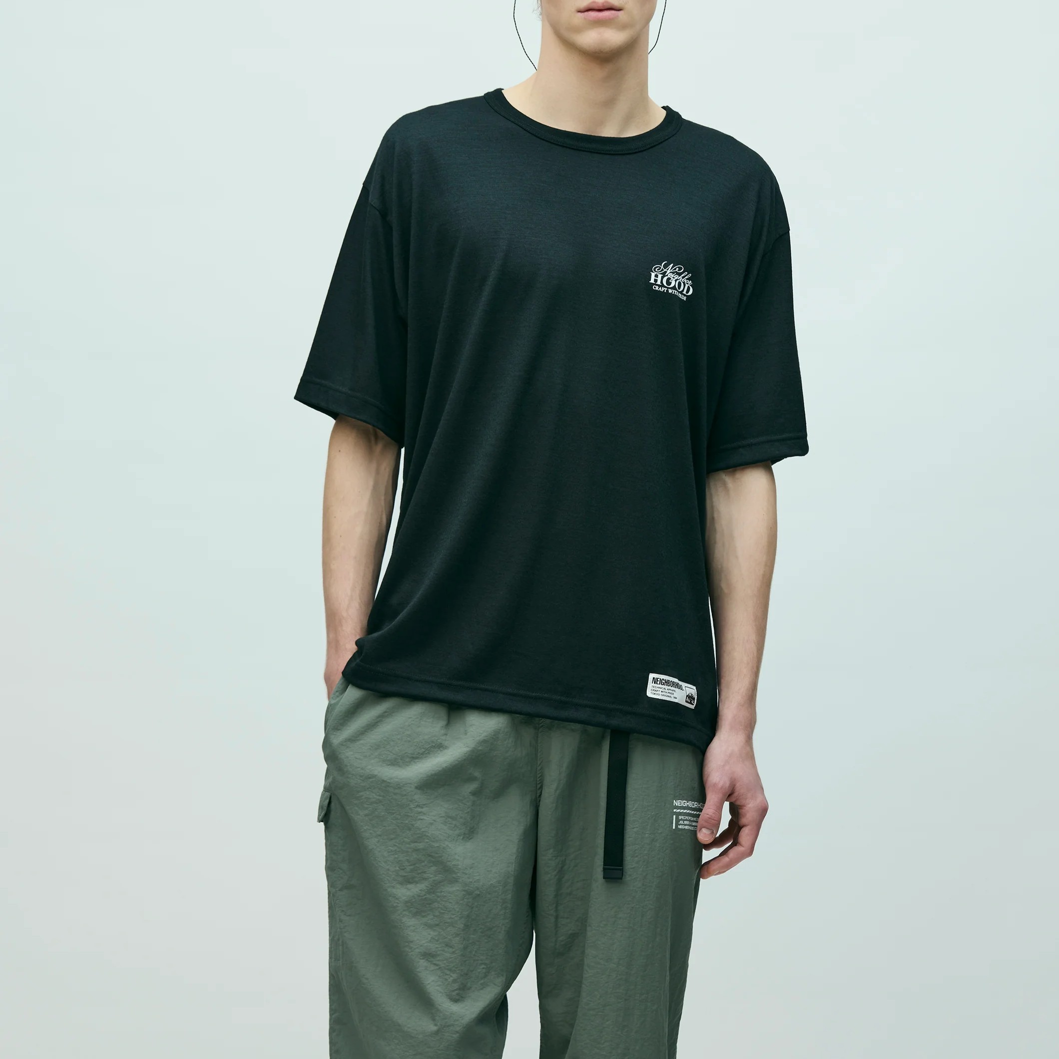 トレイルランやアドベンチャーレースなど、過酷な環境下で求められる、ドライ感・吸湿速乾性・消臭性を高い水準で保持可能なNIKKE AXIO®繊維を使用した半袖のクルーネックカットソー。左胸にロゴをプリント。左裾にブランドタグ、脇接ぎにピスネームを付属。WOOL 53%, POLYESTER 47% MODEL:186cm / SIZE:L