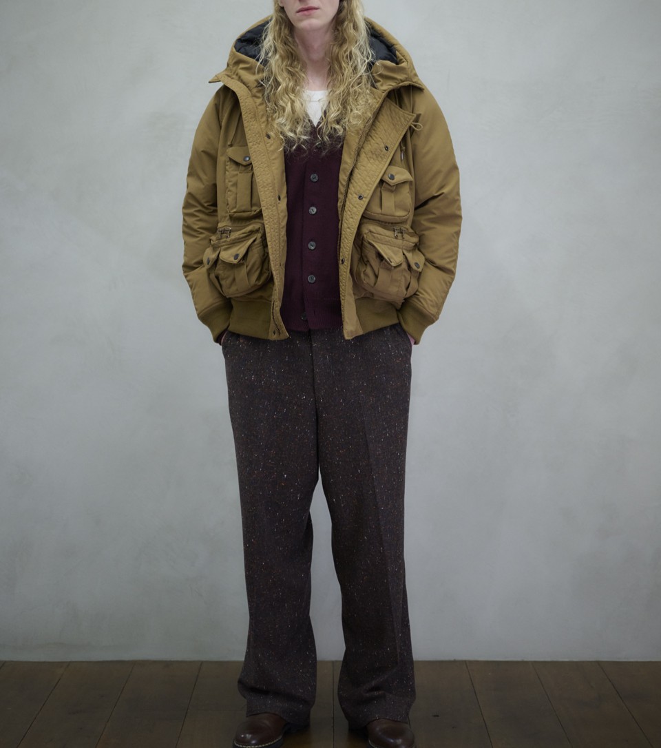 表地(NYLON):タテ糸にナイロンフルダル糸、ヨコ糸にタスランナイロン糸を使ったナイロンタッサーです。 フルダル糸を使用することによりマットな表面感に仕上がっており、タスラン糸を使用し綿タッチな風合いを表現しております。また耐久撥水加工されているため撥水効果が長く継続しますし着古せば着古すほど体になじんでいく為、 長く着られる素材です。