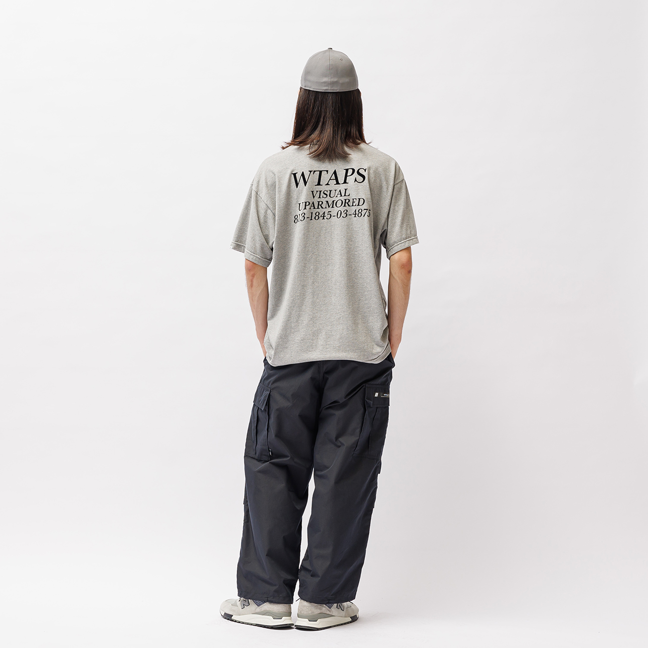 反毛コットン/リサイクルポリエステル混紡の生地を使用し、ウォッシュ加工したTシャツ。バックにフロッキープリントのモチーフを配置。MODEL : 180cm / 02(M)