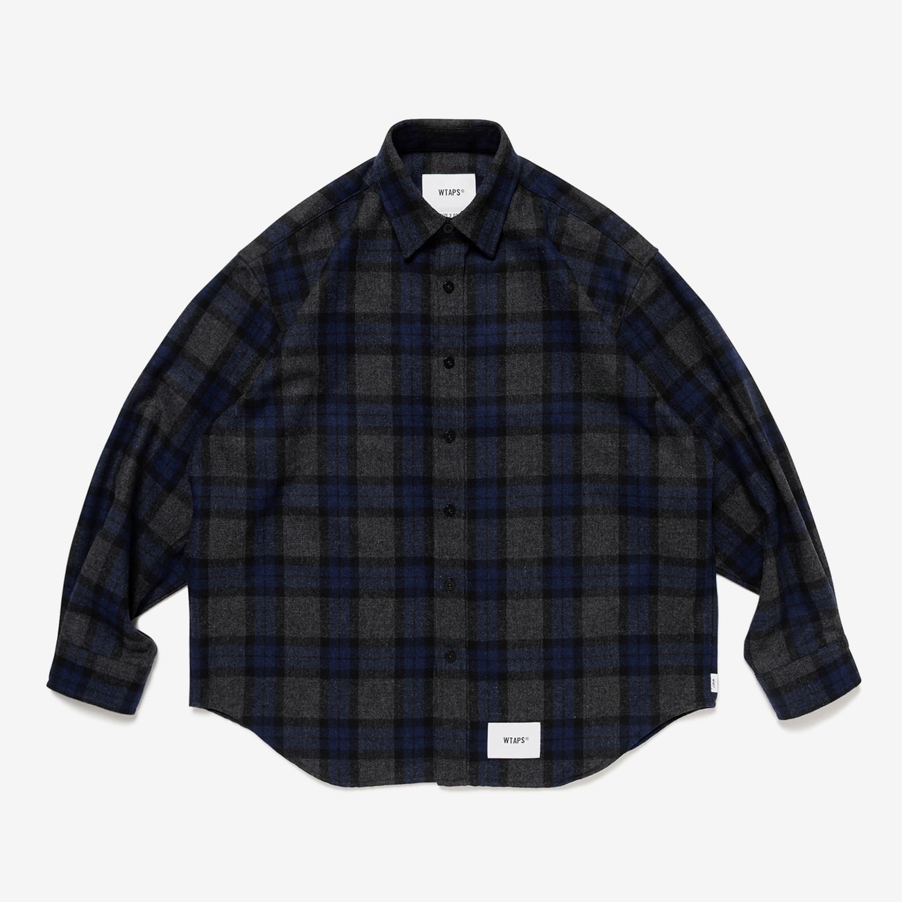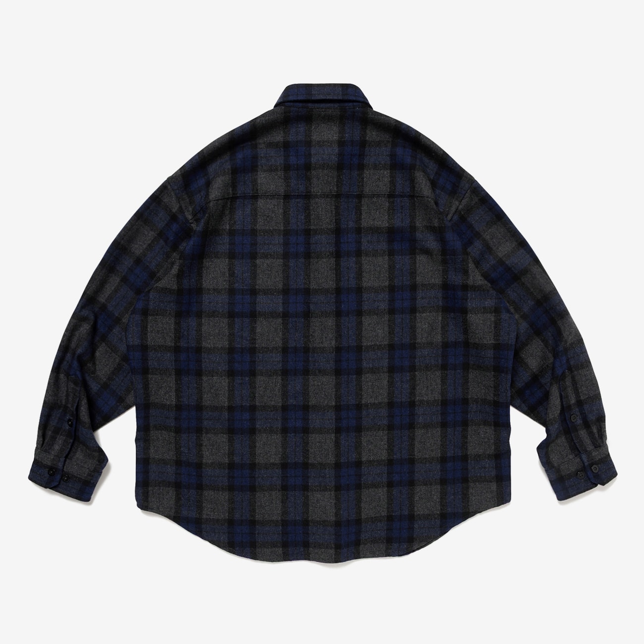 反毛リサイクルウール生地を使用したチェックシャツ。緩やかなラウンドカットで、シルエットが特徴的なオーバーフィットモデル。MODEL:178cm / SIZE:L (03)