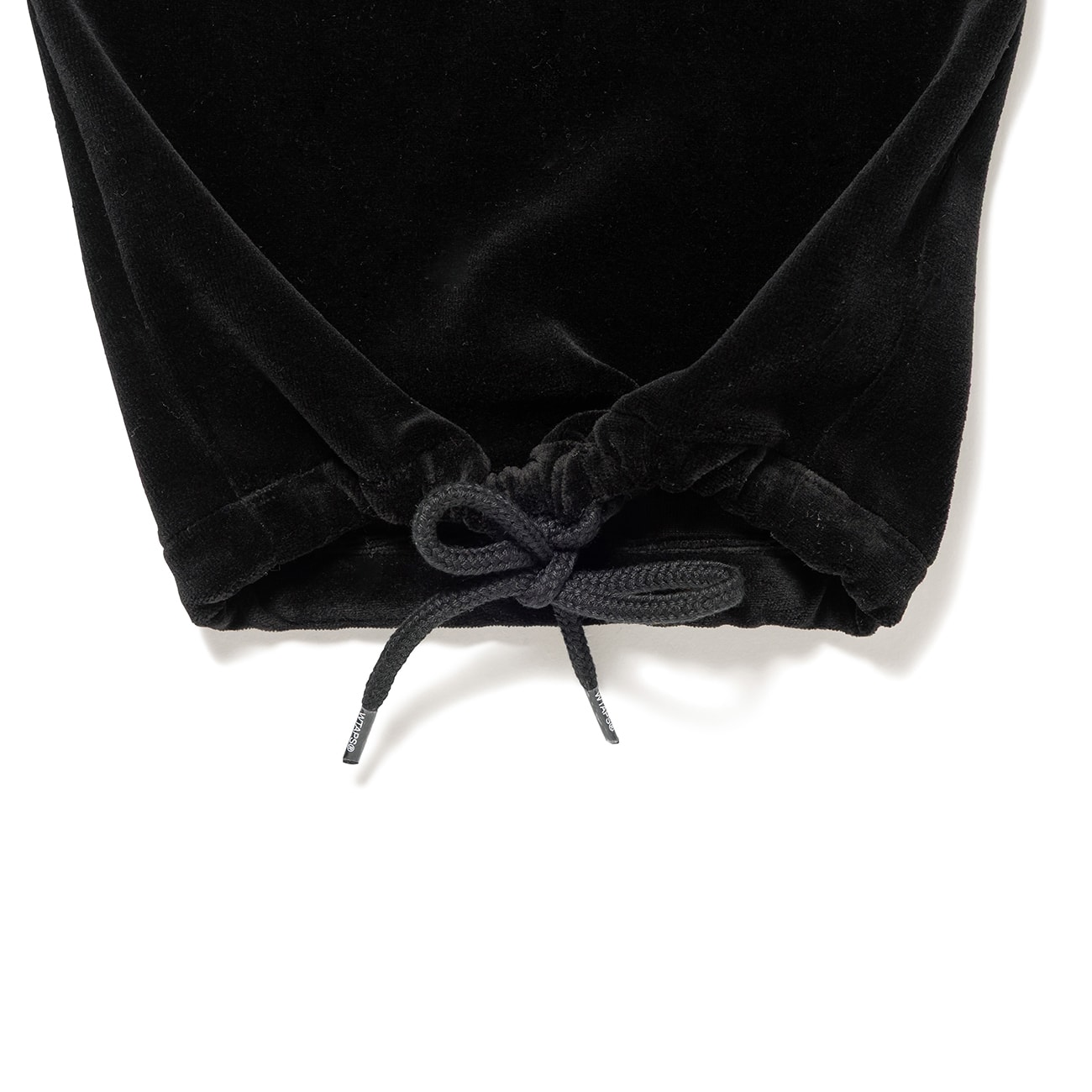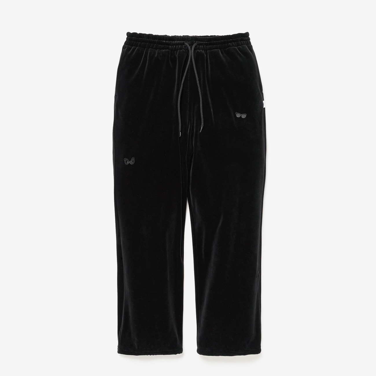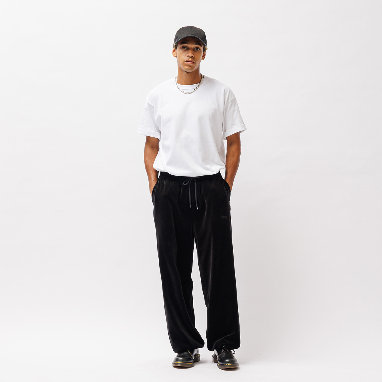 コシのあるベロア生地を使用したトラックパンツ。ウエストは内蔵したエラスティックとスピンドルシステムで、裾はスピンドルシステムで調節可能。全面に刺繍モチーフを配置。MODEL:178cm/SIZE:L(03)