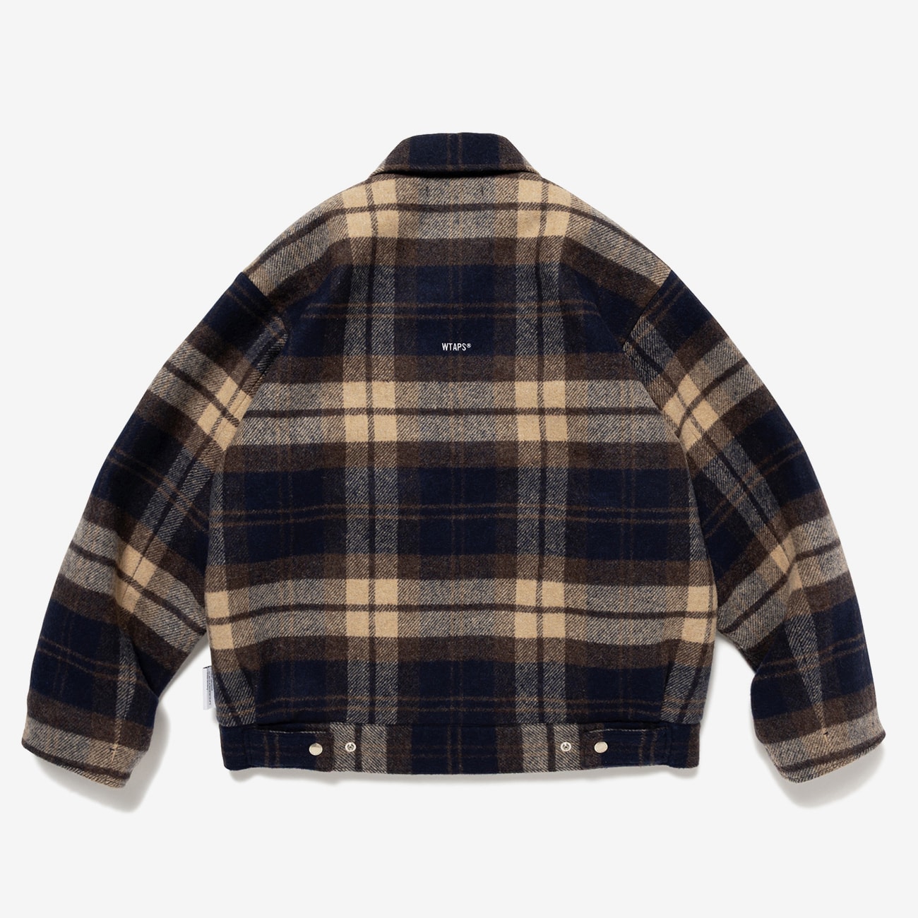 オリジナルブラックウォッチのダブルフェイスメルトン生地を使用したジップアップジャケット。裏地にはリサイクル素材のECOUSEを使用したキルティング仕立て。袖口は内側にリブを配して、防寒性を高めた。バックに刺繍モチーフを配置。MODEL:182cm / SIZE:L (03)