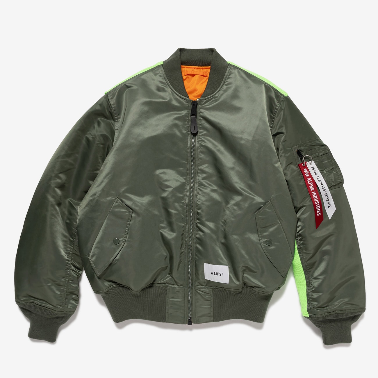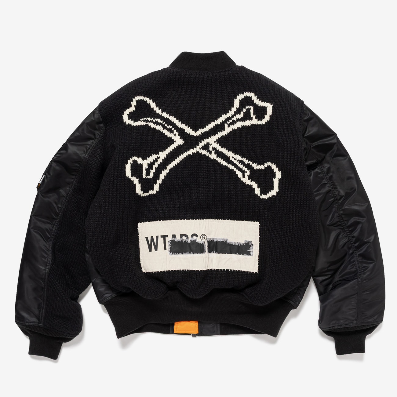 US規格のALPHA INDUSTRIESによるMA-1をベースに、WTAPSオリジナルシルエットに再構築。 後身頃と左内袖をニットで切り替え、クロスボーンモチーフを配置したスペシャルモデル。 両ブランドのディテールを盛り込み、BLACKとOLIVE DRABの2色展開で販売。