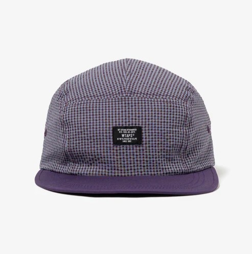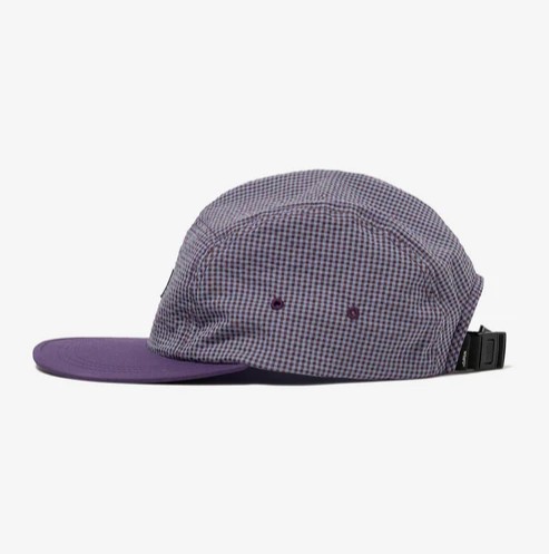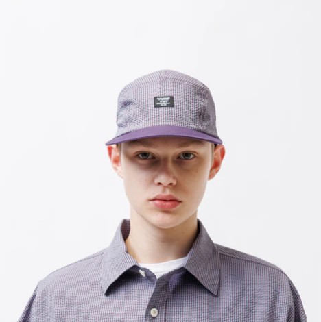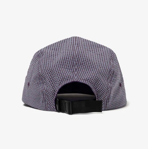 バイザーにコットンのタイプライター生地、クラウンにコットン/ポリエステル混紡のサッカーチェック生地を使用した、バイカラー仕様の5パネルキャンプキャップ。フロントにブランドネーム、バックにピスネームを配置。杉綾テープのアジャスターで調節可能。