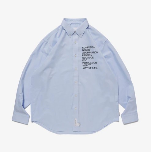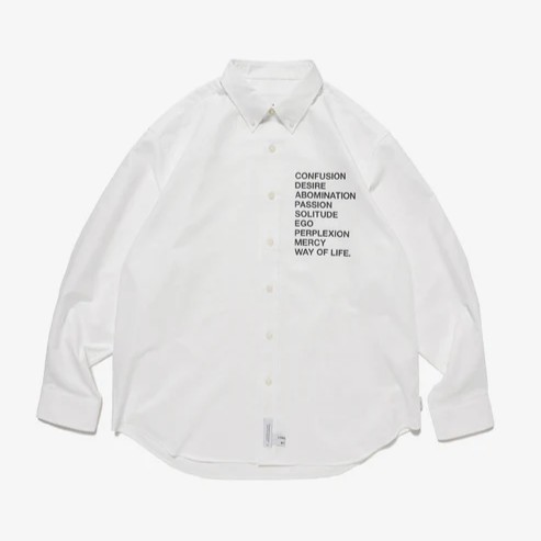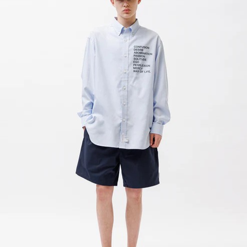 形態安定加工を施したコットン/ポリエステル混紡のオックスフォードボタンダウンシャツ。緩やかなラウンドカットで、すっきりとしたレギュラーフィットモデル。フロントにプリントモチーフ配置。MODEL:178cm / SIZE:L